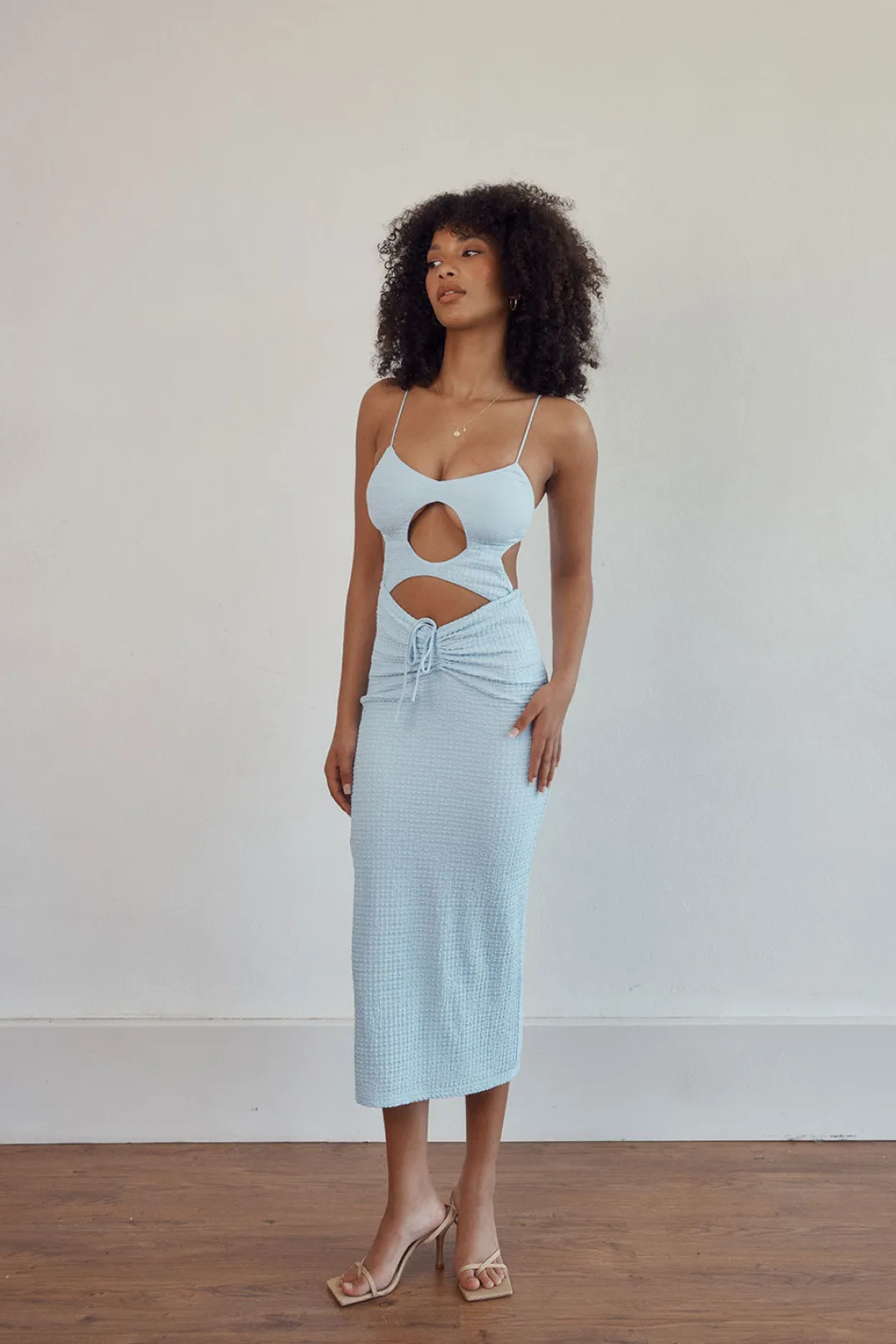 Show Off Your Curves With The Sutton Midi Dress, Made From A Textured Bubble Fabric In A Sky Blue Hue. It Is A Fitted Midi Style Featuring Thin Rouleau Straps, An Open Back With Thin Strap Closure, Cutouts At Waist And Draw Detail At Centre Waist Of Skirt. Style With The Gabrielle Chain Earrings And Strappy Asteria Heels! Designed Exclusively By Sabo.