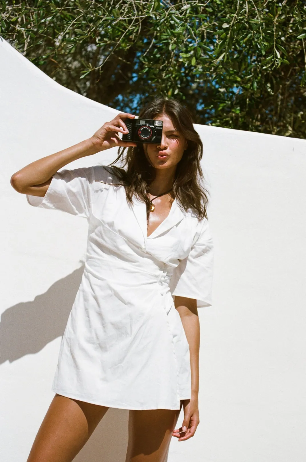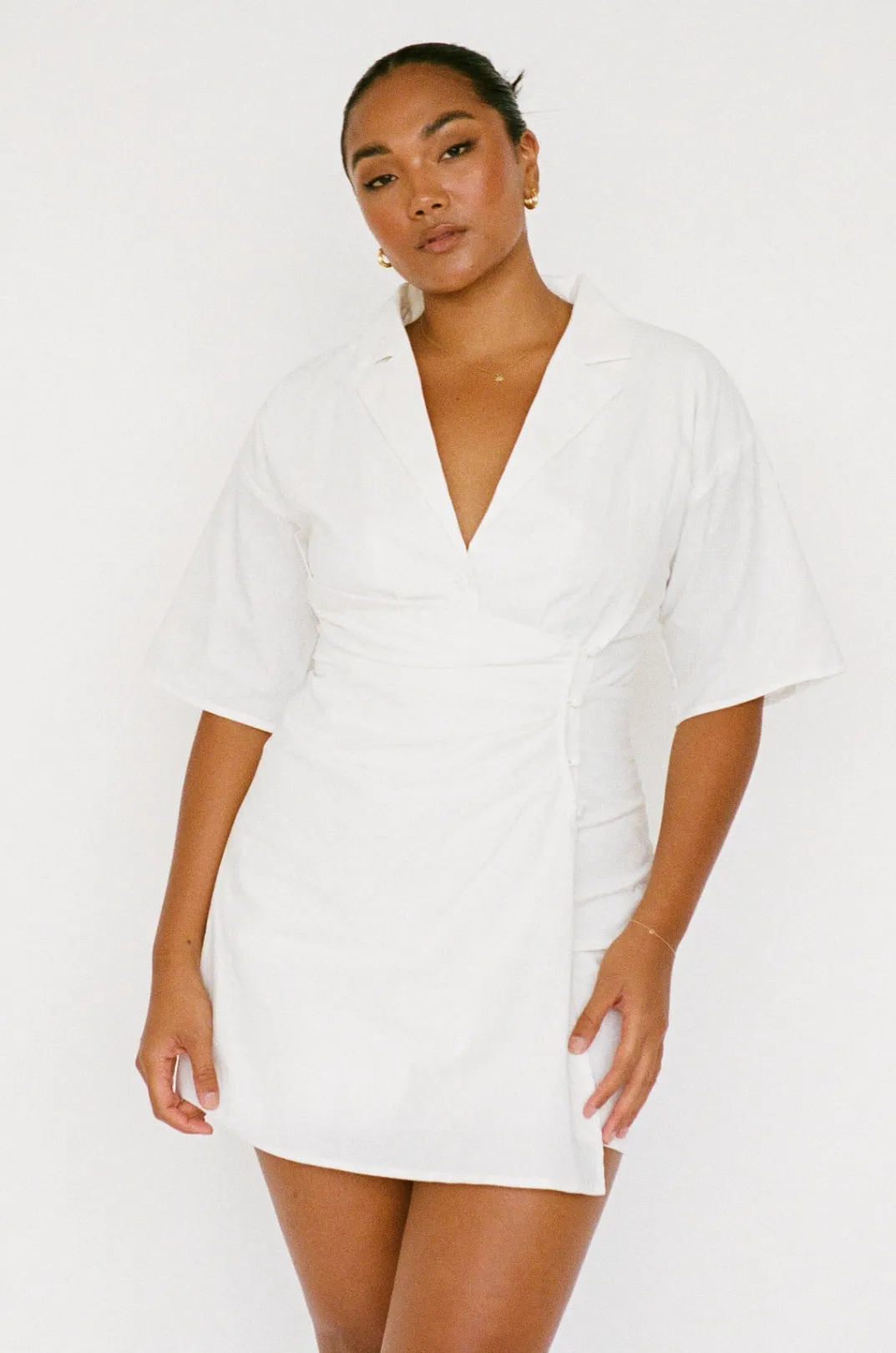 Dress It Up With Heels Or Keep It Casual With Slides! The Teodora Wrap Dress Is Made From A Structured Natural Cotton Linen Blend Fabric In White. It Features A Collar And Low Lapel And Wrap Front Skirt With Covered Button Closure Details. Designed Exclusively By Sabo.