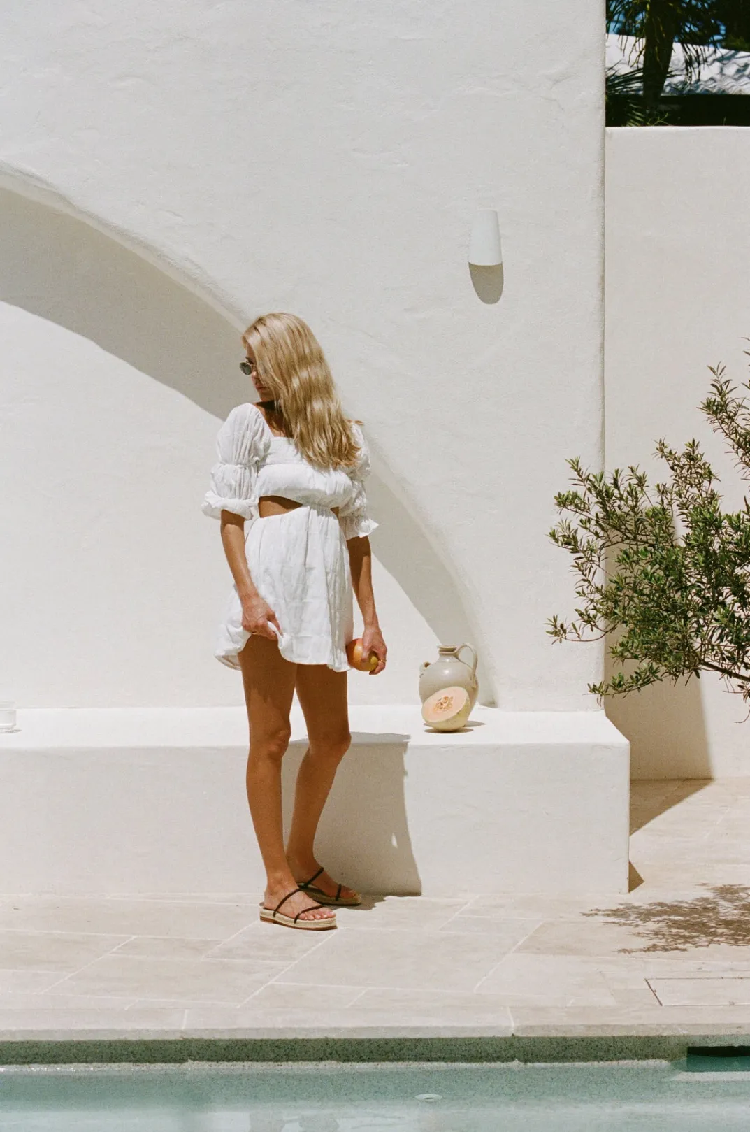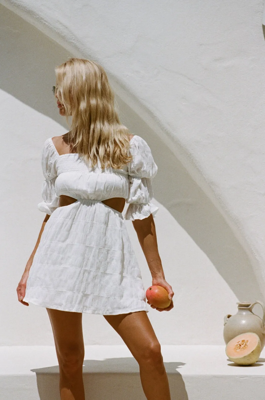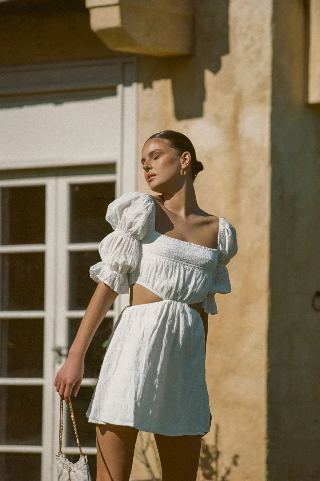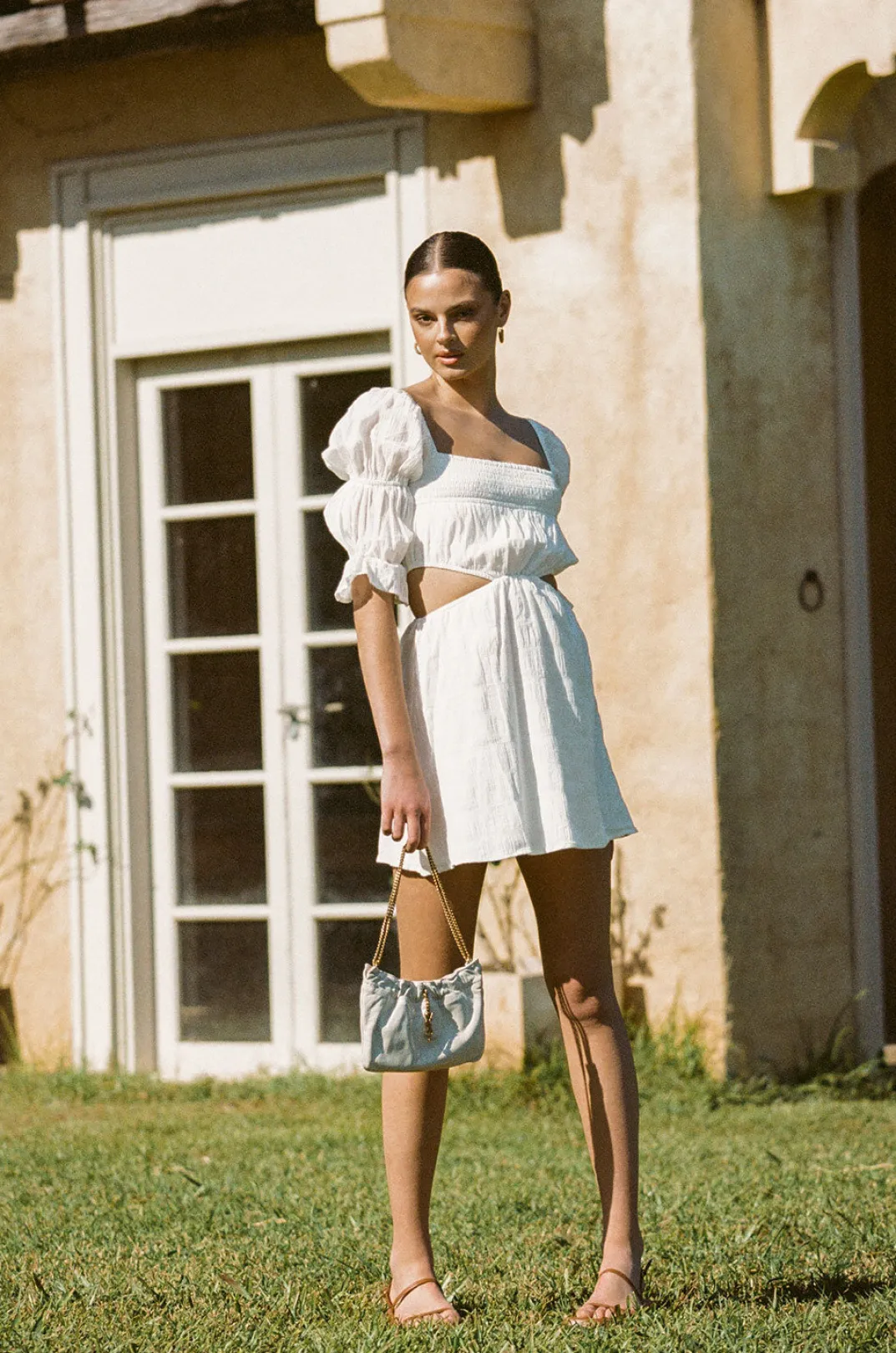 The Fun And Fresh Xena Cutout Dress Is Made From A Textured Natural Cotton Blend Fabric In White. It Features A Straight Neckline, Short Puff Sleeves With Frill Cuffs, Shirred Panel At Bust, Cutouts At Waist And A Flouncy Skirt. Pair With The Nude Zita Strappy Sandals And Riella Bag! Designed Exclusively By Sabo.