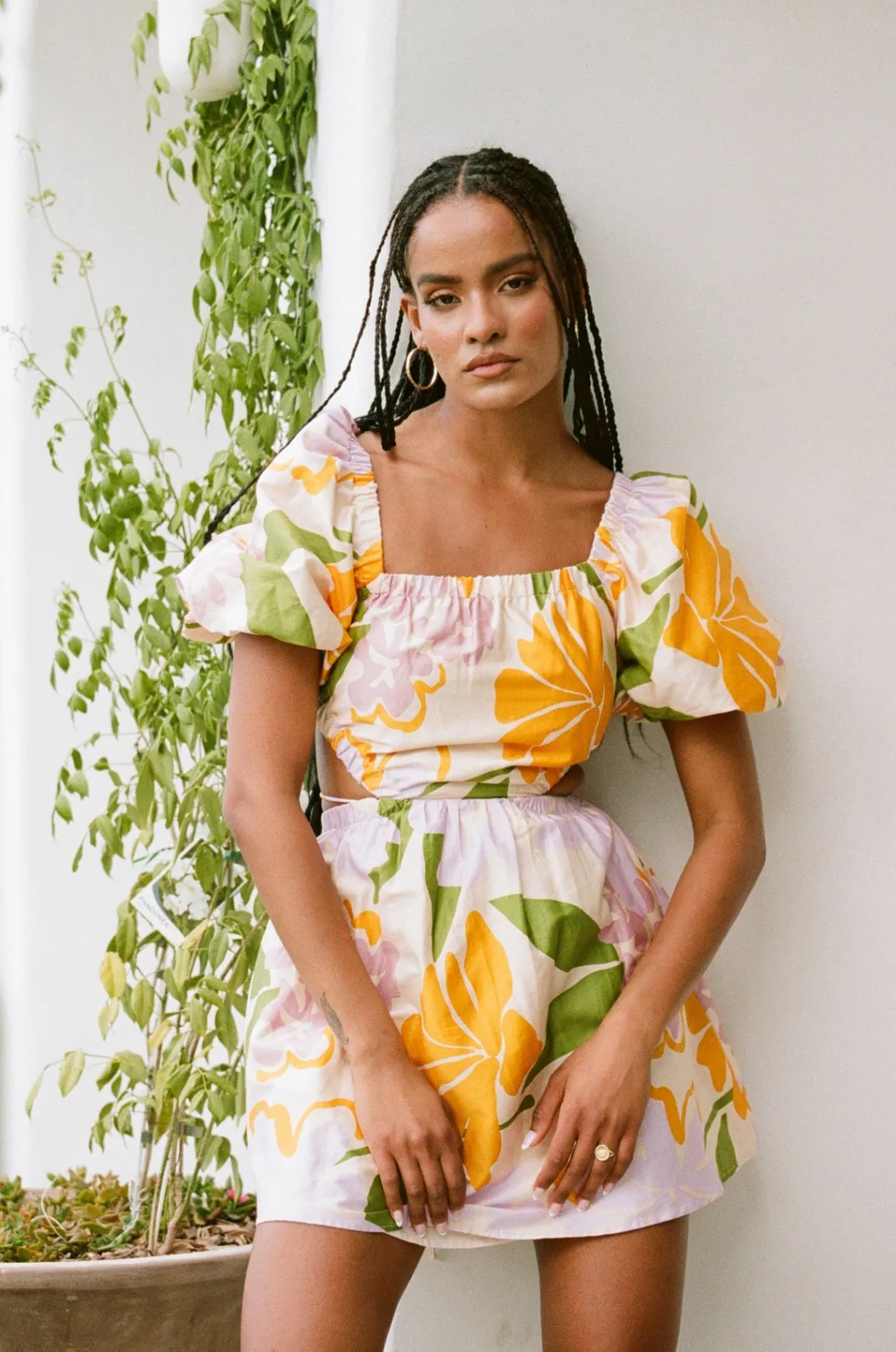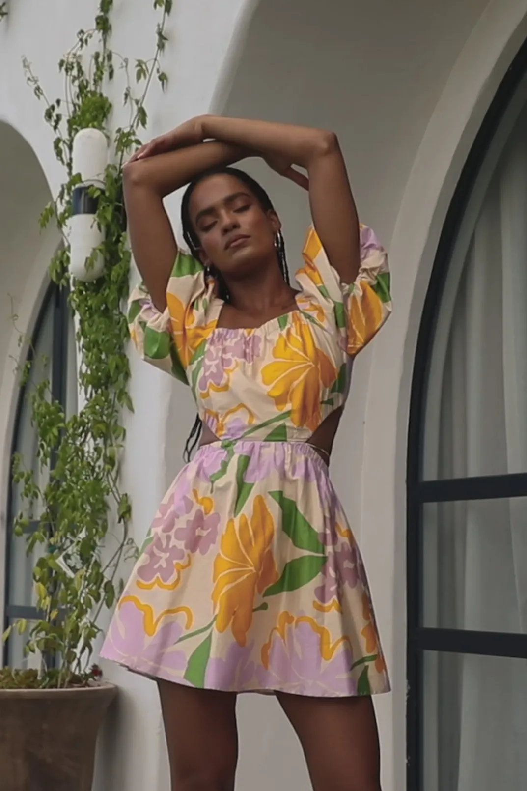 Our After Sunrise Collection Was Designed With Vacation Vibes At The Forefront! The Zandria Cutout Dress Is Made From A Luxurious Natural Cotton Poplin Fabric With Our Exclusive Lily Floral Print. It Features An Asymmetric Neckline, Puff Sleeves, Cutouts At Waist With Wrap Tie Detail And A Flouncy Skirt. Dress It Up With The Strappy Asteria Heels For Your Next Event! Designed Exclusively By Sabo.