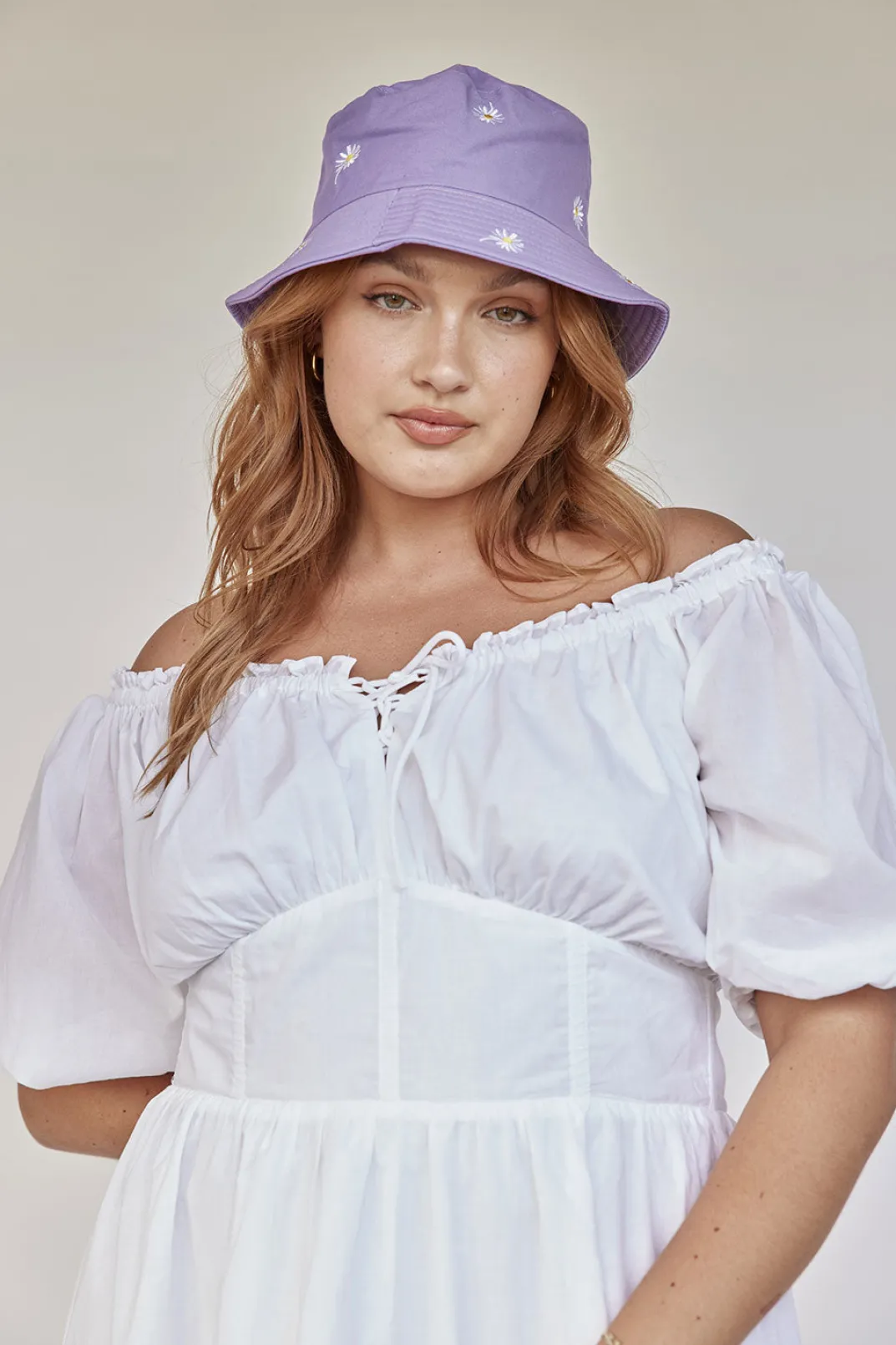 The Super Cute Daisy Hat Is A Purple Bucket Style Featuring Embroidered Flowers Throughout.