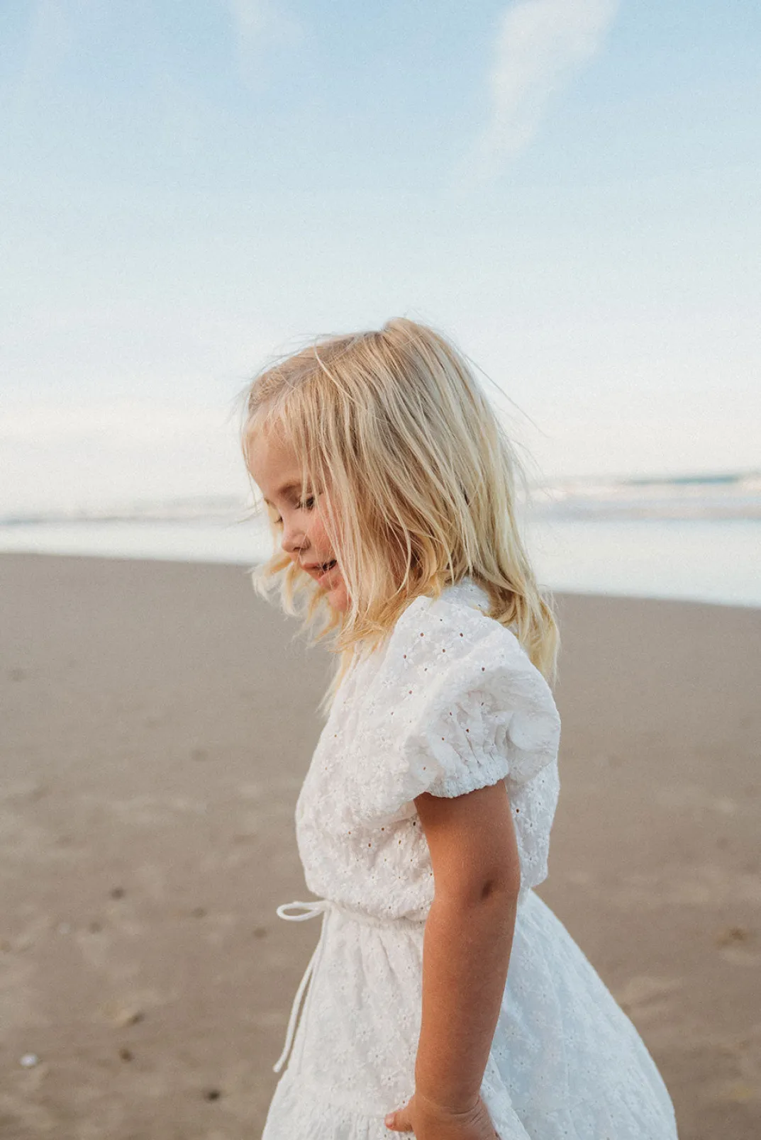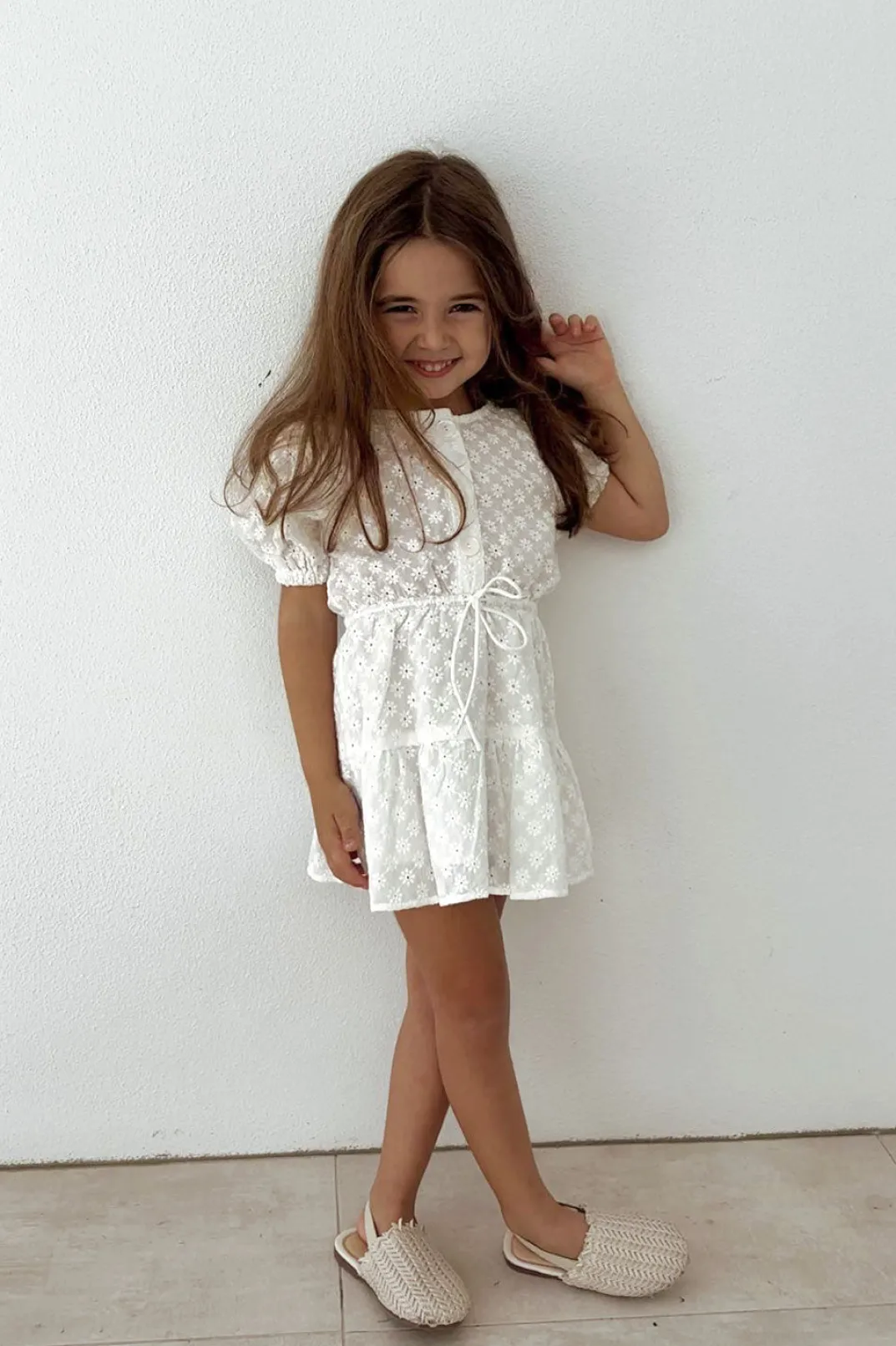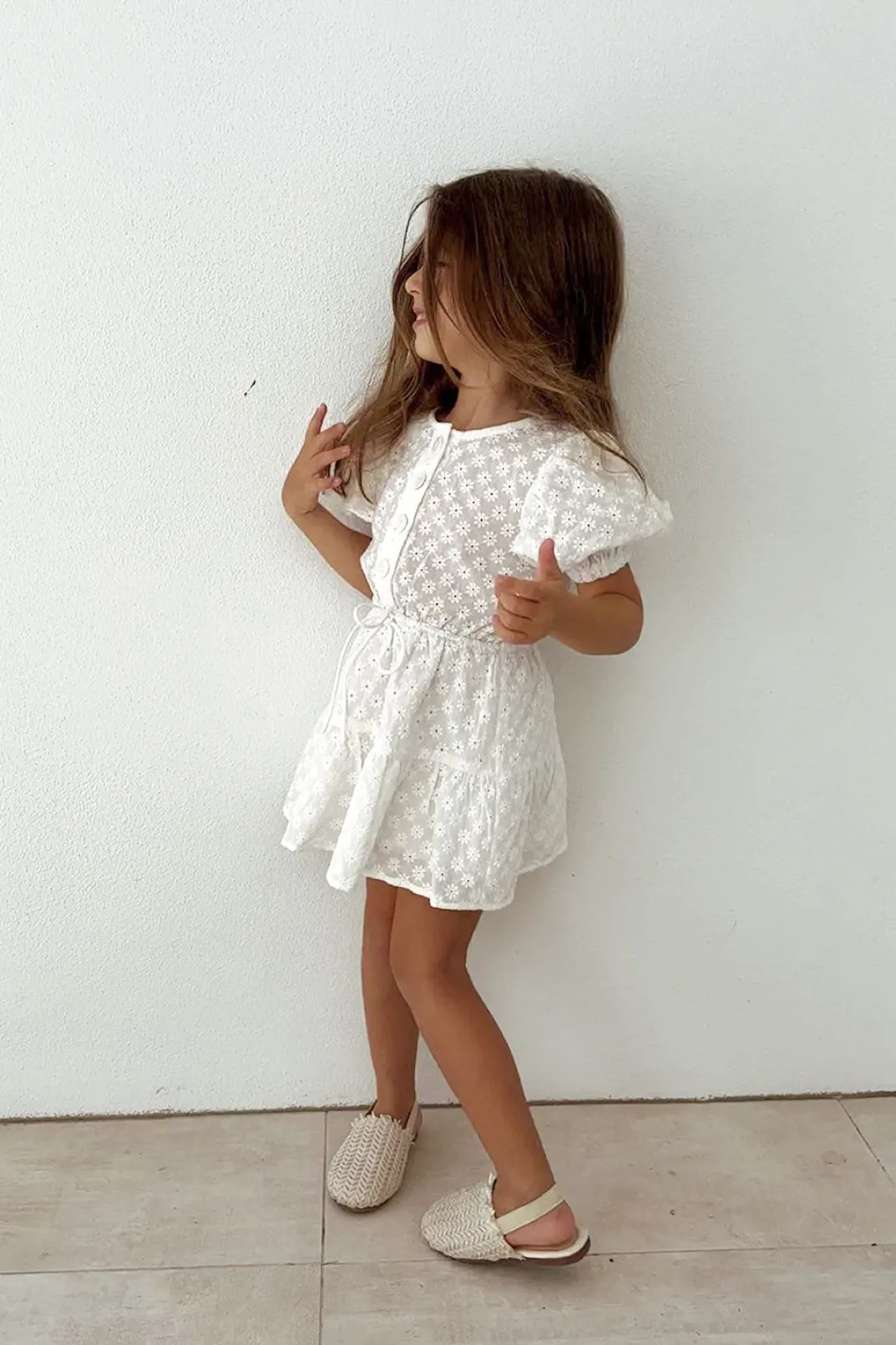 The Perfect Party Outfit For Your Mini! The Mini Rae Dress Is Made From A Natural Cotton Fabric In White And Features Broiderie Flower Details, Short Puff Sleeves, Rounded Neckline, Buttons Down Centre Front, Drawstring Tie At Waist And Double Tiered Flouncy Skirt. Pair With Sandals! Designed Exclusively By Sabo.