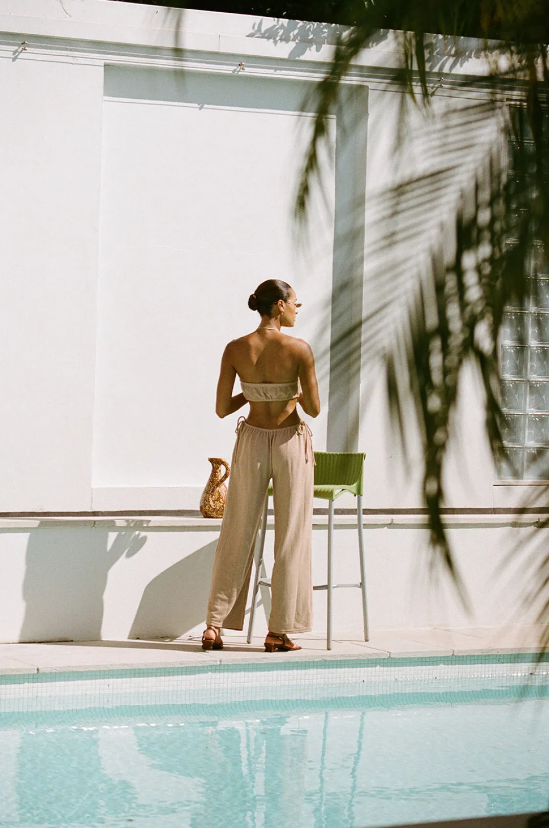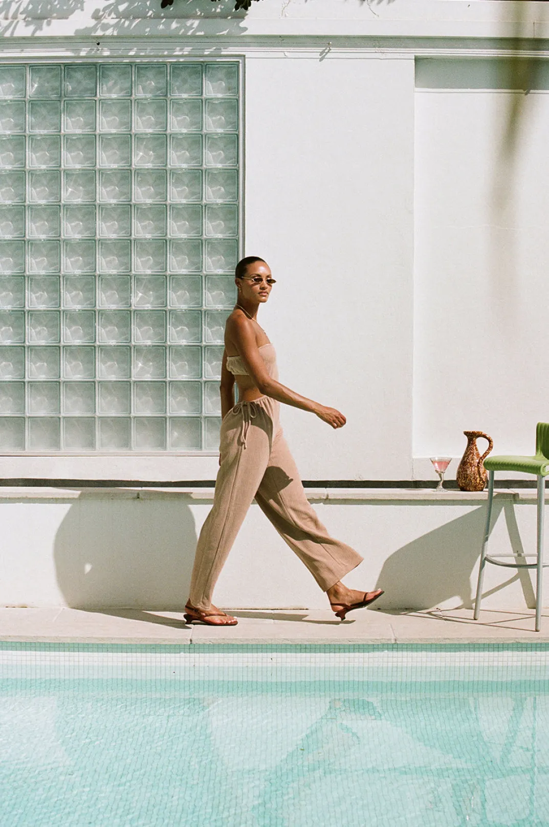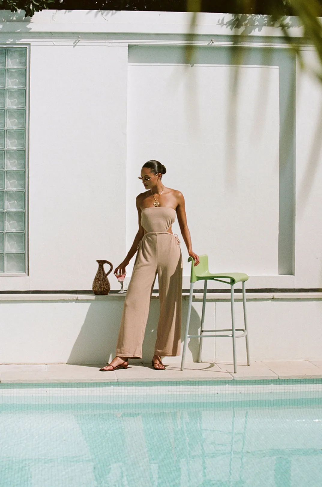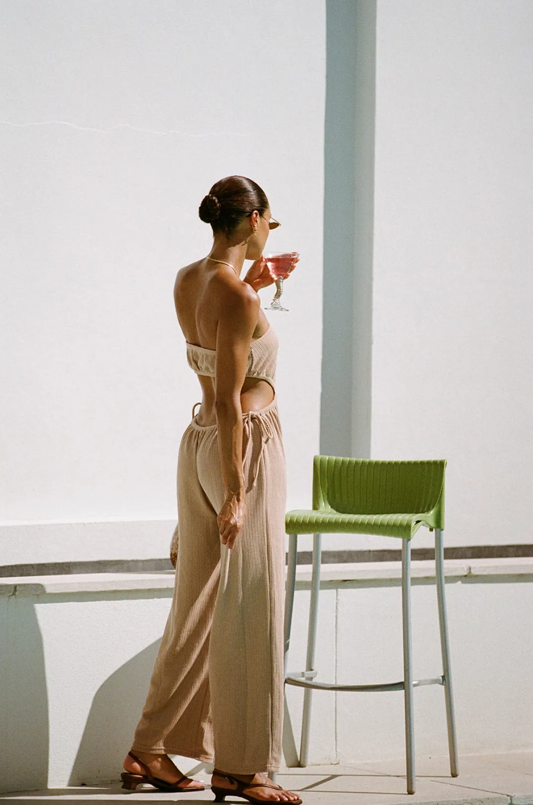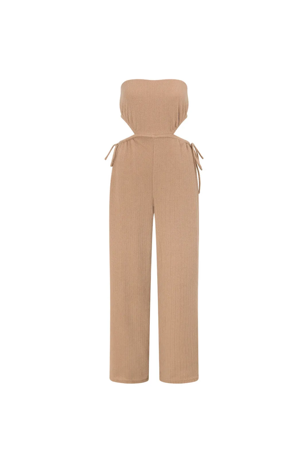Dress It Up With Heels Or Keep It Casual With Slides, Theezel Jumpsuit Is Made From A Textured Waffle Fabric In A Tan Hue. It Features A Strapless Bodice With Straight Elasticated Neckline, Cutouts At Waist With Tie Details And Wide Relaxed Legs. Complete The Look With The Transparent Mules! Designed Exclusively By Sabo.