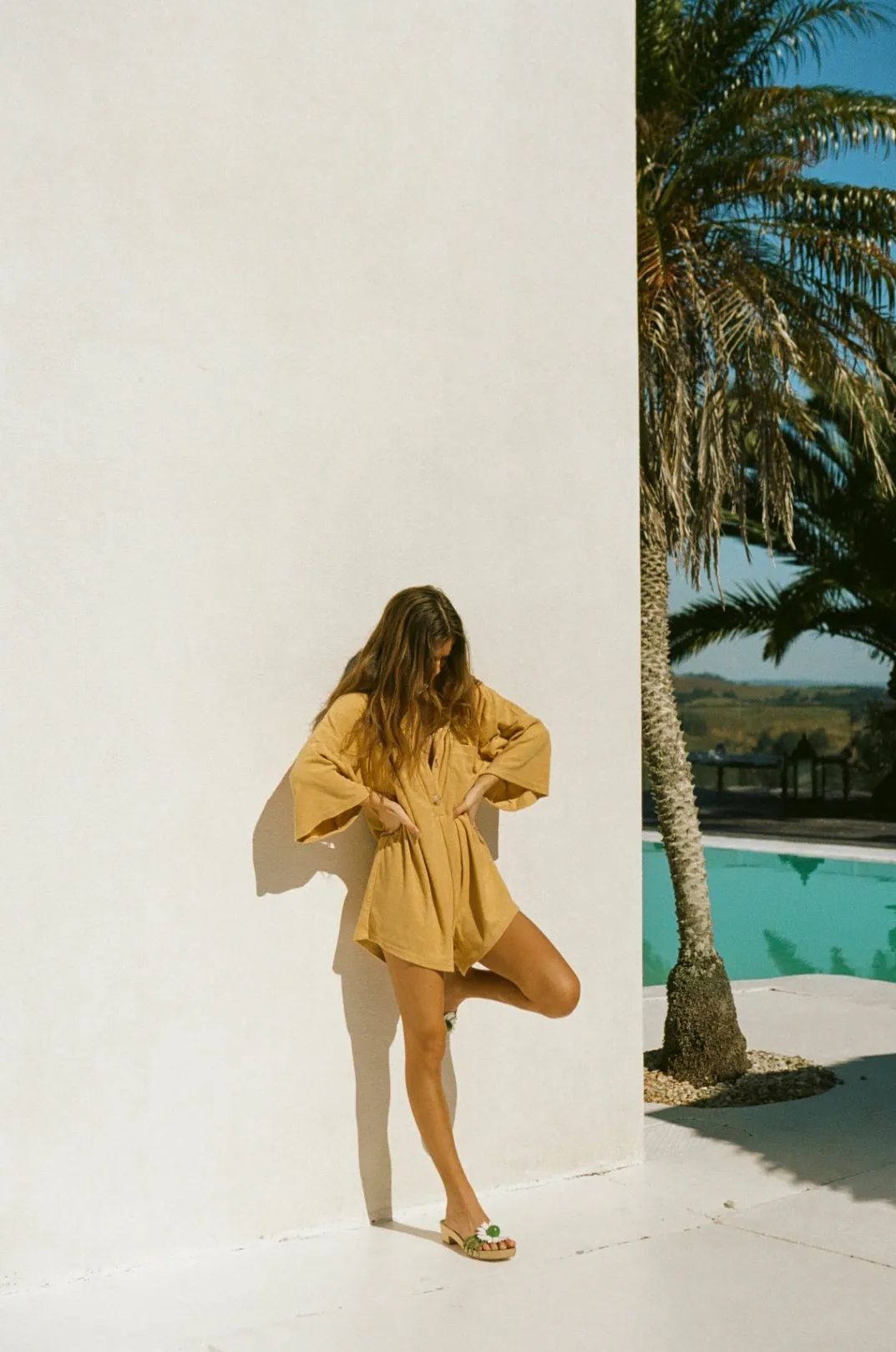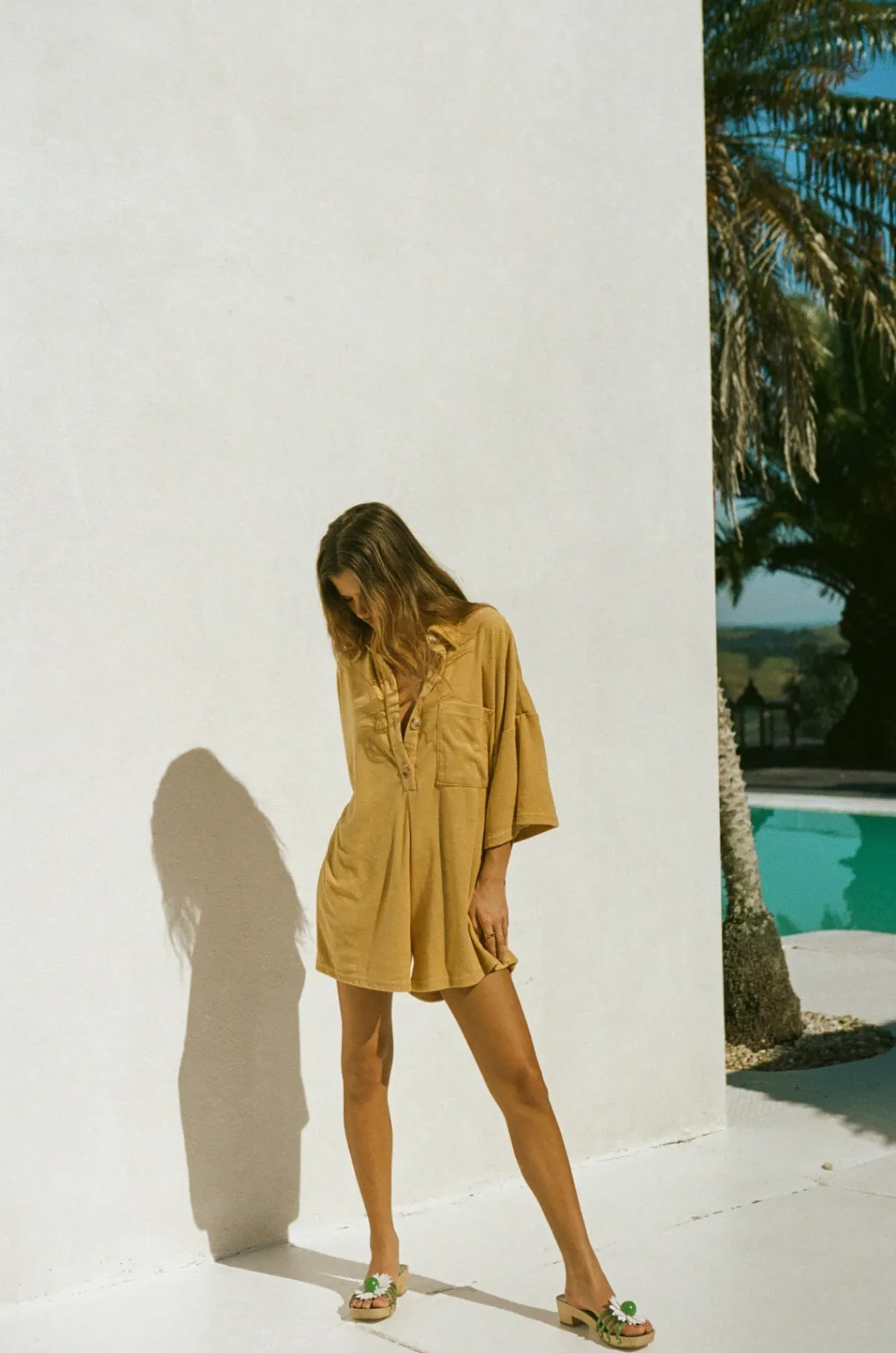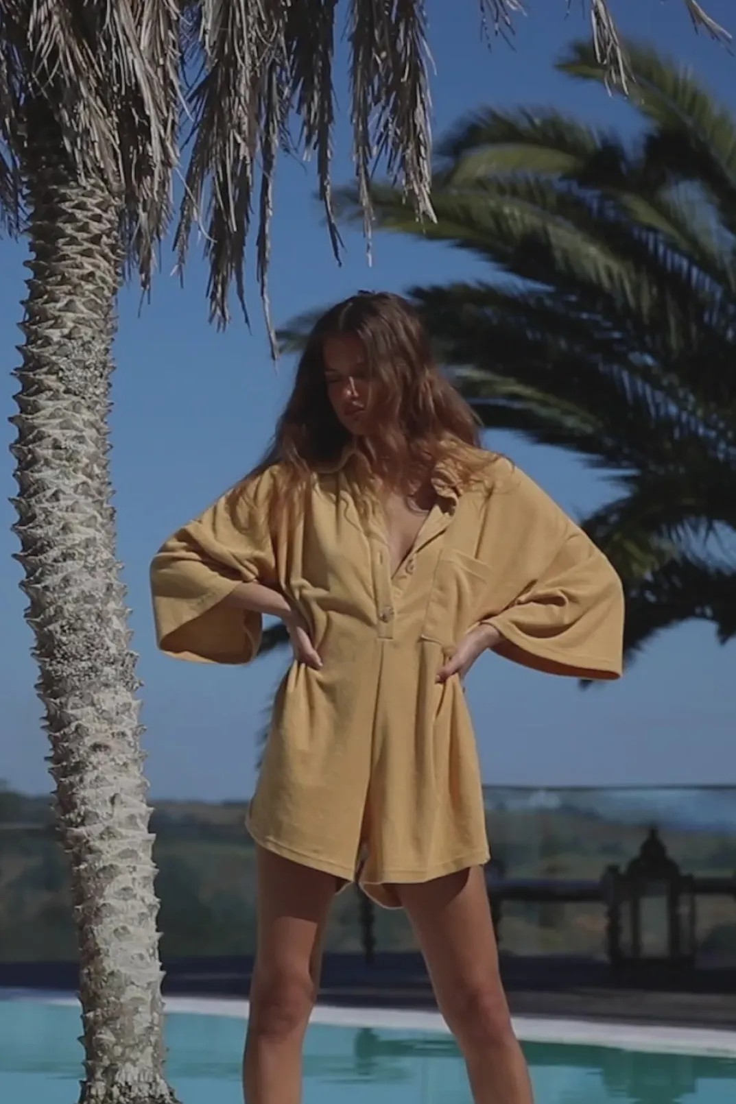 Casual Comfy Perfection To Add To Your Day-To-Day Wardrobe Rotation! The Milena Playsuit Is Made From A Soft Towelling Fabric In A Dusty Orange Hue. It Is A Relaxed Style Featuring Drop Shoulders, Wide 3/4 Length Sleeves, Collar, Buttons Down Centre Front And A Breast Pocket. Designed Exclusively By Sabo.