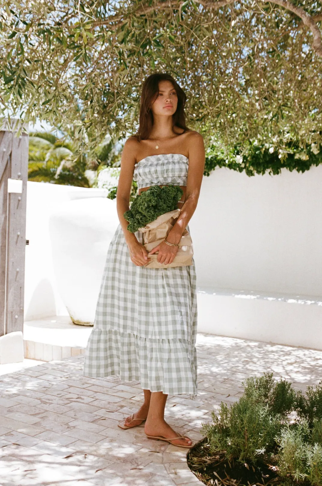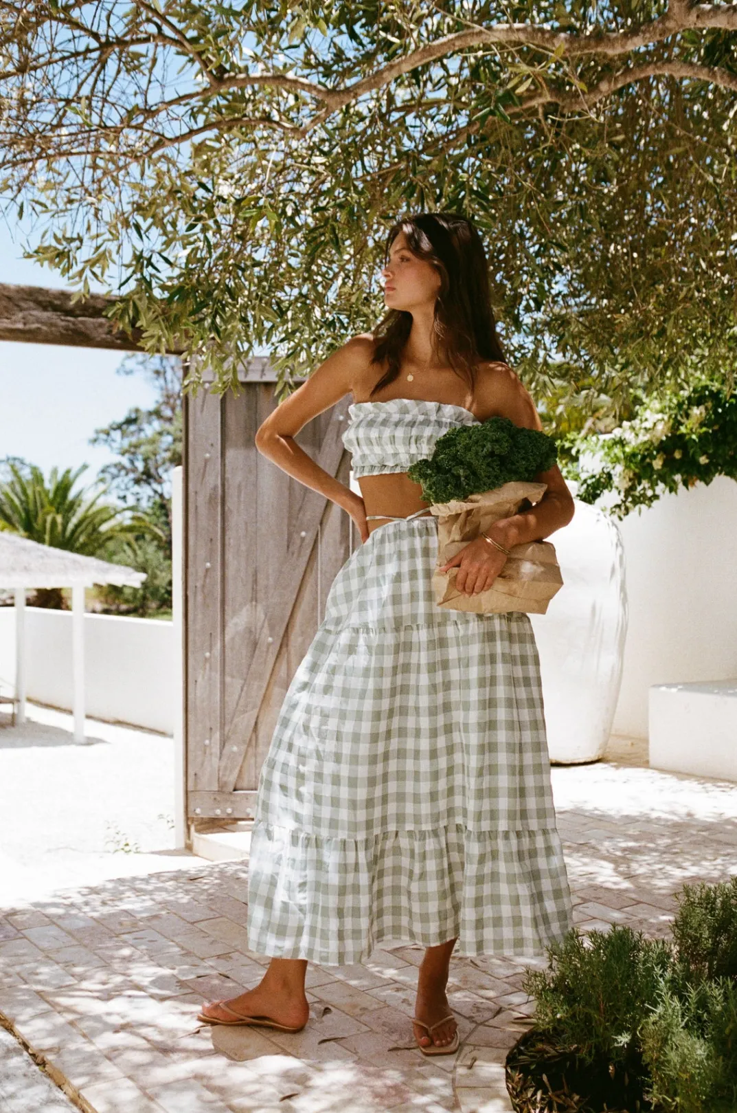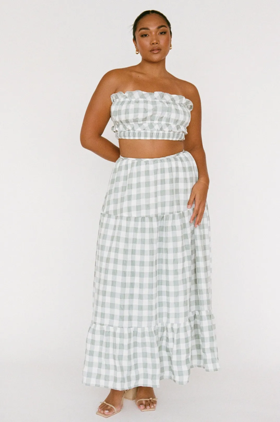 The Perfect Outfit For Lunch With The Girls! The Alarette Skirt Is Made From A Lightweight Fabric With A Sea Foam Green And White Gingham. It Is A High Waisted Style Featuring A Waist Tie Detail And Flouncy Triple Tiered Skirt. Get The Look With The Alarette Top! Designed Exclusively By Sabo.
