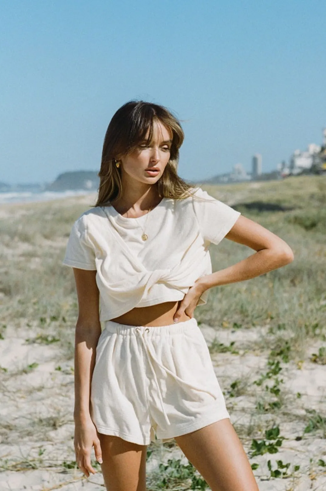 *This Is A Final Sale Item* A Super Cute Basic With A Twist! The Alchemy Twist Top Is Made From A Towelling Fabric In A Crema Hue. It Is A Semi Cropped Style Featuring Short Sleeves, A Rounded Neckline And Twist Detailing At Front. Complete The Look With The Alchemy Shorts And Rattan Backpack! Exclusively Designed By Sabo.