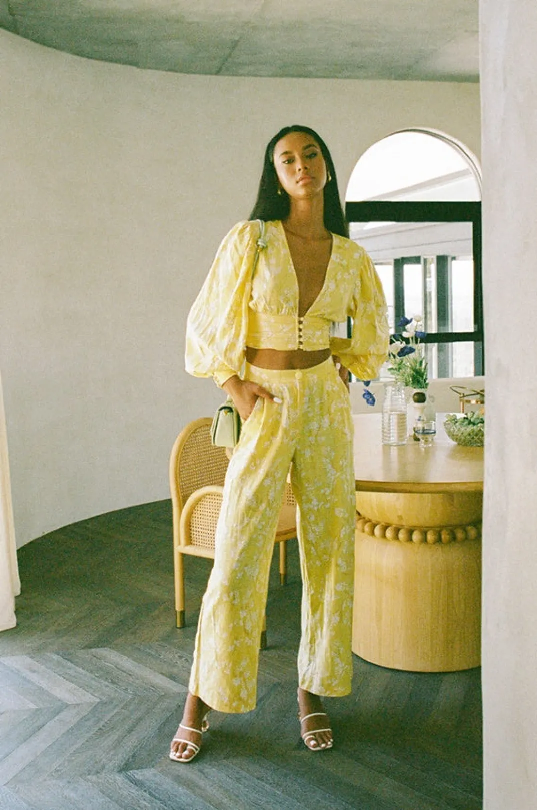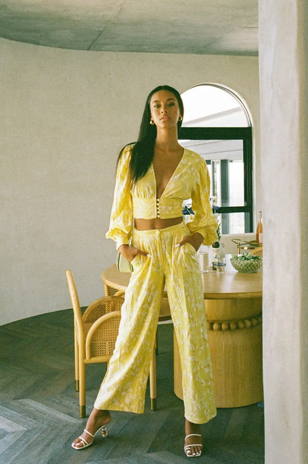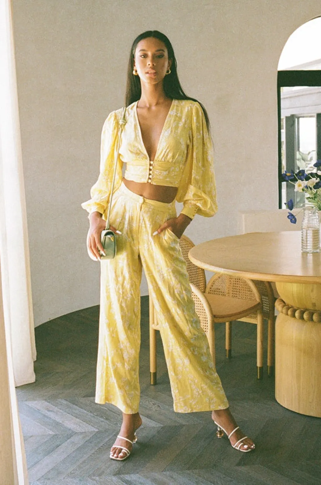 *This Is A Final Sale Item* The Chic Alexi Pants Are Made From A High Quality Cheesecloth Fabric With Our Exclusive Speck Floral Print Throughout. They Are A High Waisted Wide Leg Style Featuring Twin Pockets At Sides. Complete The Look With The Alexi Top, Transparent Mules And Nahla Ruched Bag. Designed Exclusively By Sabo.