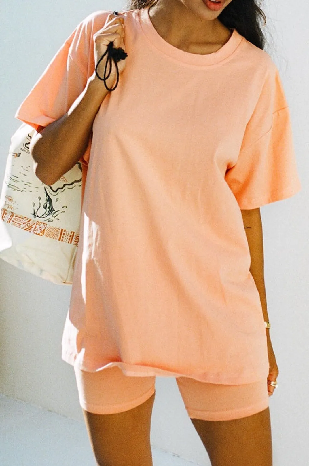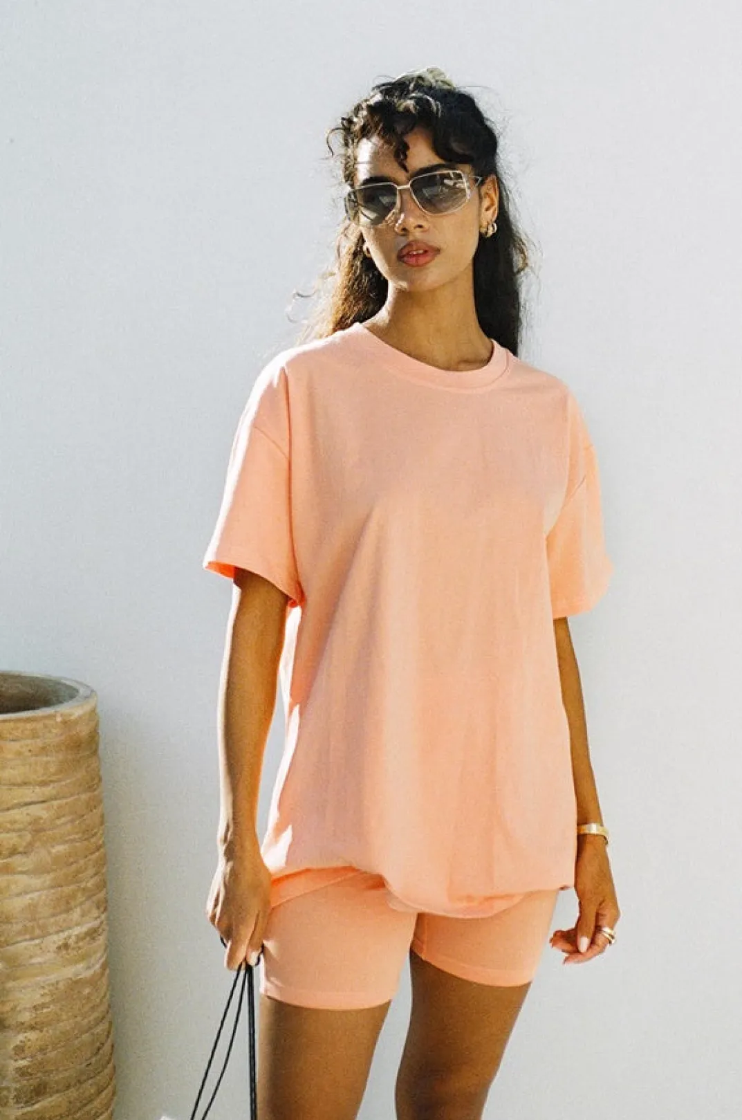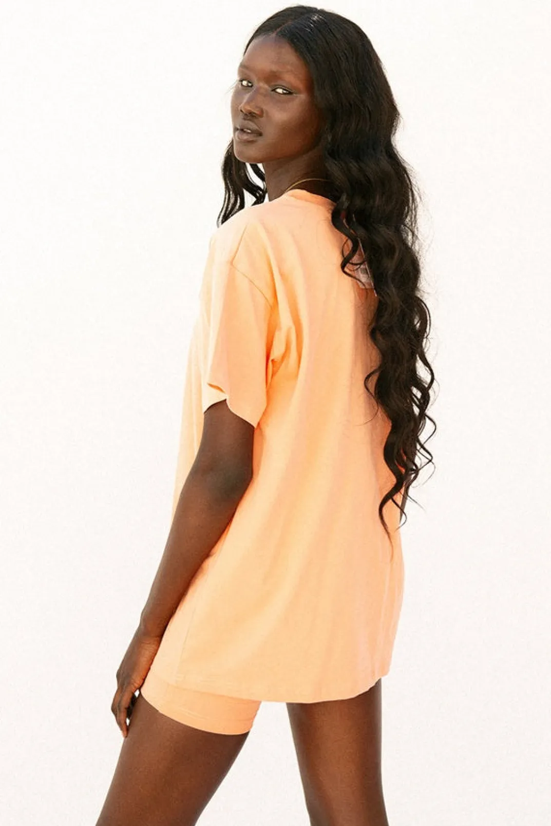 *This Is A Final Sale Item* *Back In Stock* A Basic Shape In A Fresh New Shade! The Apricot Tee Is Made From A Natural Cotton Fabric In An Orange Hue. It Is A Relaxed Tee Style Featuring A High Rounded Neck And Short Sleeves. Get The Look With The Apricot Bike Shorts, Nude Rattan Backpack And Mira Ring Slides! Exclusively Designed By Sabo. True Colour Like First Image.
