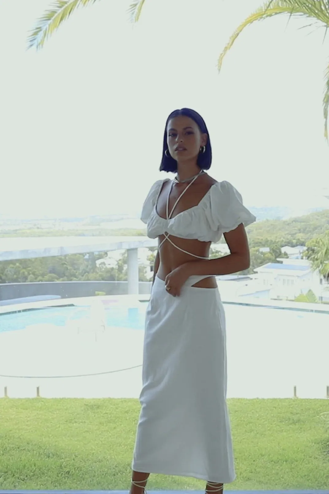 *This Is A Final Sale Item* Made For Afternoons Out With Friends! The Arancia Skirt Is Made From A Natural Cotton Fabric In An Off White Hue. It Is A High Waisted Style Featuring An Asymmetric Waist And Cutout At Side. Get The Set With The Arancia Top! Designed Exclusively By Sabo.