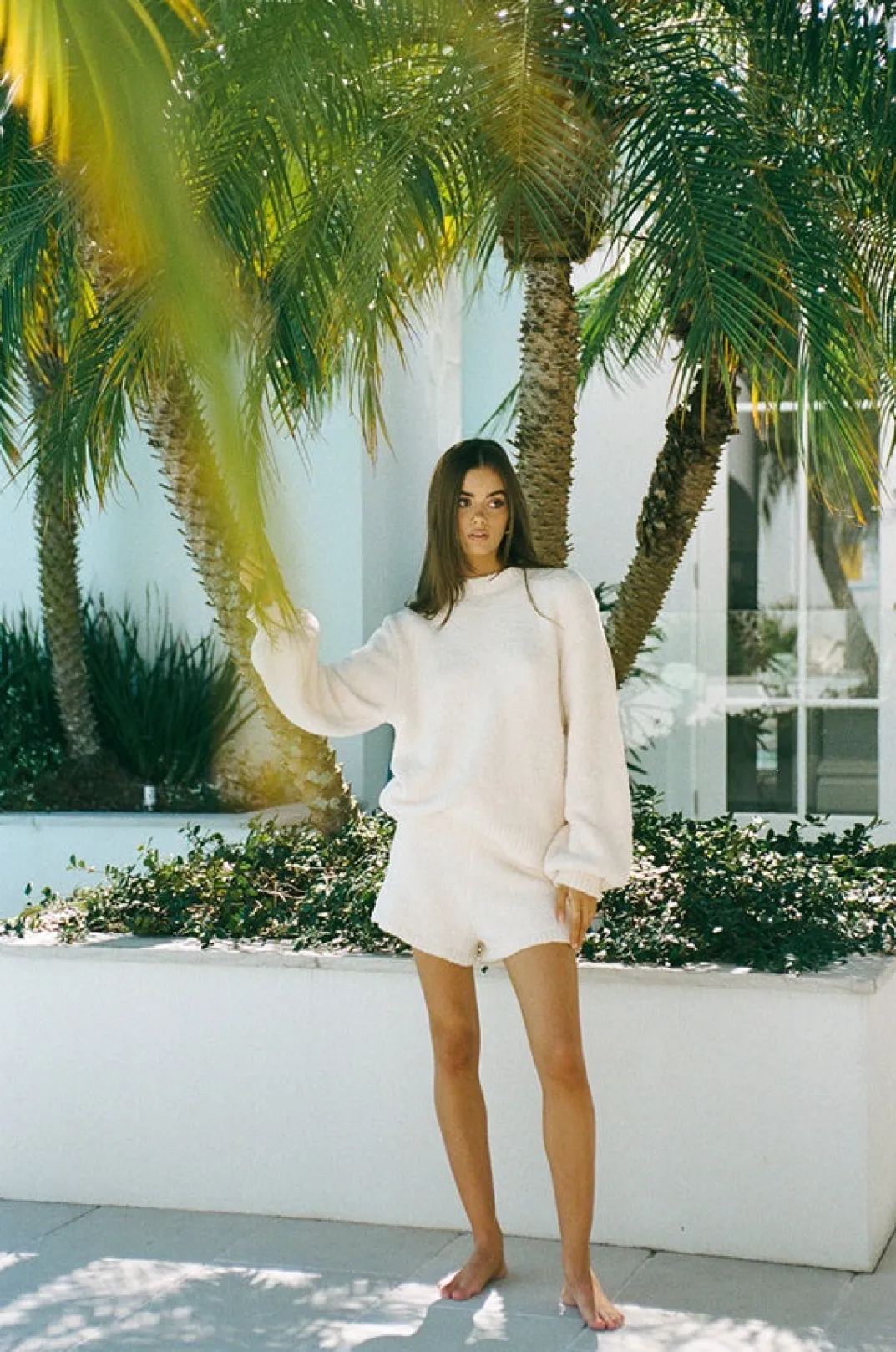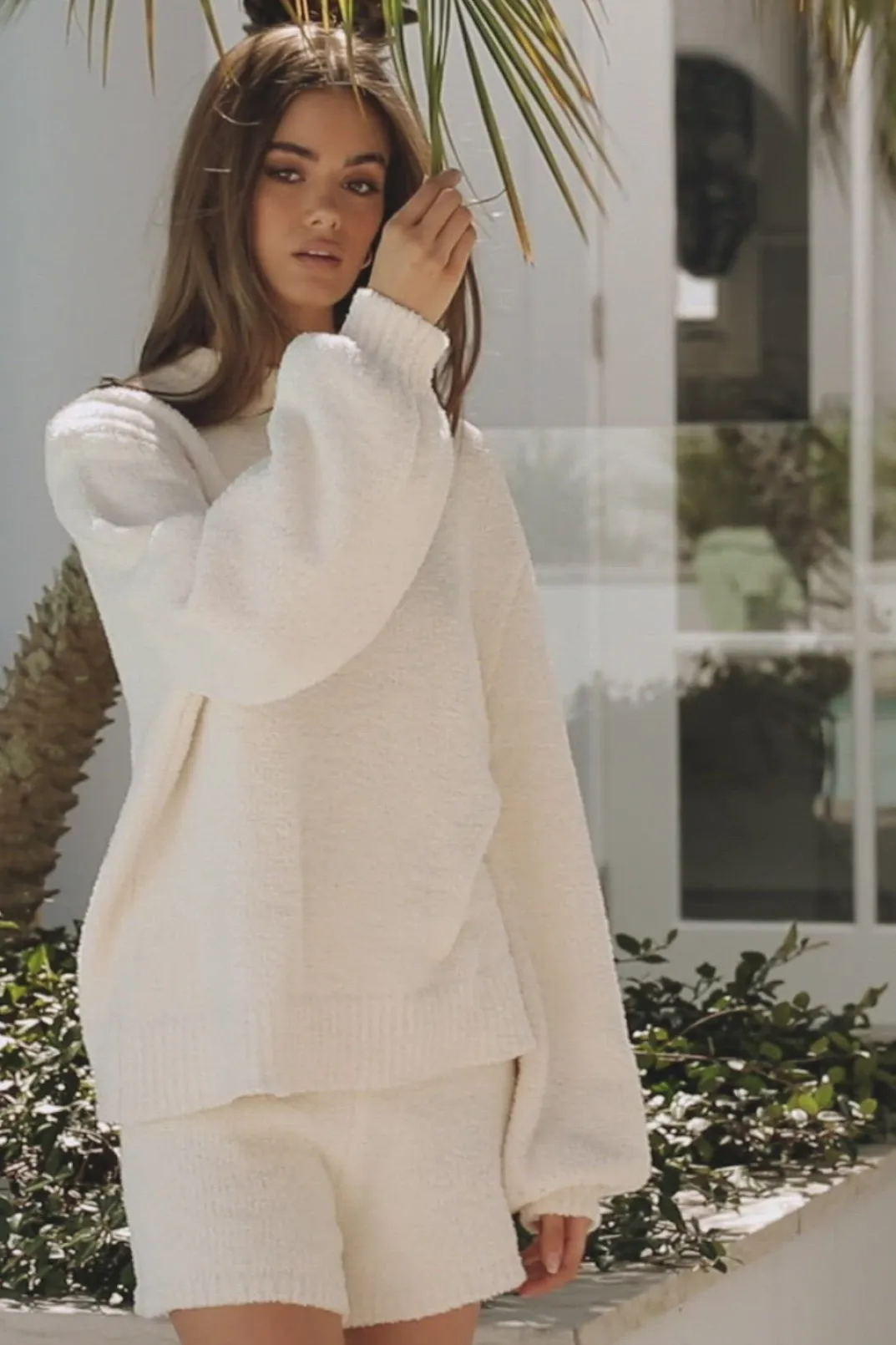 *This Is A Final Sale Item* The Arcadia Knit Sweater Is Made From The Cosiest Sherpa Fabric In A Cream Hue. It Is A Relaxed Style With A High Rounded Neckline, Full Length Sleeves And Ribbed Trim Details Throughout. Complete The Look With The Arcadia Knit Shorts! Designed Exclusively By Sabo.