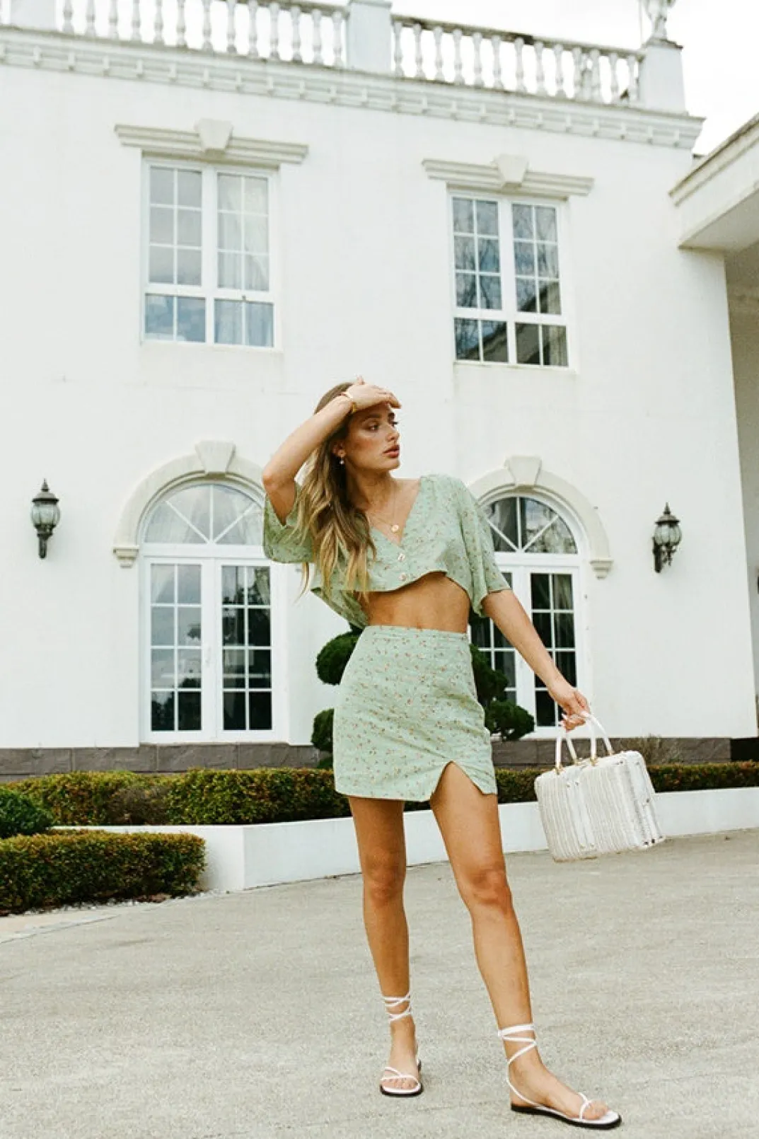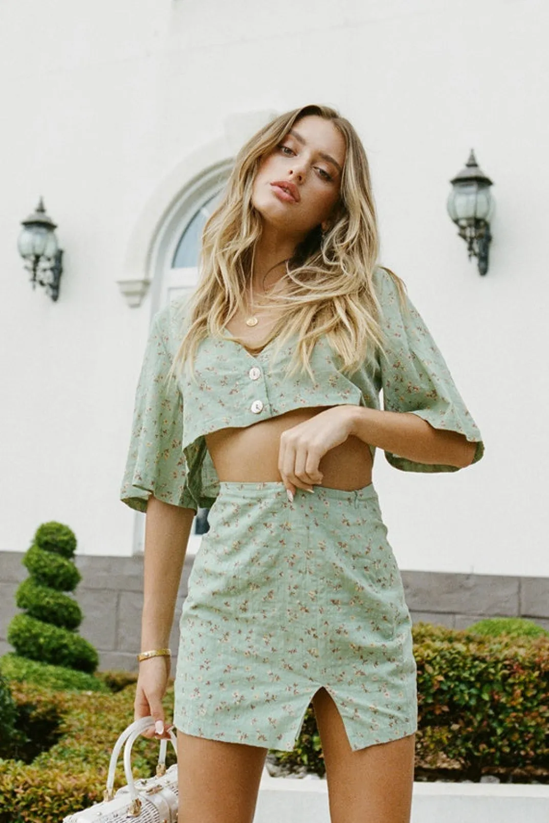 *This Is A Final Sale Item* Perfect For A Night Out, The Aster Skirt Is Made From A Raw Cotton Fabric In A Green Hue. It Is A High Waisted Style Featuring A Floral Print And Split At Side Of Leg. Complete The Look With The Aster Top And 18K Rose Cross Necklace. Exclusively Designed By Sabo.