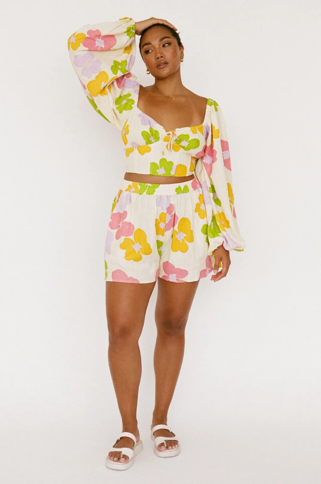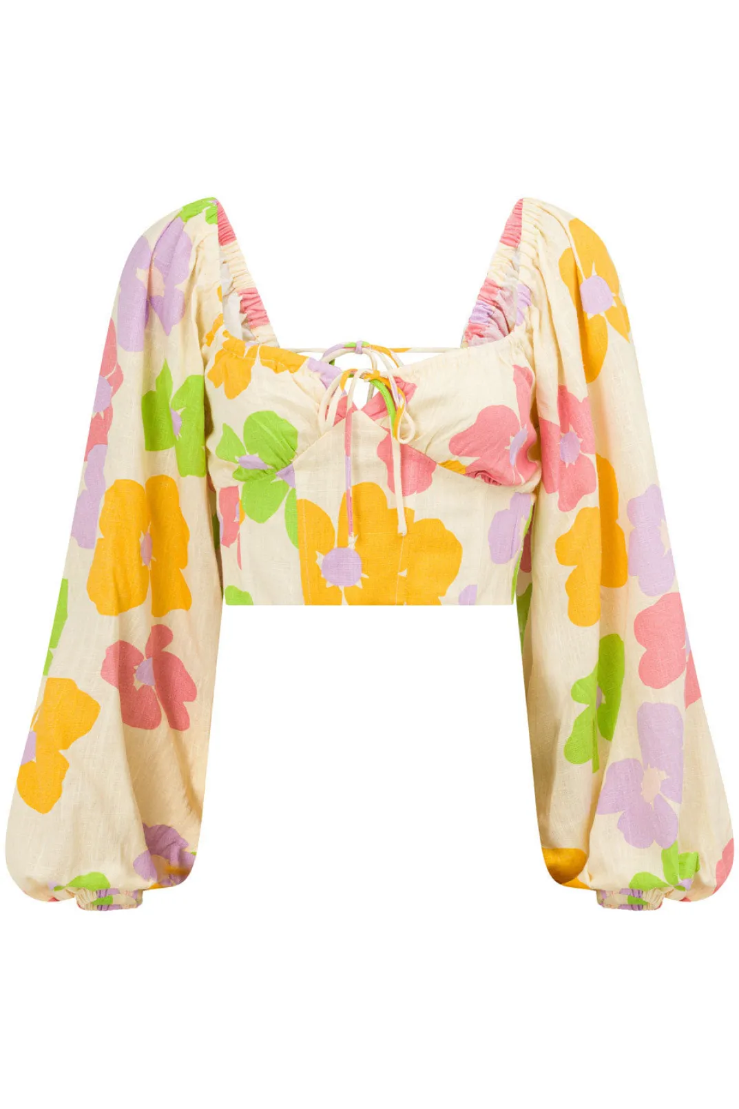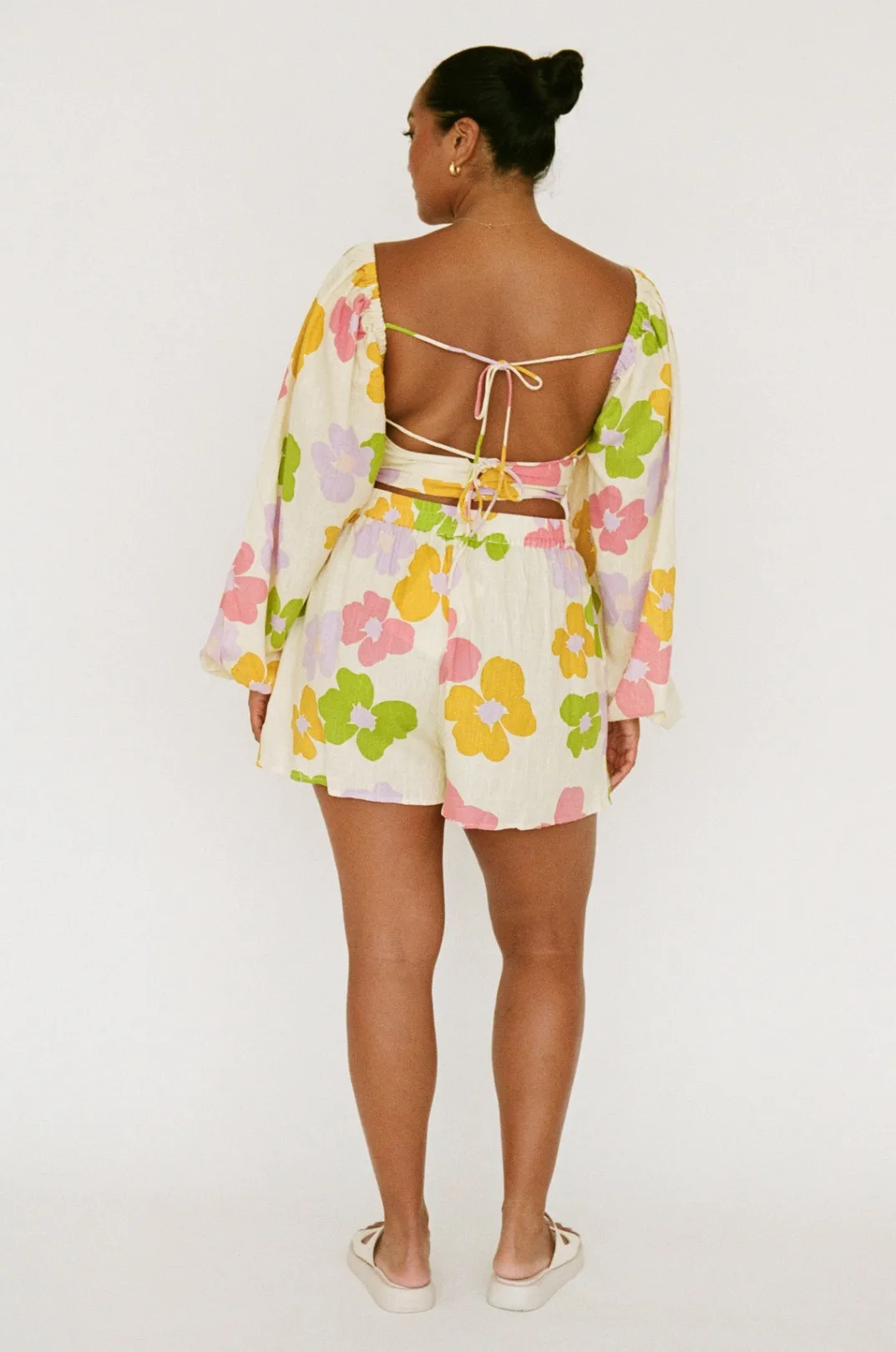 The Perfect Vibrant Pair For Your Denim! The Backless Vienna Top Is Made From A Soft Linen Blend Fabric With Our Exclusive Tutti Daisy Floral Print. It Features An Open Back With Tie Details, Full Length Puff Sleeves, Boned Corset Waist And Tie At Centre Neckline. Dress It Up With The Tuscany Belted Skirt Or Get The Set With The Lennon Shorts! Designed Exclusively By Sabo.