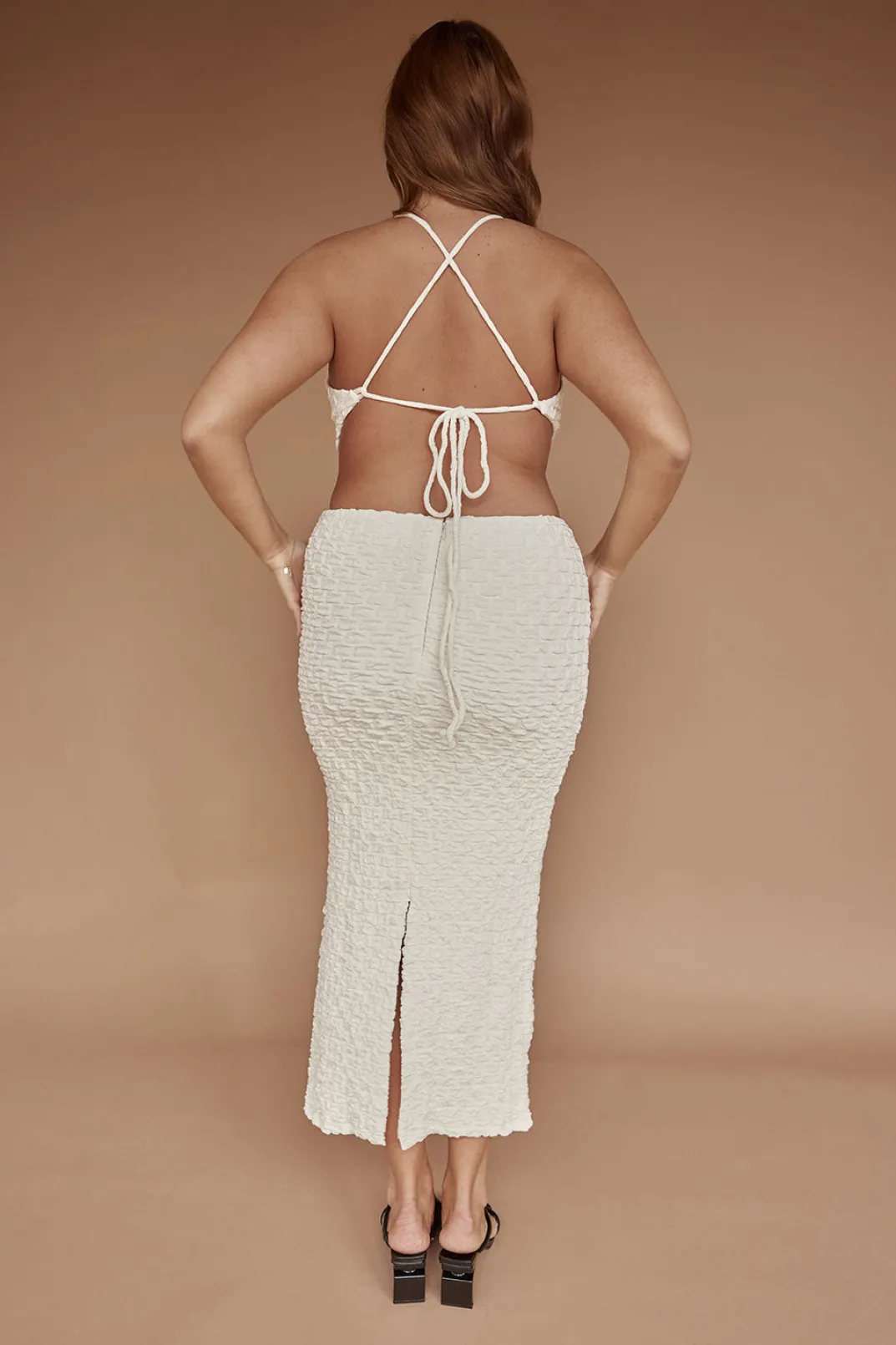 *This Is A Final Sale Item And Cannot Be Returned. See Our Returns Policy Here The 00’s Inspired Backless Wren Top Is Made From A Stunning Textured Bubble Cotton Blend Fabric In An Off White Hue. It Features A Strappy Open Back, Straight Neckline And Pointed Hem. Get The Set And Pair With The Zantina Maxi Skirt Or Pair It Back With Denim! Designed Exclusively By Sabo.