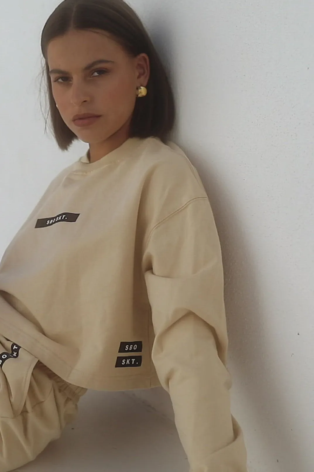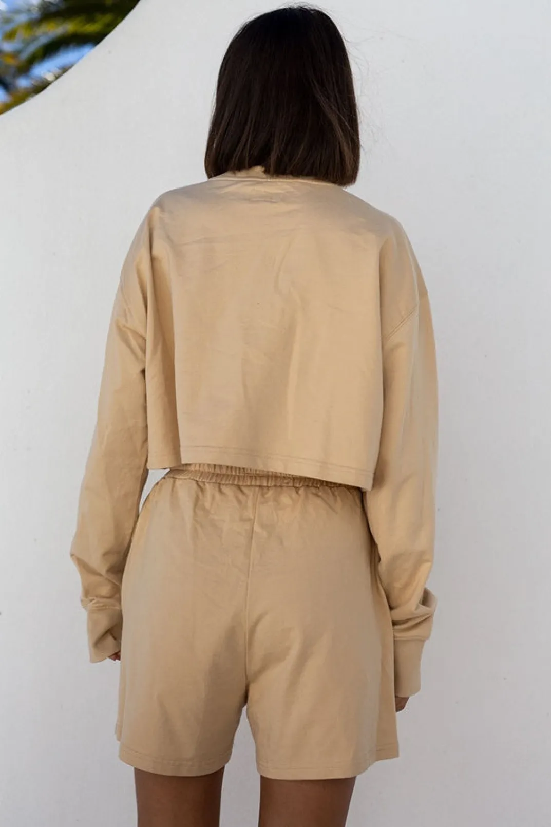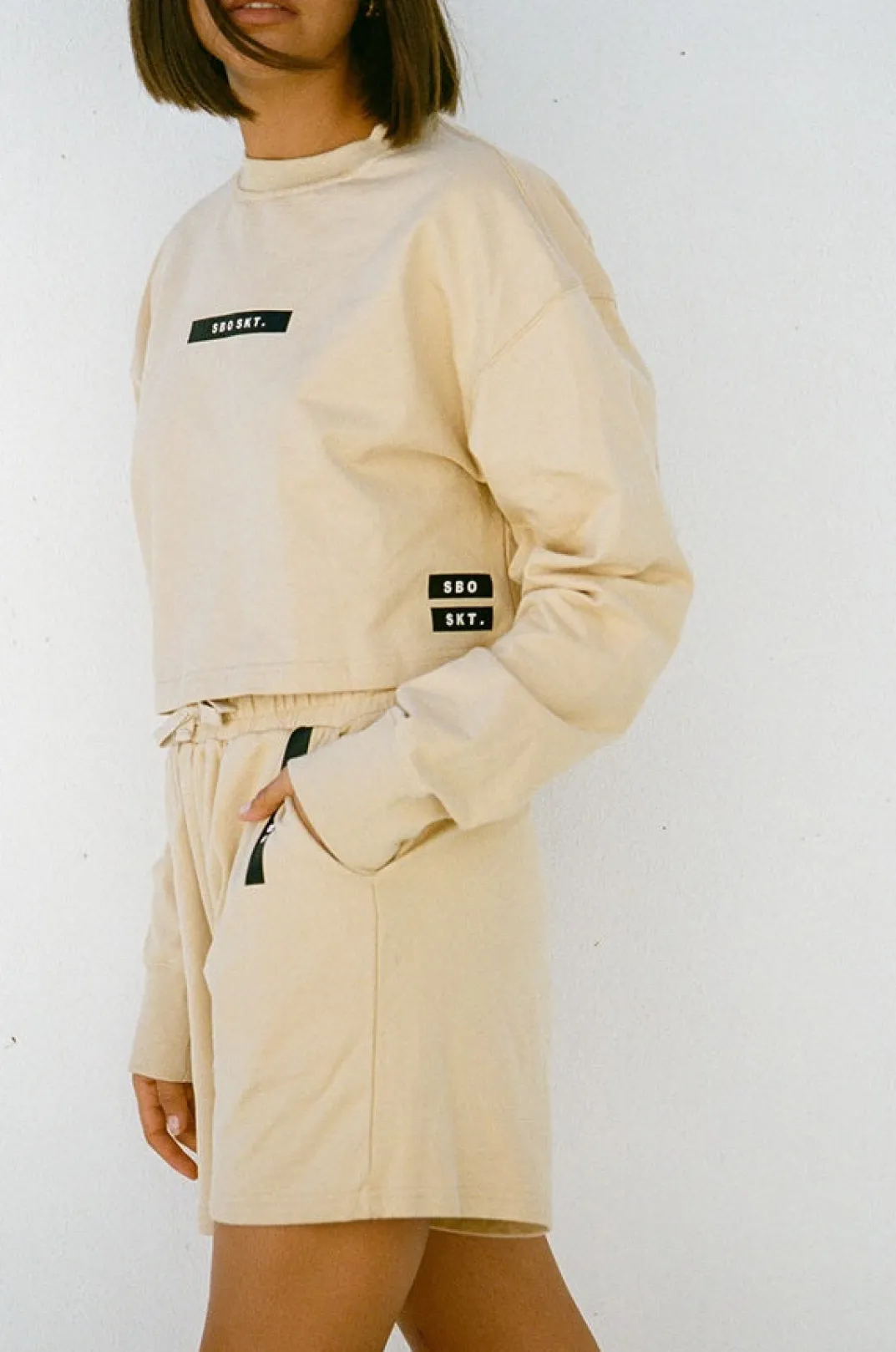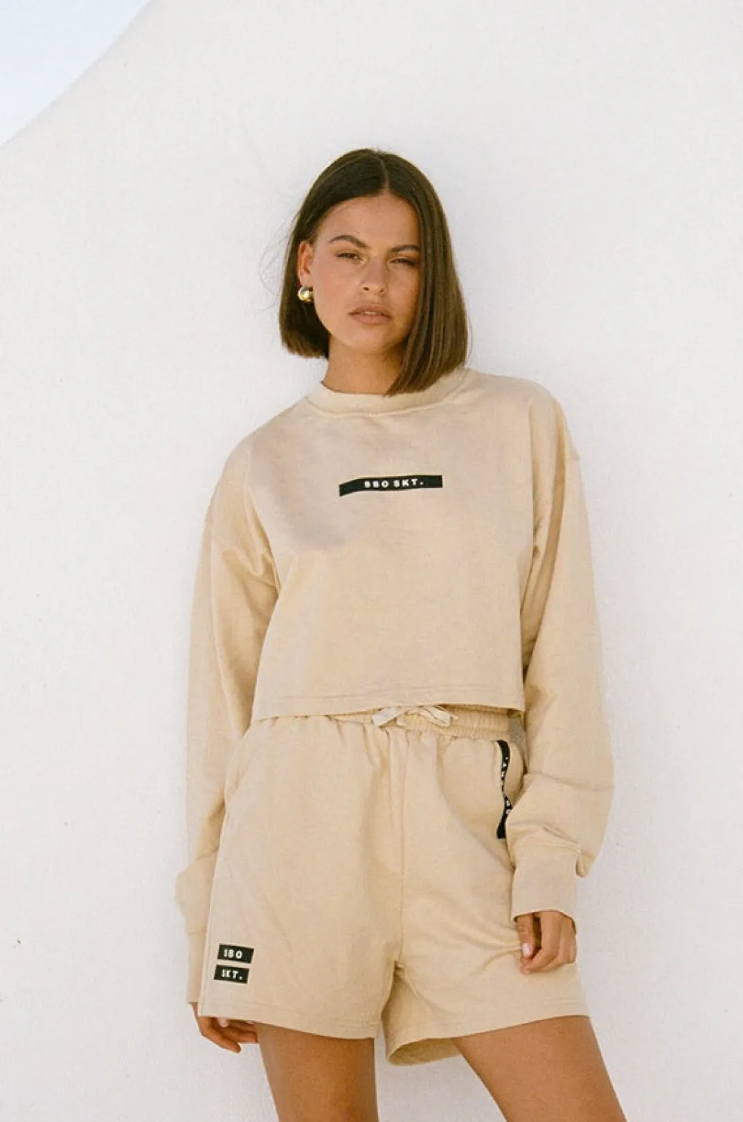 *This Is A Final Sale Item* An Easy-To-Wear Staple Set! The Barros Shorts Are Made From A Lightweight Cotton Terryback Sweater Fabric In A Light Tan Hue. They Are A High Waisted Style Featuring An Elasticated Waist With Drawstring, Twin Pockets, High-Low Hems And Black Printed Sbo Skt Graphic Detailing. Get The Look With The Barros Top And Lattice Mini Backpack! Exclusively Designed By Sabo.