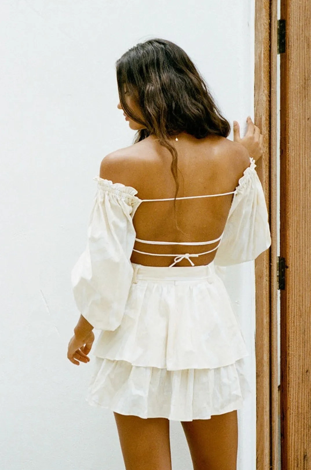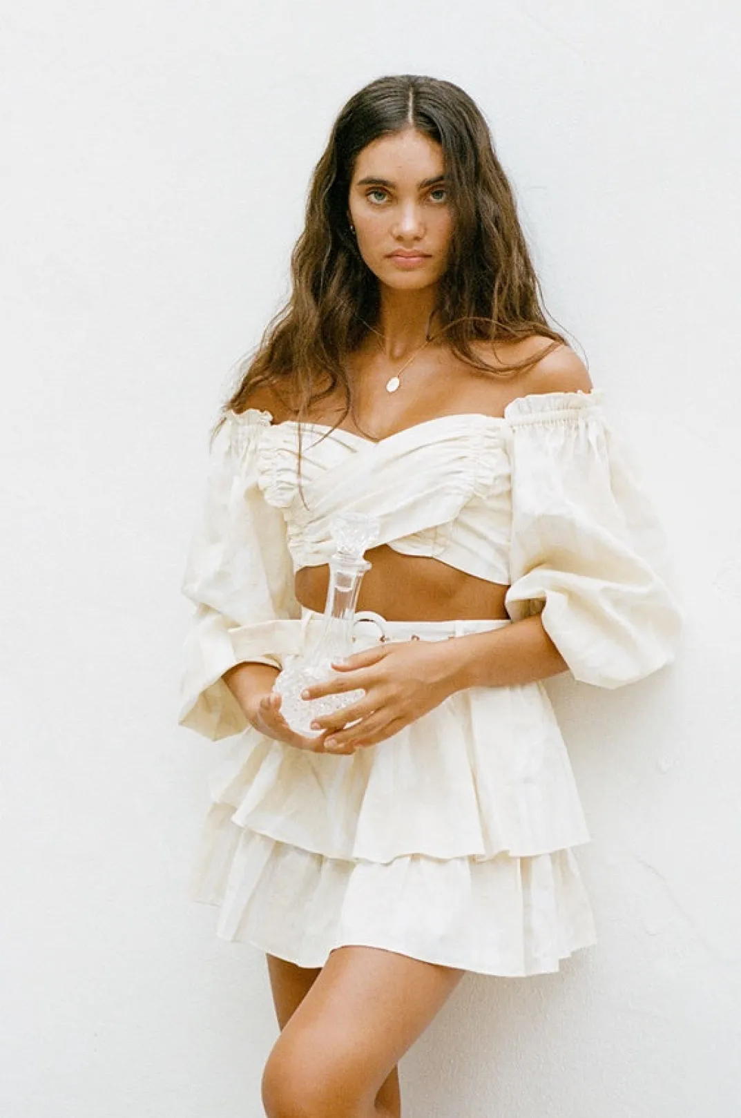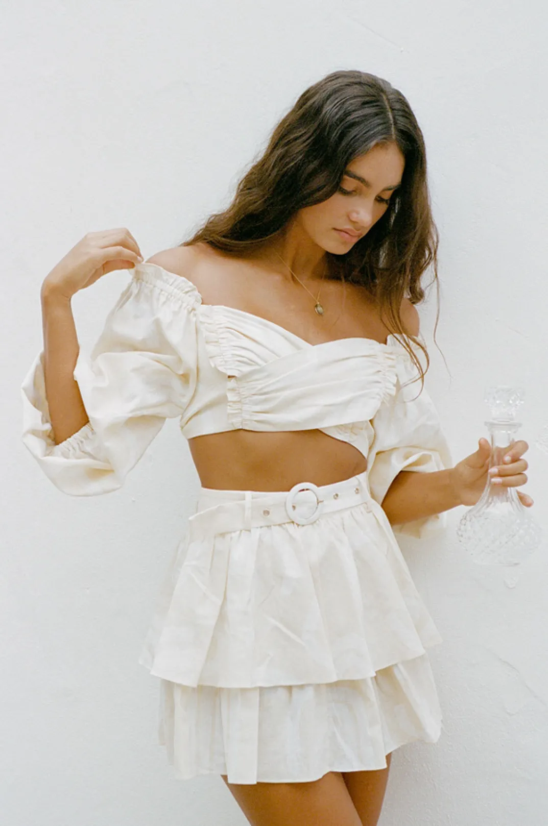 Perfect For Party Season! The Belted Zoe Skirt Is Made From A High Quality Structured Linen Cotton Blend Cream Fabric With Our Exclusive Line Print Throughout. It Is A High Waisted Style Featuring A Flouncy Double Tiered Skirt And Matching Belt! Get The Look With The Backless Zoe Top, Strappy Sierra Heels And 18K Twirl Ring. Exclusively Designed By Sabo.