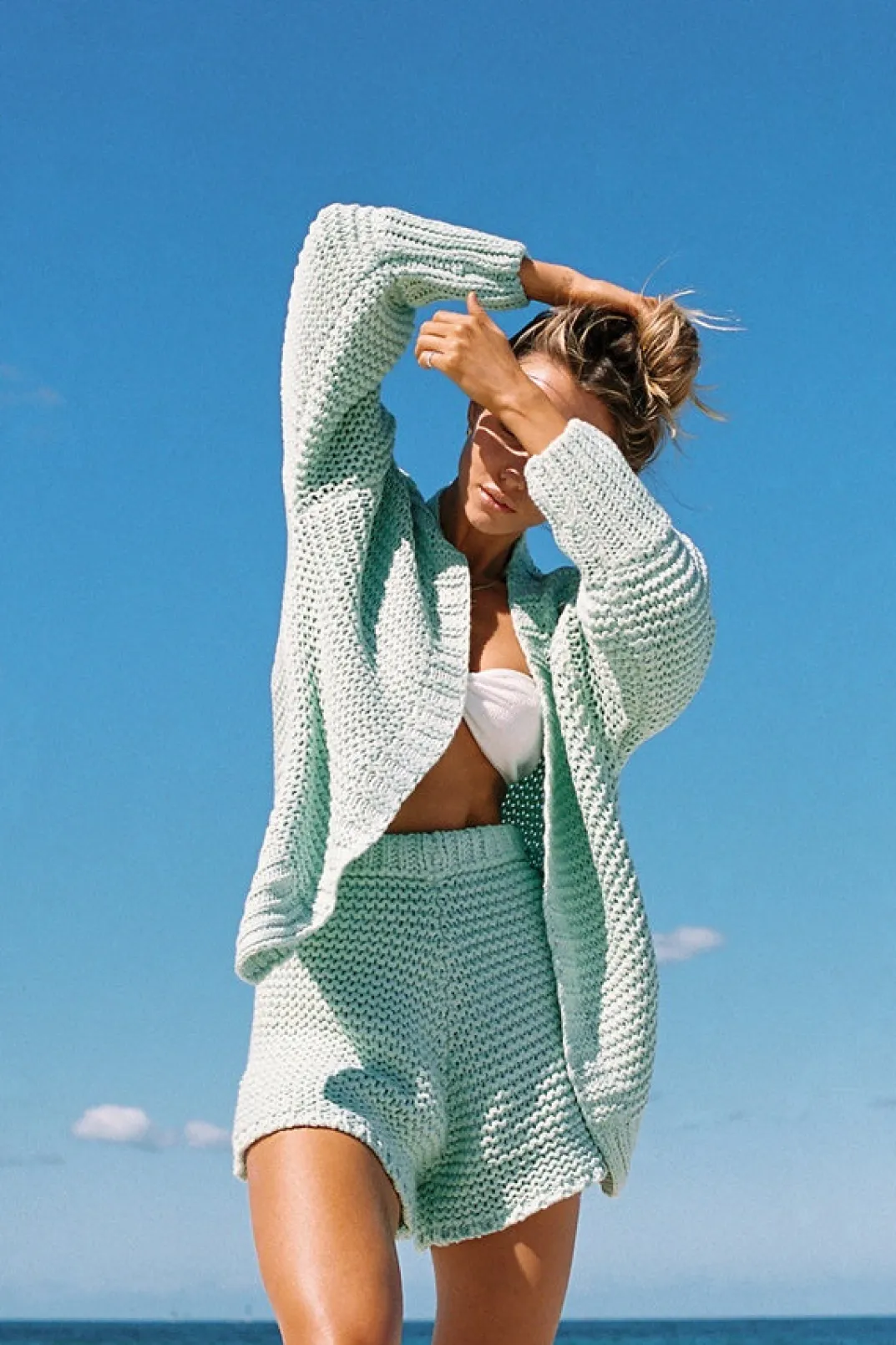 *This Is A Final Sale Item* A Cosy Transeasonal Must-Have! The Chunky Panama Shorts Are Made From A Chunky Knit In A Mint Green Hue. They Are A High Waisted Style Featuring An Elasticated Waist And High-Low Hems. Pair With The Chunky Panama Cardi And Soft Scrunchie! Exclusively Designed By Sabo.