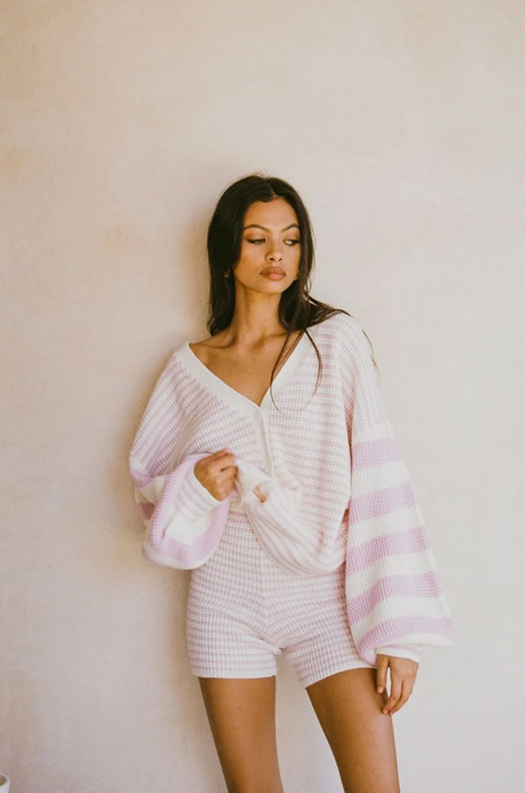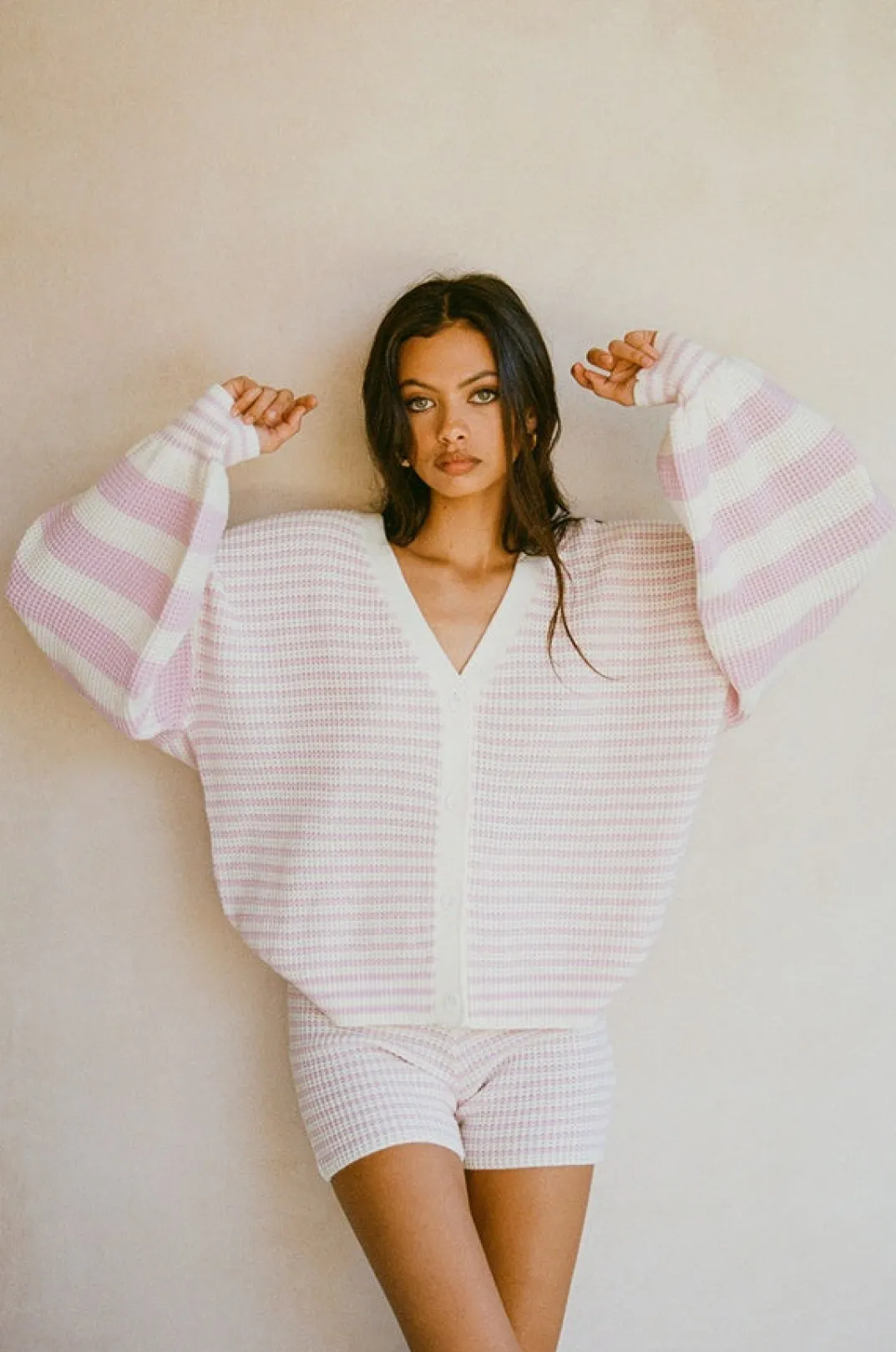 *This Is A Final Sale Item A Basic Pair, But Make It Cosy! The Diaz Shorts Are Made From A Soft Knit Fabric With Light Cream And Pink Stripes Throughout. They Are High Waisted Bike Short Style Featuring An Elasticated Waist And Cream Ribbed Trim Detailing. Pair With The Diaz Cardi And Jersey Scrunchie! Designed Exclusively By Sabo.