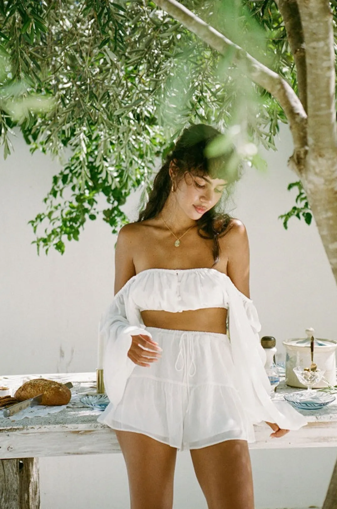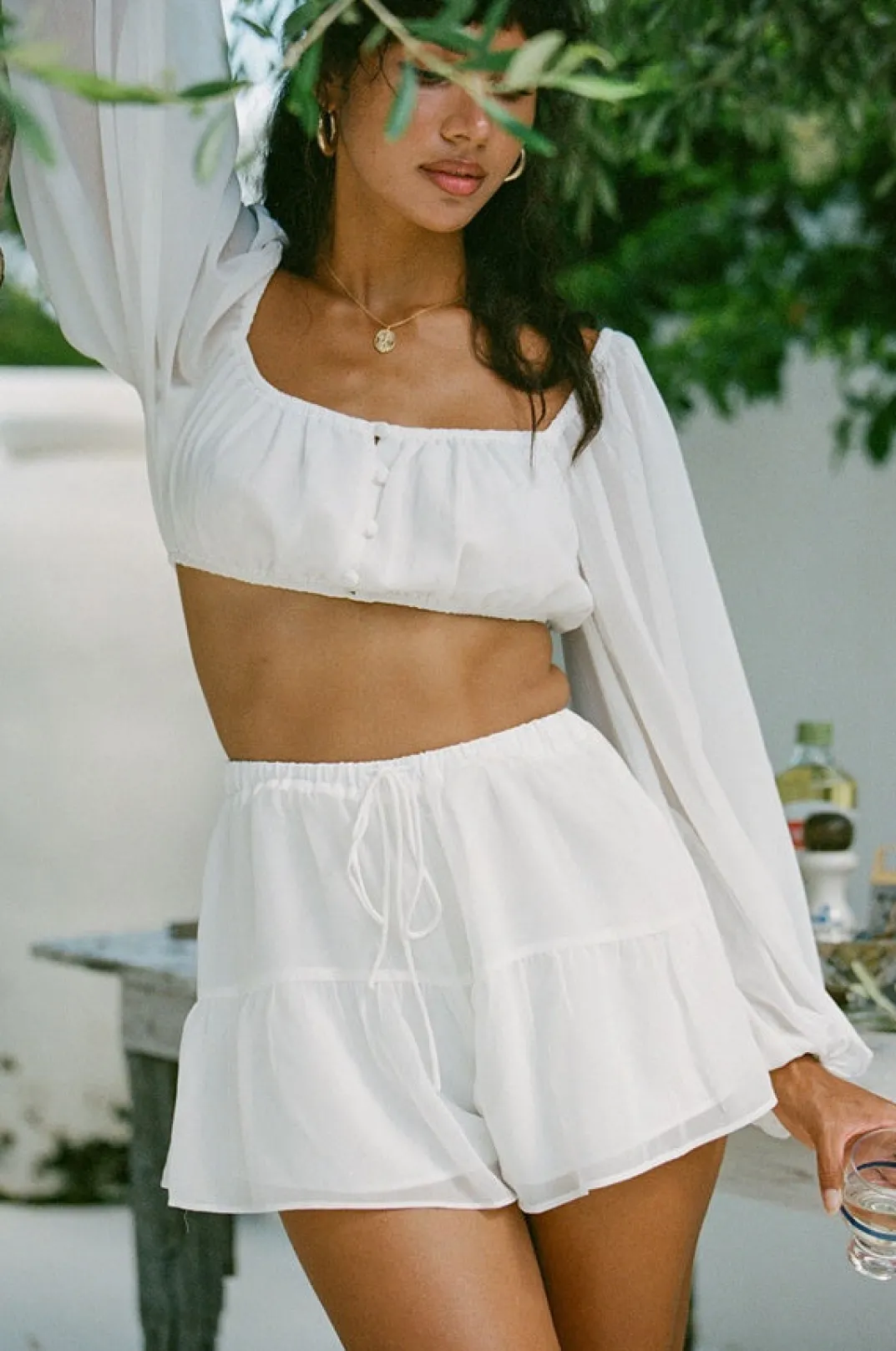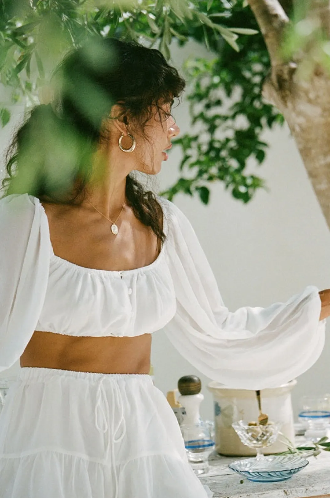 *This Is A Final Sale Item* Wear It As A Set Or Pair It Back With Jeans! The Dylan Top Is Made From A Sheer Floaty Fabric In An Off White Hue. It Features A Fully Lined Bodice With Covered Button Detailing Down Centre Front And Sheer Full Length Puff Sleeves. Pair With The Dylan Skirt, Blake Rope Earrings And Glow Necklace For A Night Out! Designed Exclusively By Sabo.