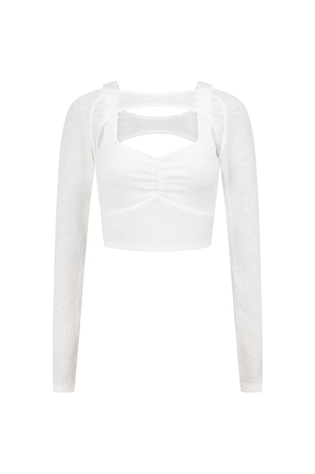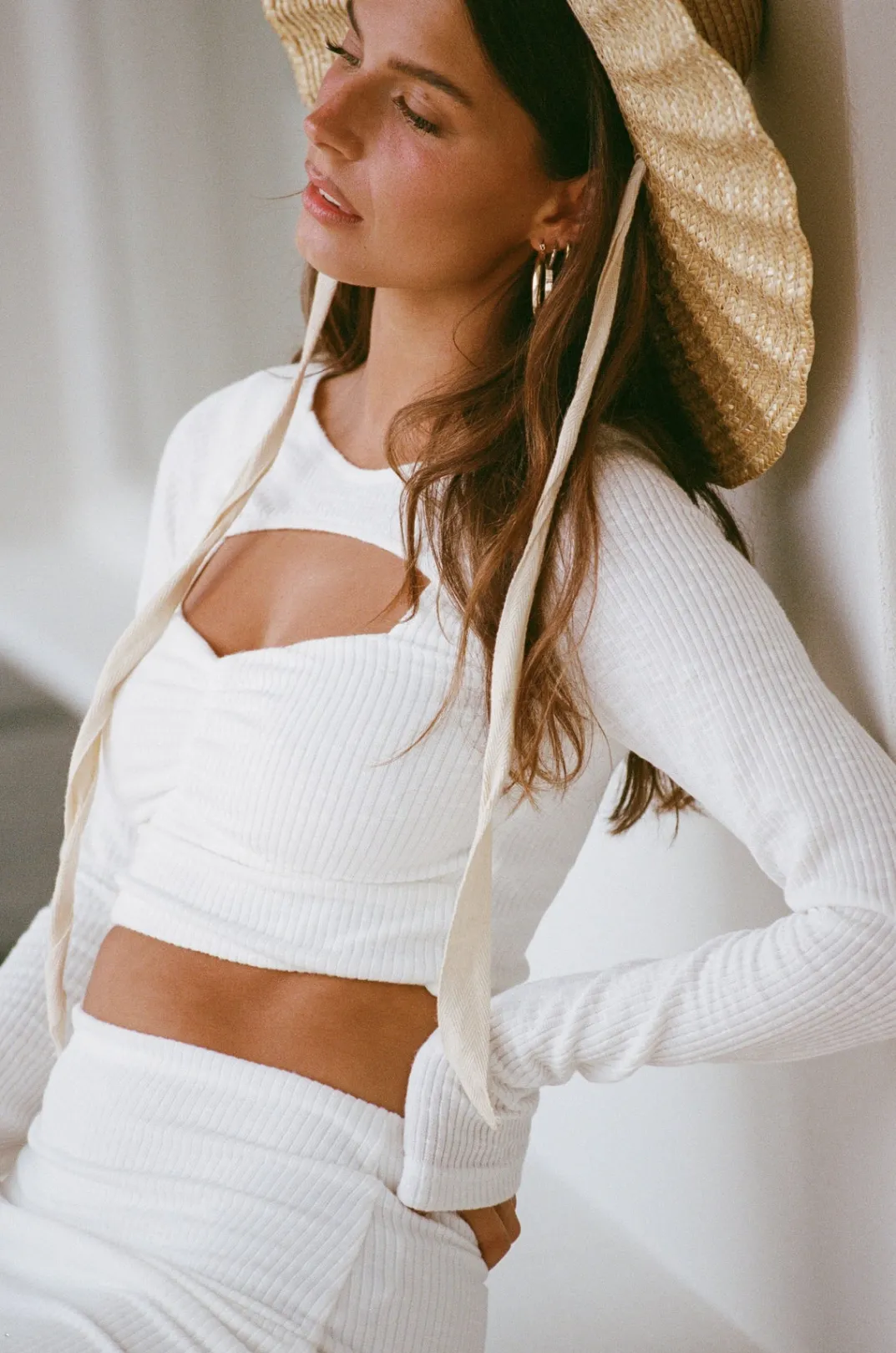 Keep It Casual And Style It With Jeans Or Dress It Up And Wear It As A Set! The Ember Top Is Made From A Soft Ribbed Fabric In White. It Is A Fitted Style Featuring Tank Sleeves, Gathering At Centre Bust And An Attached Shrug Overlay. Get The Set And Pair With The Ember Skirt! Designed Exclusively By Sabo.