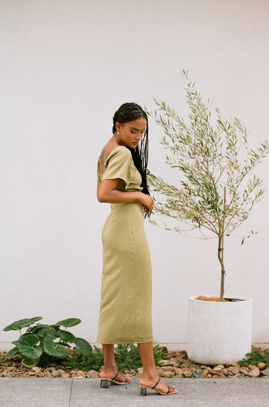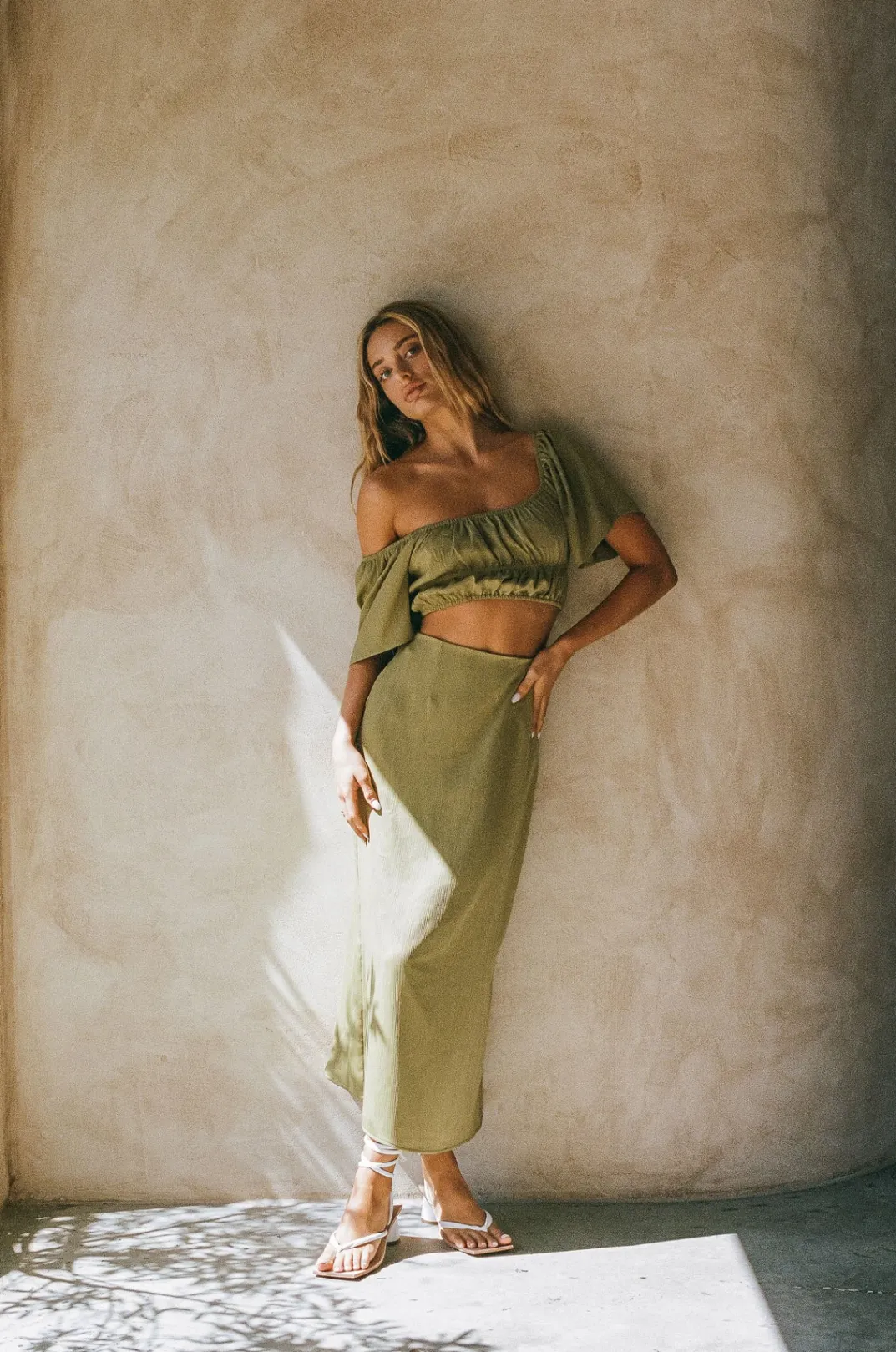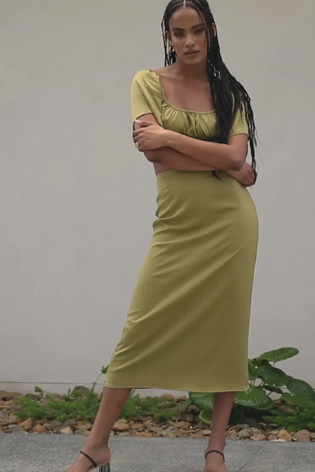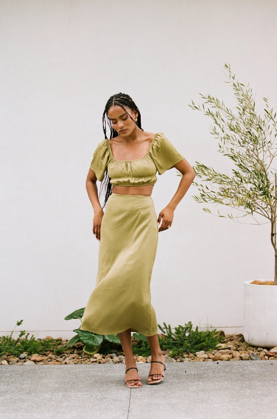 Dress It Up With Heels For Your Night Out! The Fiore Midi Skirt Is Made From A Lightweight Crepe Fabric In A Khaki Hue. It Is A High Waisted Style With A Split At Centre Back. Get The Look With The Fiore Top! Designed Exclusively By Sabo.