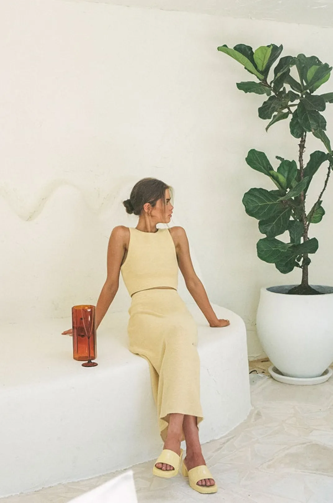 Wear It As A Set Or Pair It Back With Jeans! The Heather Knit Top Is Made From A Natural Cotton Knit In A Dusty Yellow Hue. It Features Tank Sleeves, High Rounded Neck And Cropped Length. Get The Look With The Heather Knit Skirt! Designed Exclusively By Sabo.