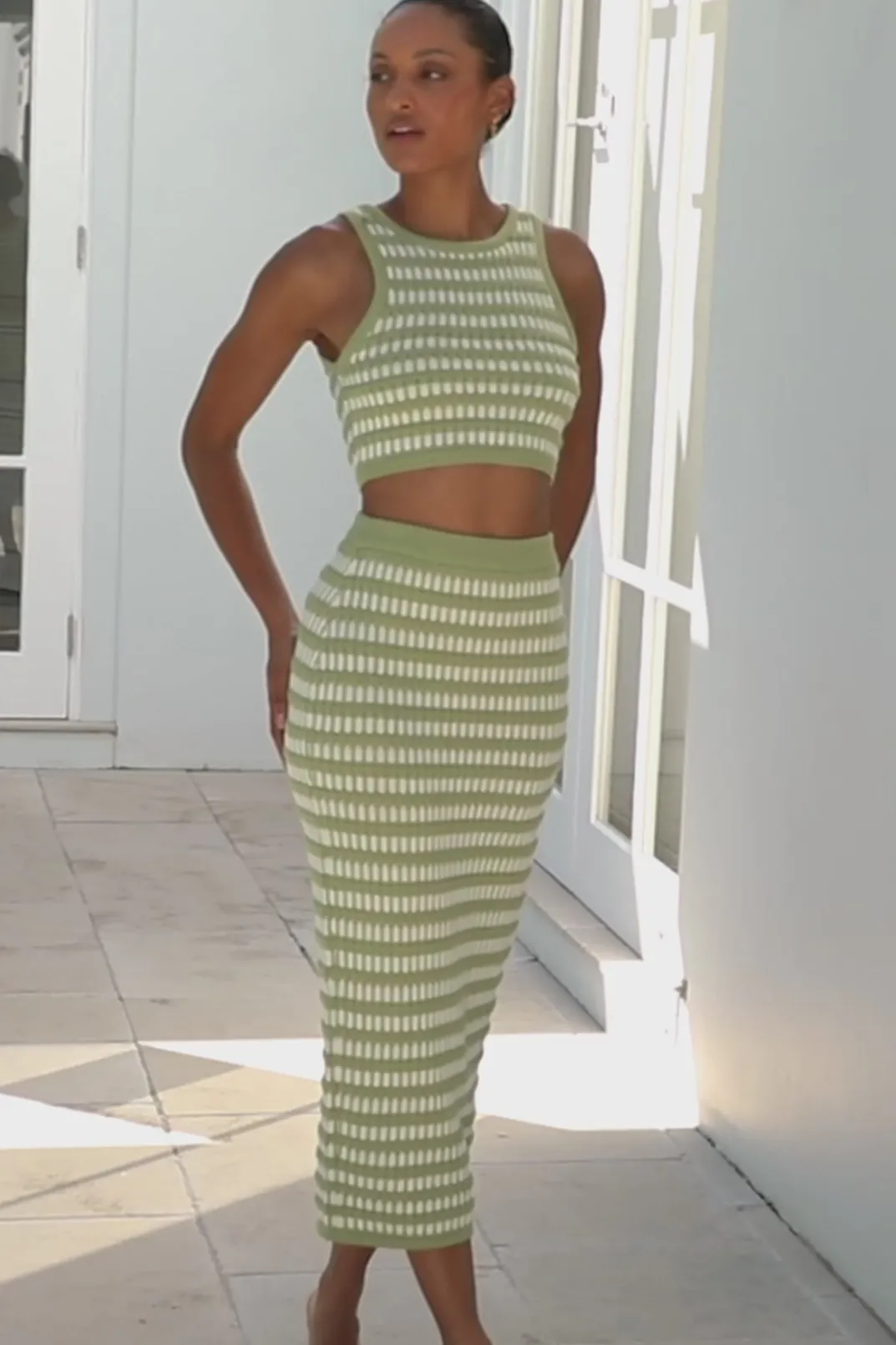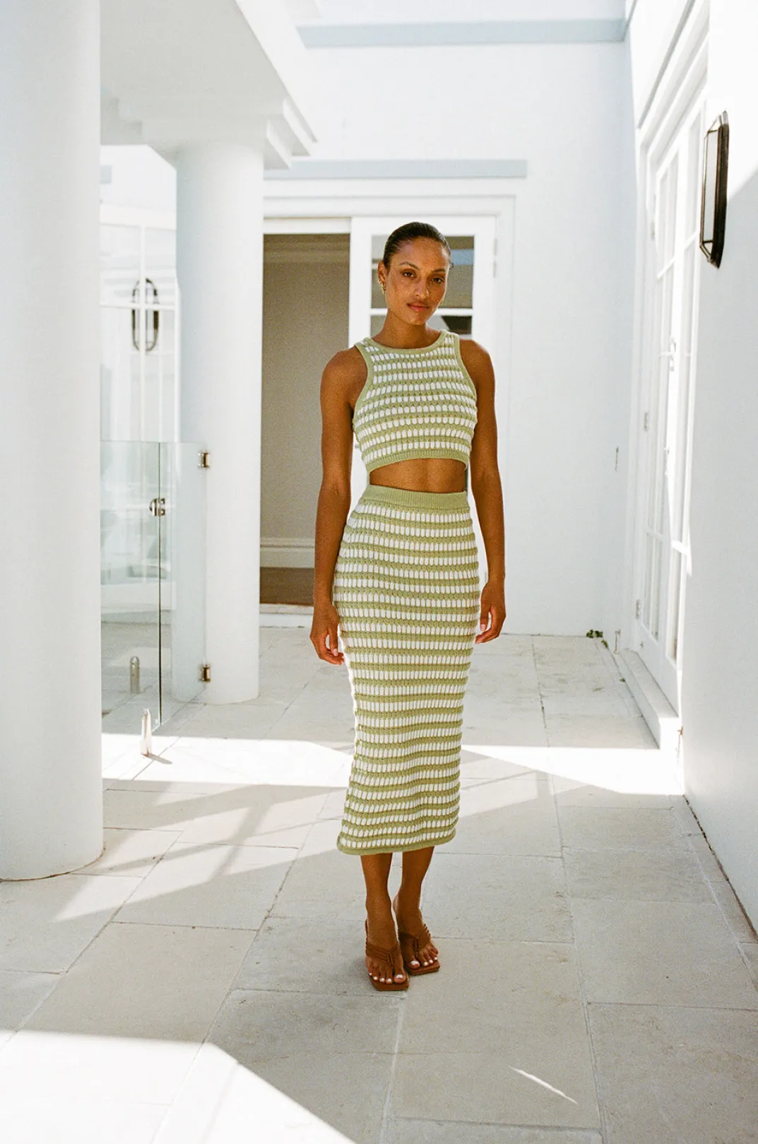 Our Favourite Heather Skirt Now In A Fun New Vintage Inspired Sage And White Textured Knit Fabric! It Is A High Waisted Style Featuring An Elasticated Waist And A Midi Length Skirt Finished With A Ribbed Trim At Hem. Get The Set With The Heather Top Or Mix And Match With Thekeyana Knit Top! Designed Exclusively By Sabo.
