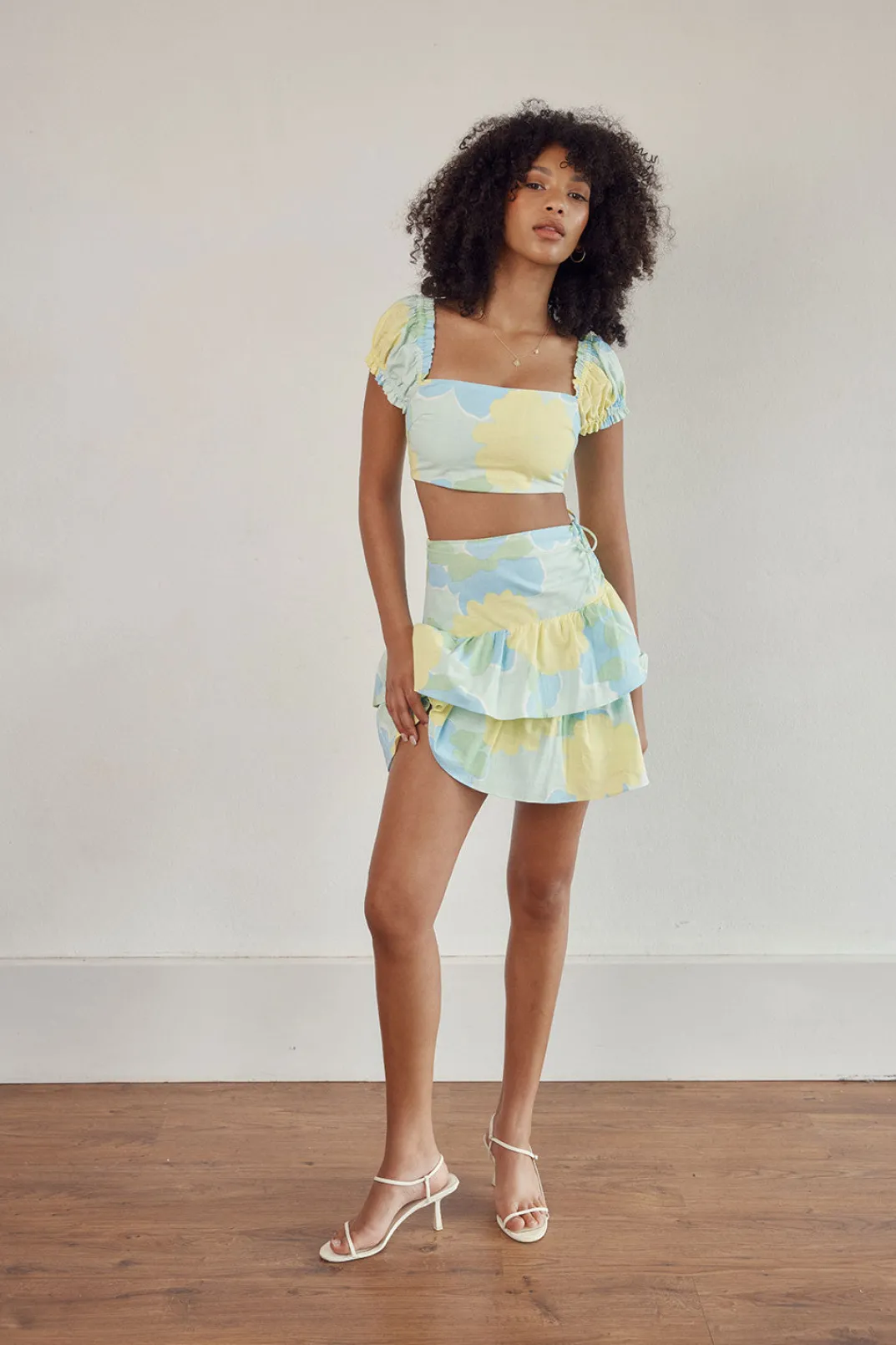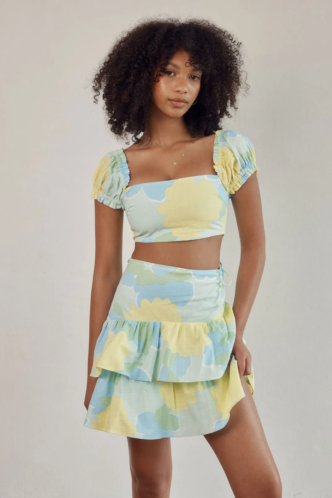 Perfect For Party Season! The Jamila Skirt Is Made From A Structured Natural Cotton Slub Fabric With Our Exclusive New Flutter Green Print. It Is A High Waisted Style Featuring A Fitted Asymmetric Panel At Hips With Draw Detail At Side And A Layered Flouncy Skirt. Get The Look With The Jamila Top! Designed Exclusively By Sabo.