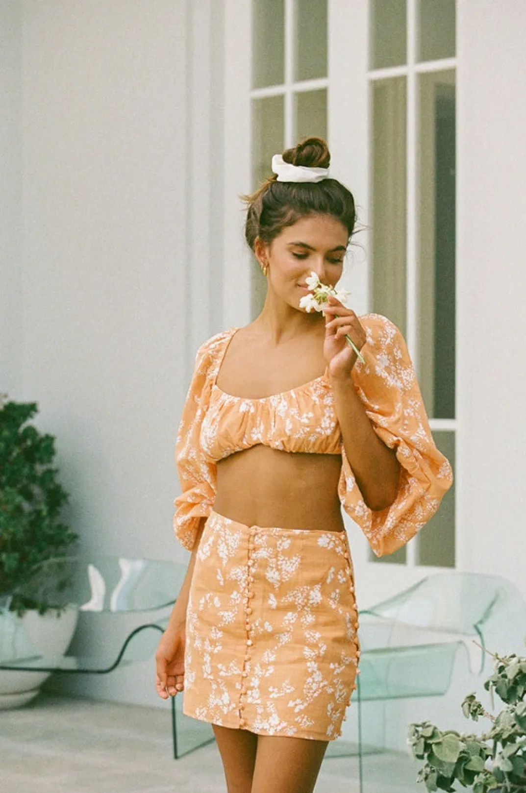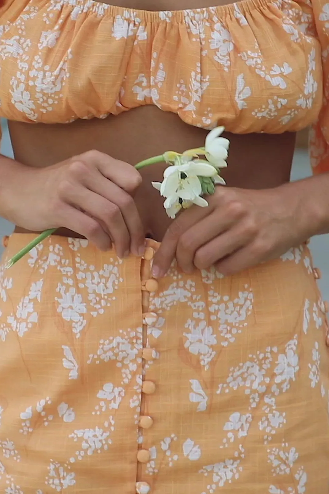 *This Is A Final Sale Item* The Pop Of Colour For The Summer Weather! The Jazmin Skirt Is Made From An Orange Cotton Cheesecloth Fabric With Our Exclusive Speck Floral Print Throughout. It Is A High Waisted Style Featuring Covered Button Detailing At Sides And Centre. Pair With The Jazmin Top For Your Next Night Out! Exclusively Designed By Sabo.