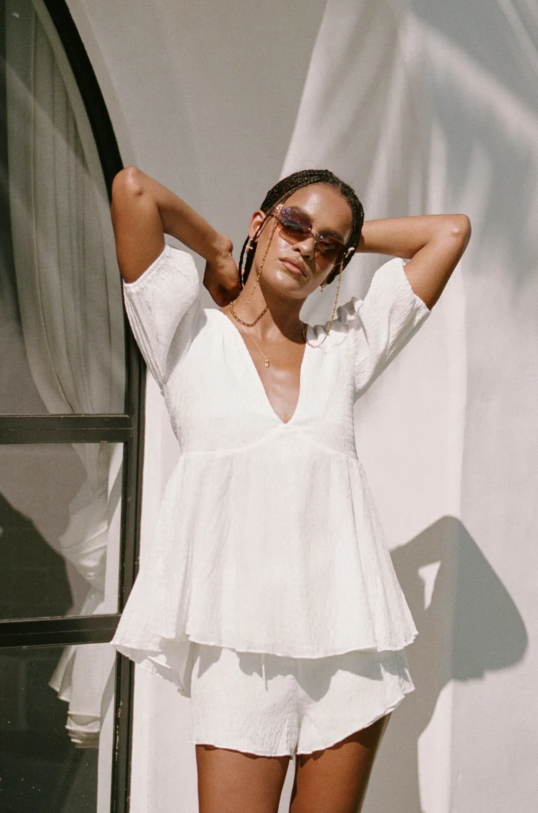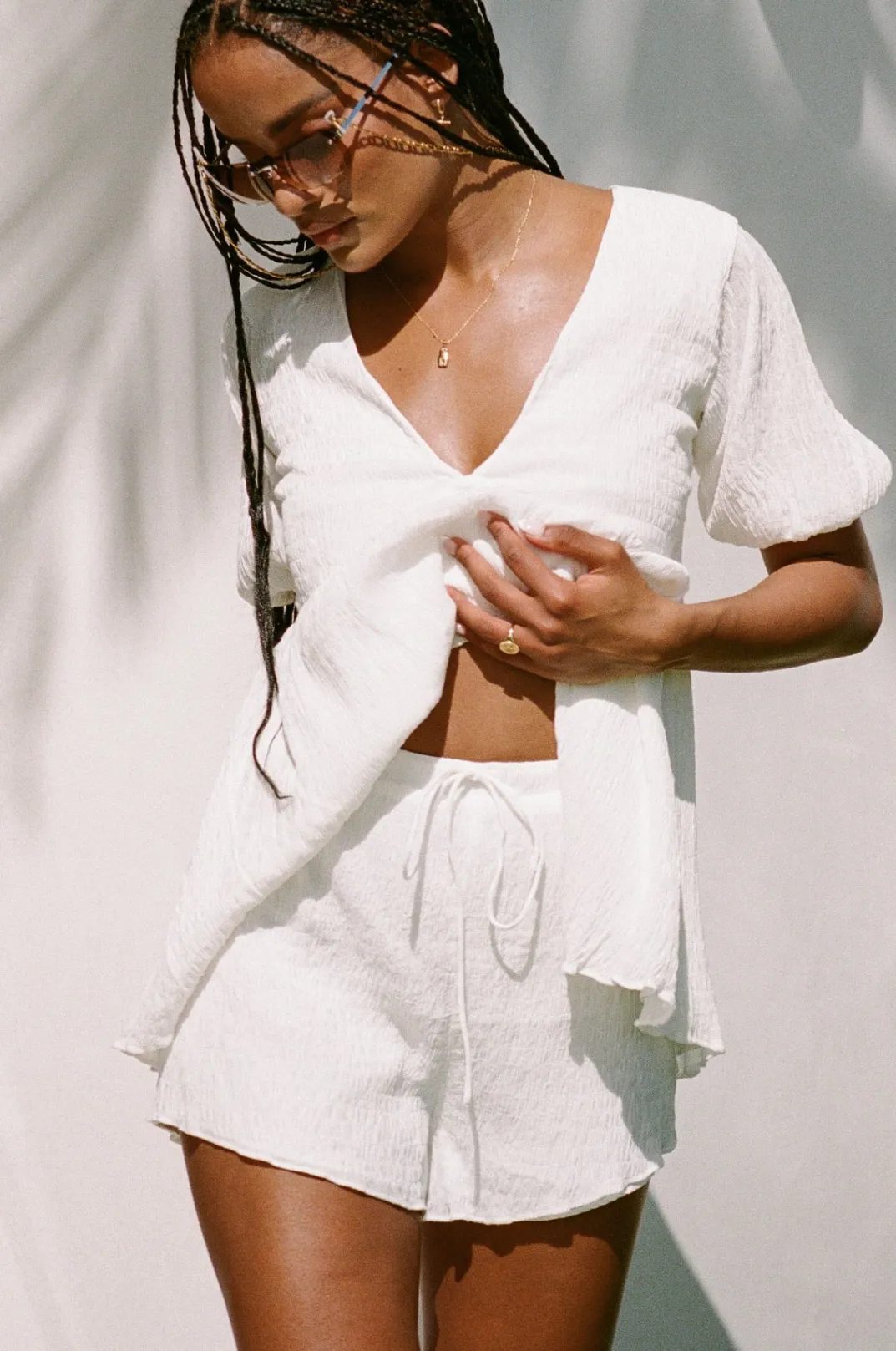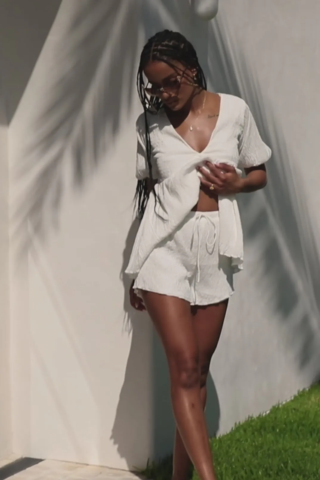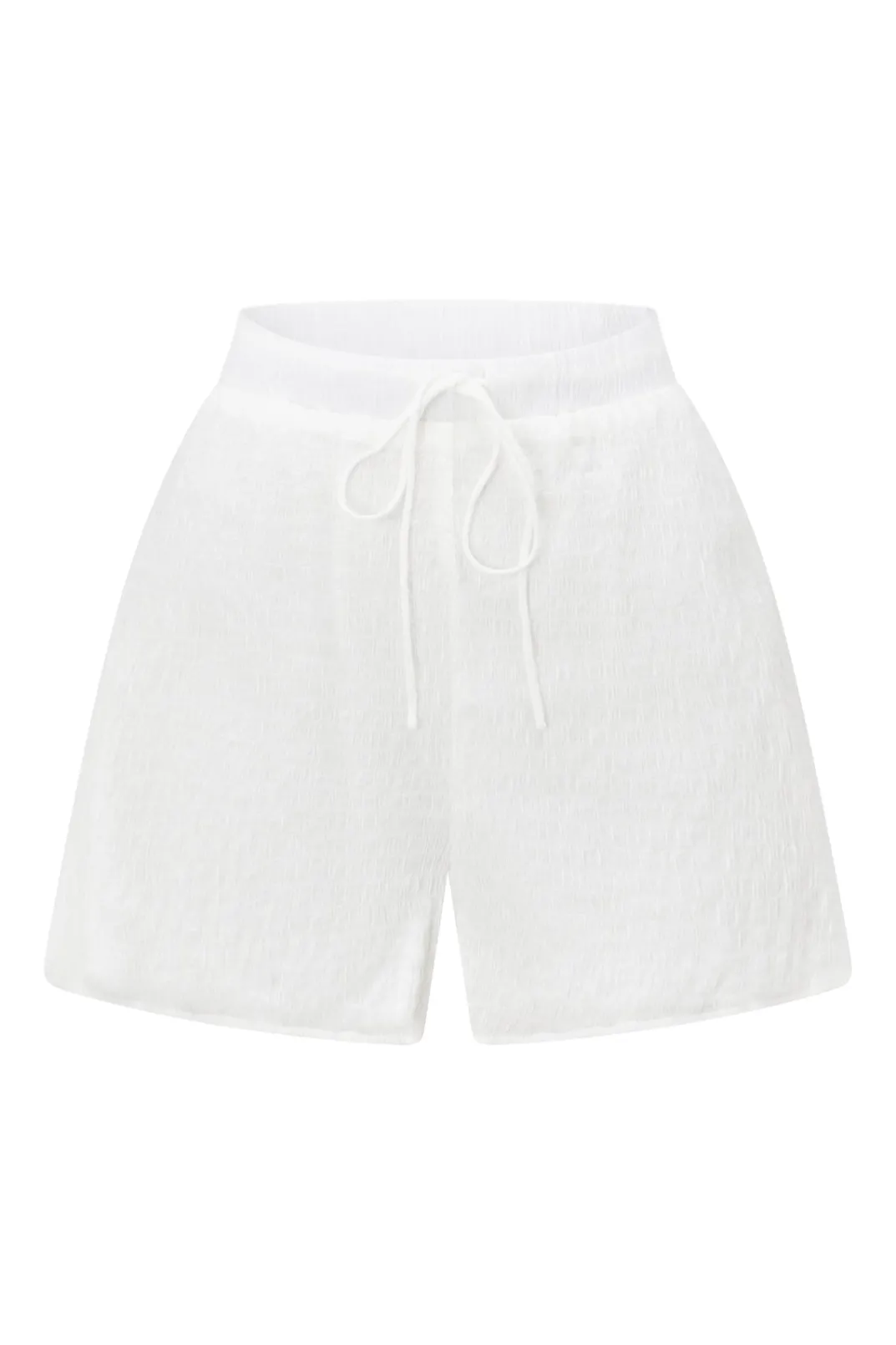 Take It From The Beach To The Bar, The Journee Shorts Are Made From A Lightweight Textured Crepe Fabric In White. They Are A High Waisted Style Featuring An Elasticated Waist With Drawstring And High Low Hems. Get The Look With The Journee Top! Designed Exclusively By Sabo.