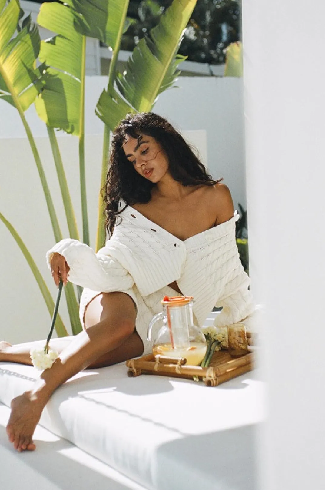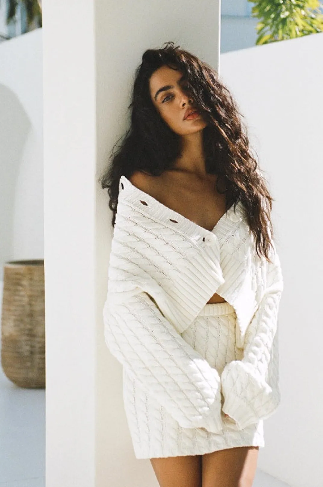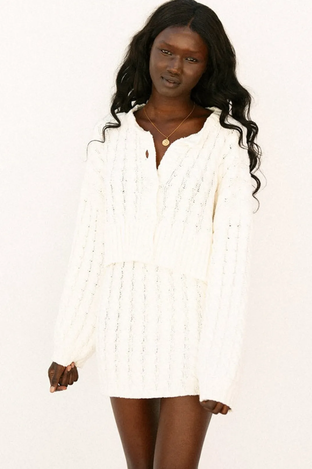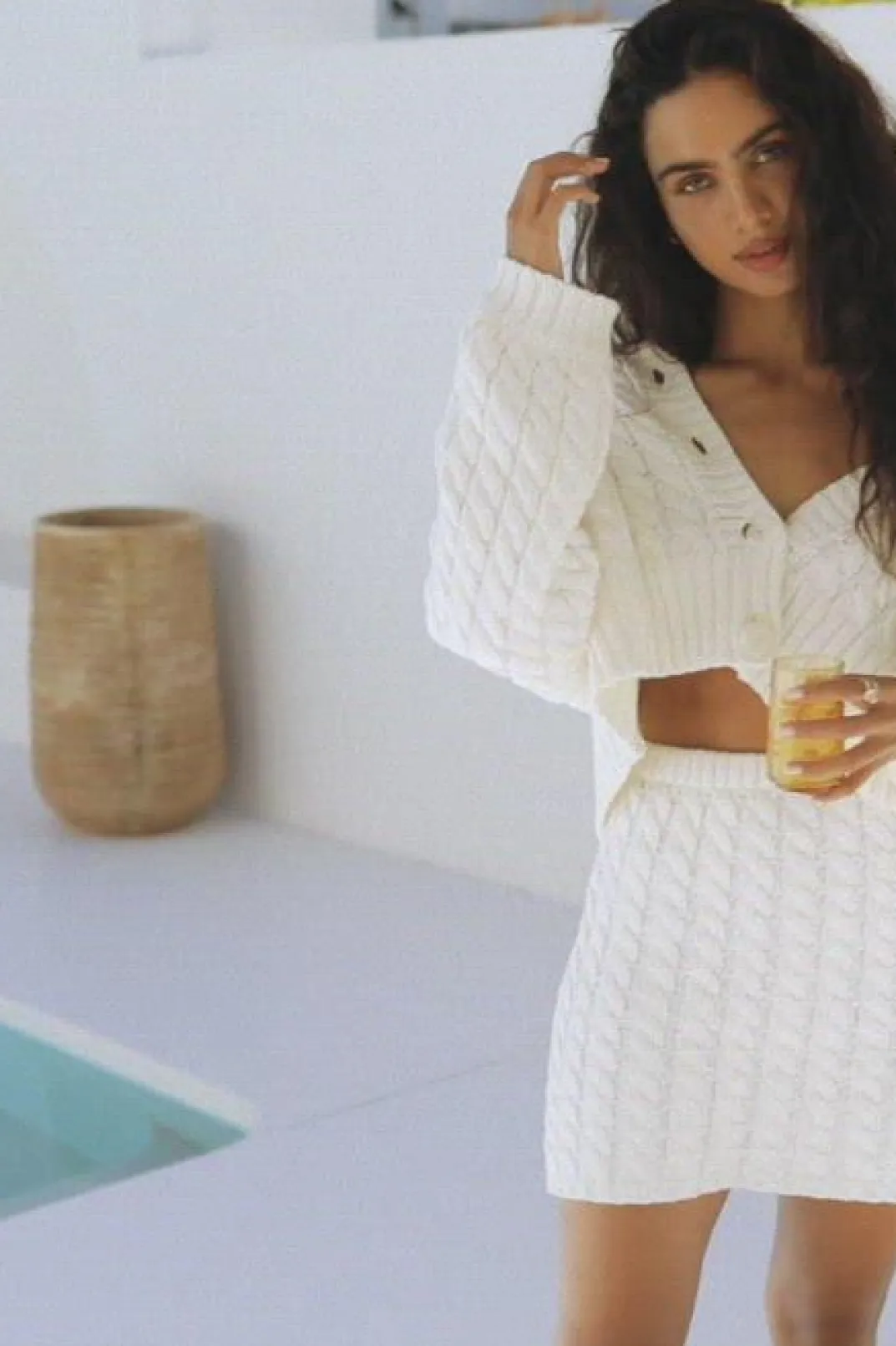 *This Is A Final Sale Item* The 90’s Inspired Kiko Cable Skirt Is Made From A Cable Knit In A Cream Hue. It Is A High Waisted Style Featuring A Ribbed Waistband And Mini Length. Pair With The Kiko Cable Cardi And 18K Kleo Huggie Hoops For A Cute Clueless Inspired Look! Exclusively Designed By Sabo.