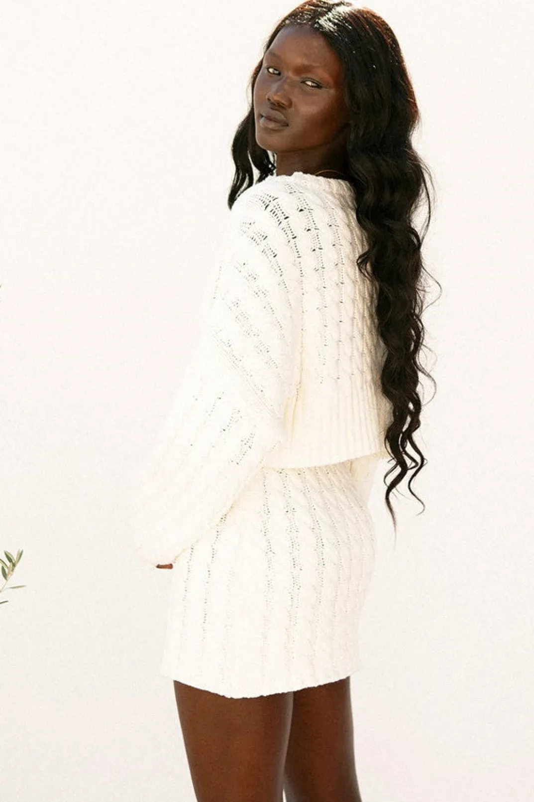 *This Is A Final Sale Item* The 90’s Inspired Kiko Cable Skirt Is Made From A Cable Knit In A Cream Hue. It Is A High Wa…