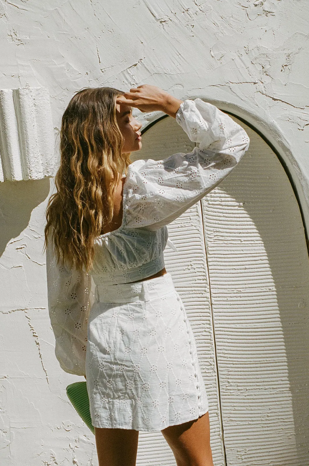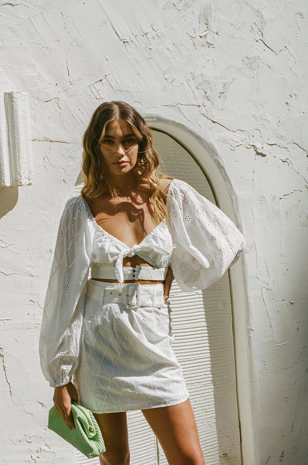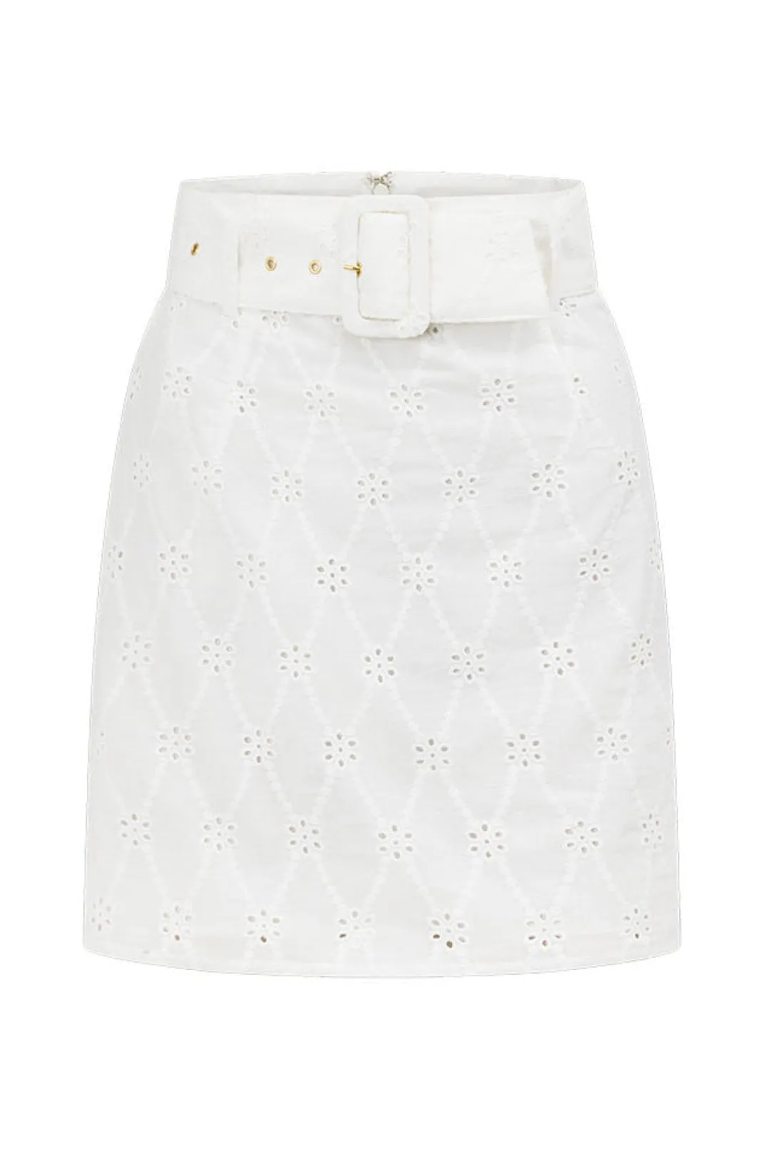 *This Is A Final Sale Item* A Flattering Shape In The Most Luscious Intricate Fabric! The La Lupa Skirt Is Made From A Stunning Natural White Cotton Broiderie Fabric With Organza Trims. It Is A High Waisted Style Featuring A Matching Wide Belt. Get The Set With The La Lupa Top And Petal Necklace! Designed Exclusively By Sabo.