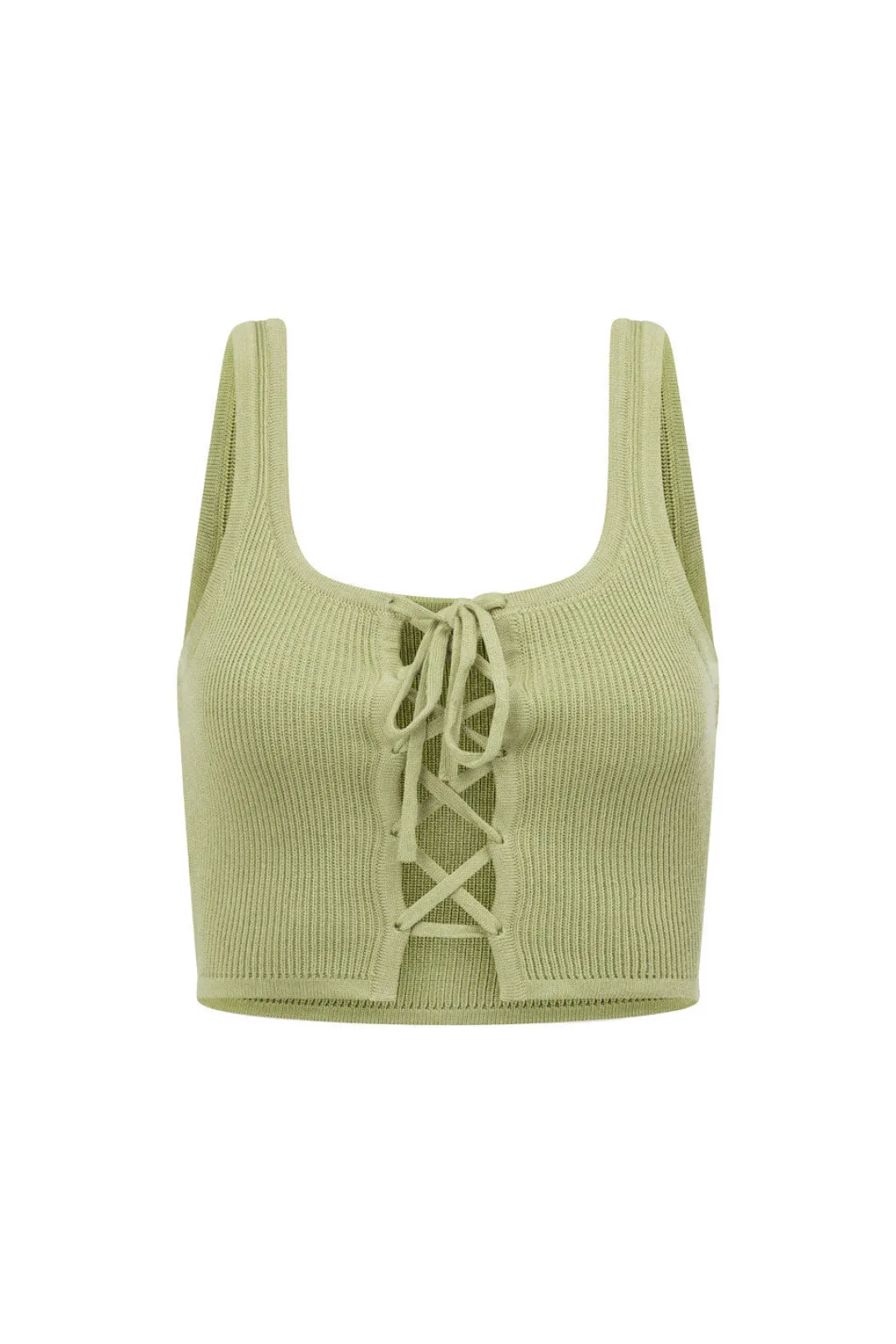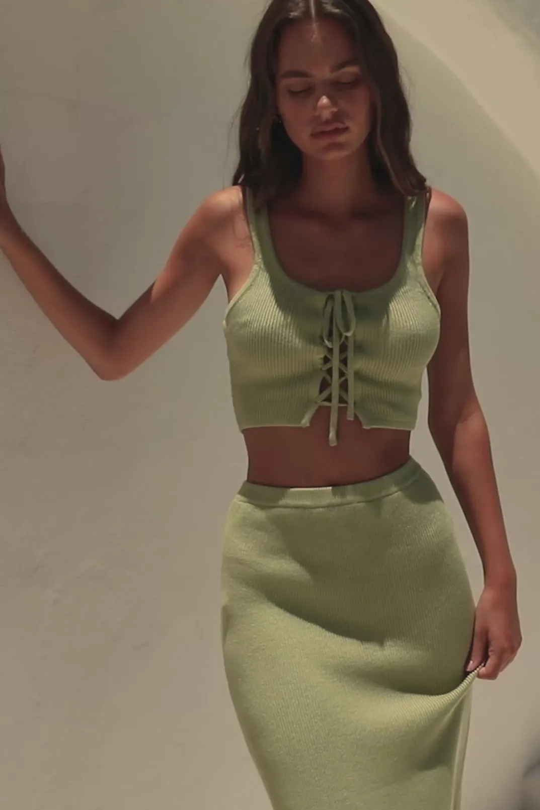 Wear It As A Set Or Pair It With Your Favourite Jeans! The Leander Top Is Made From A Ribbed Knit Fabric In A Green Hue. It Features Contrast Bind Trims, Cropped Hem And Cutout At Centre Front With Lace Up Detail. Get The Look With The Leander Skirt! Designed Exclusively By Sabo.