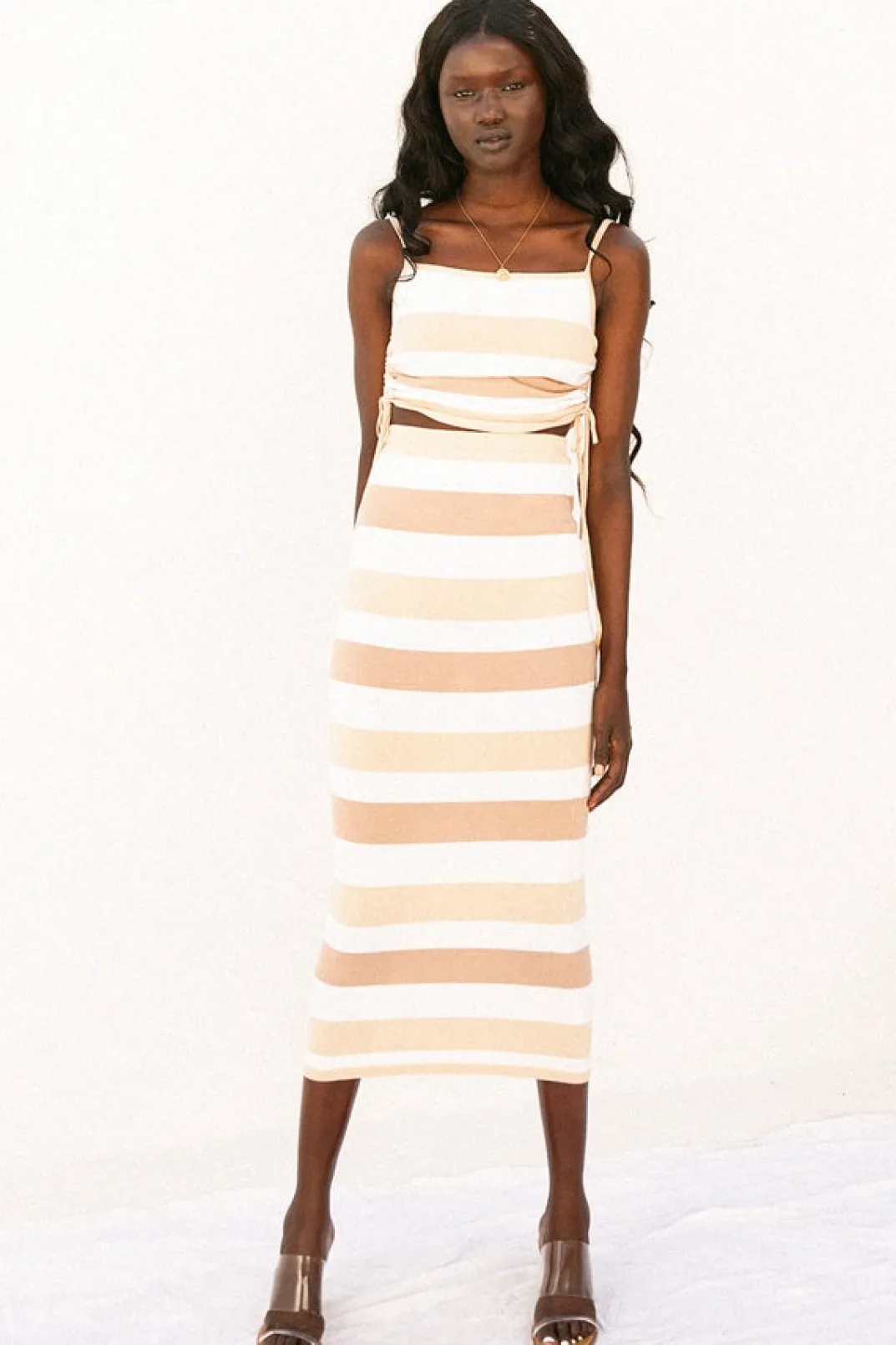 *This Is A Final Sale Item* *Back In Stock* Wear It As A Set Or Style It Your Way! The Leti Top Is Made From A Natural Knitted Cotton Fabric With White, Beige And Tan Stripes Throughout. It Features A Straight Neckline, Thin Straps And Adjustable Draw Detailing At Sides. Complete The Look With The Leti Skirt And Oak Sandals! Exclusively Designed By Sabo.