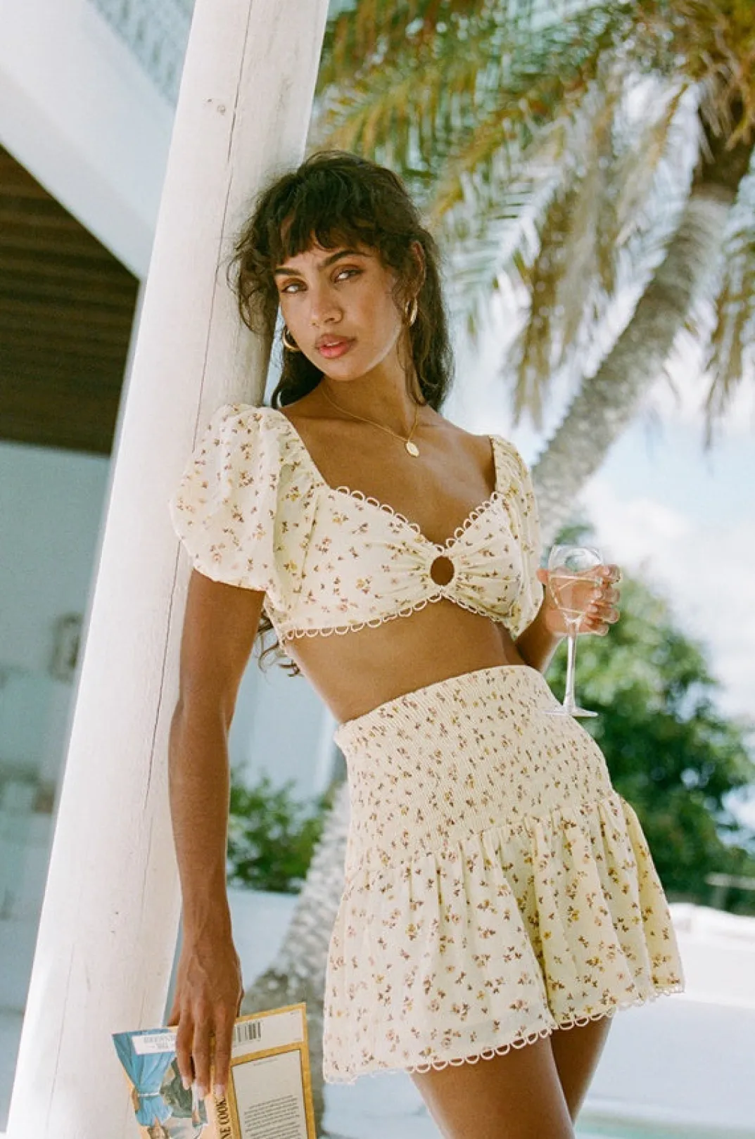 *This Is A Final Sale Item* Feminine Vibes In The Lexa Skirt, Made From A Natural Cotton Blend Fabric In A Yellow Hue. It Is A High Waisted Style Featuring A Floral Print, Shirred Waist, Flouncy Skirt And Loop Trim Detailing Across Hem. Pair With The Lexa Top! Exclusively Designed By Sabo.
