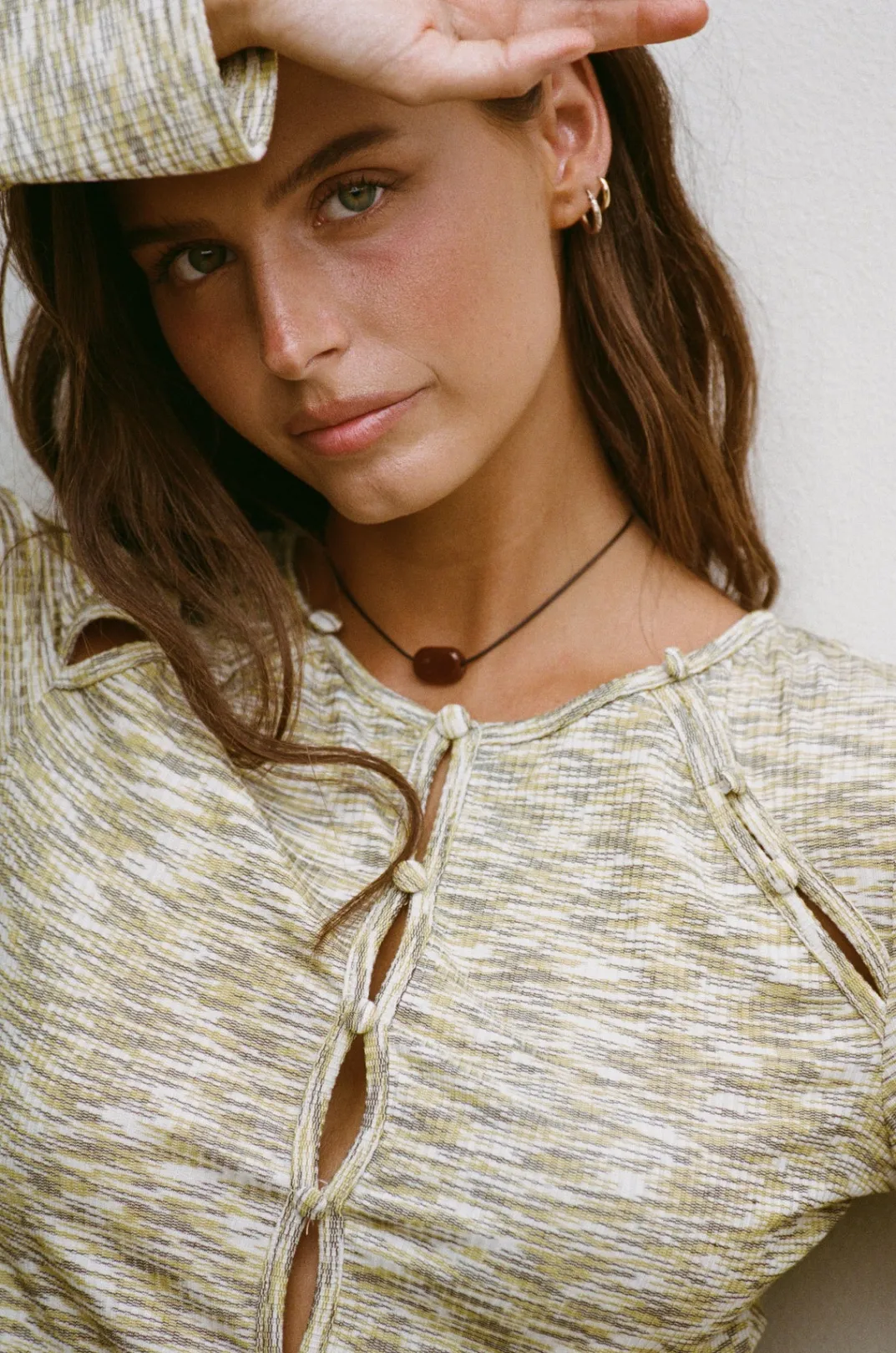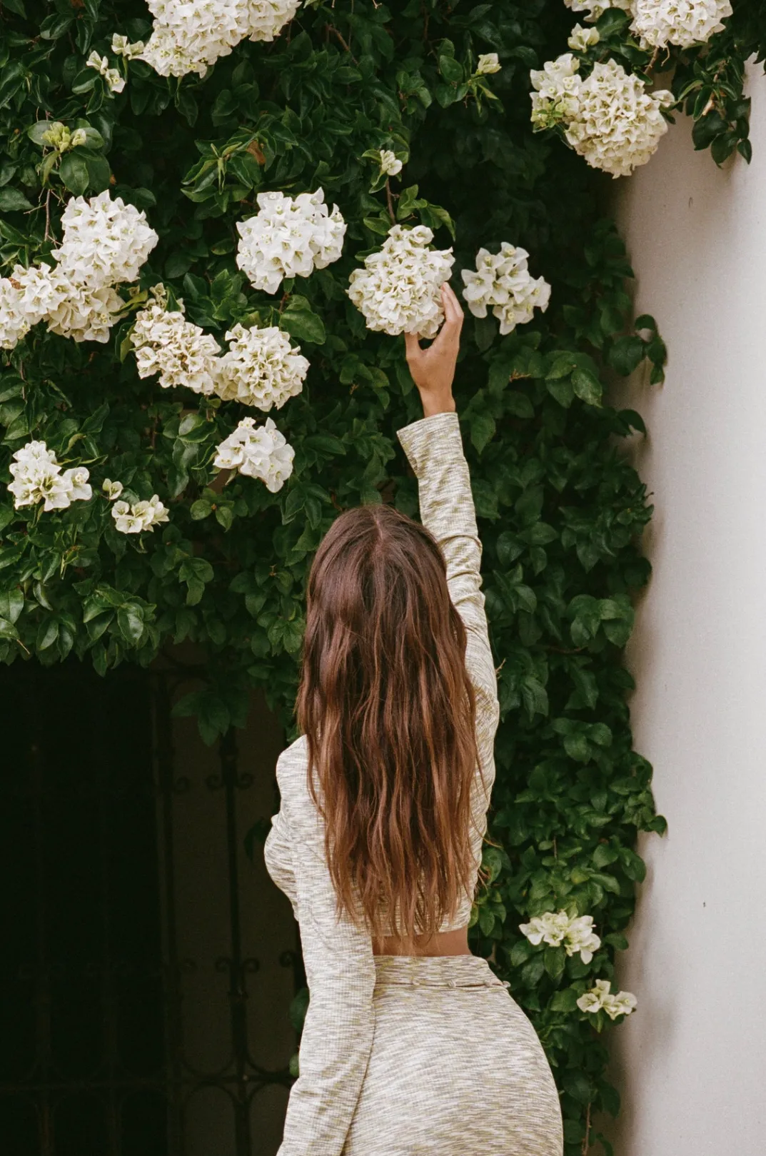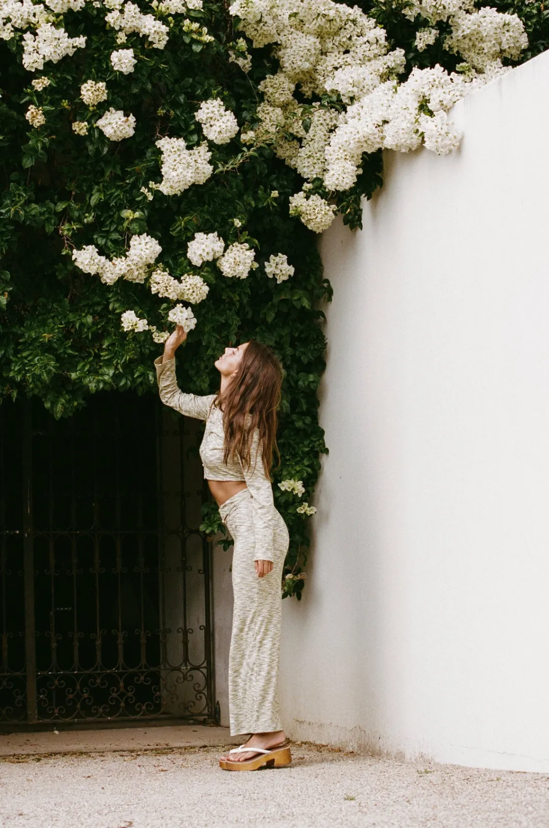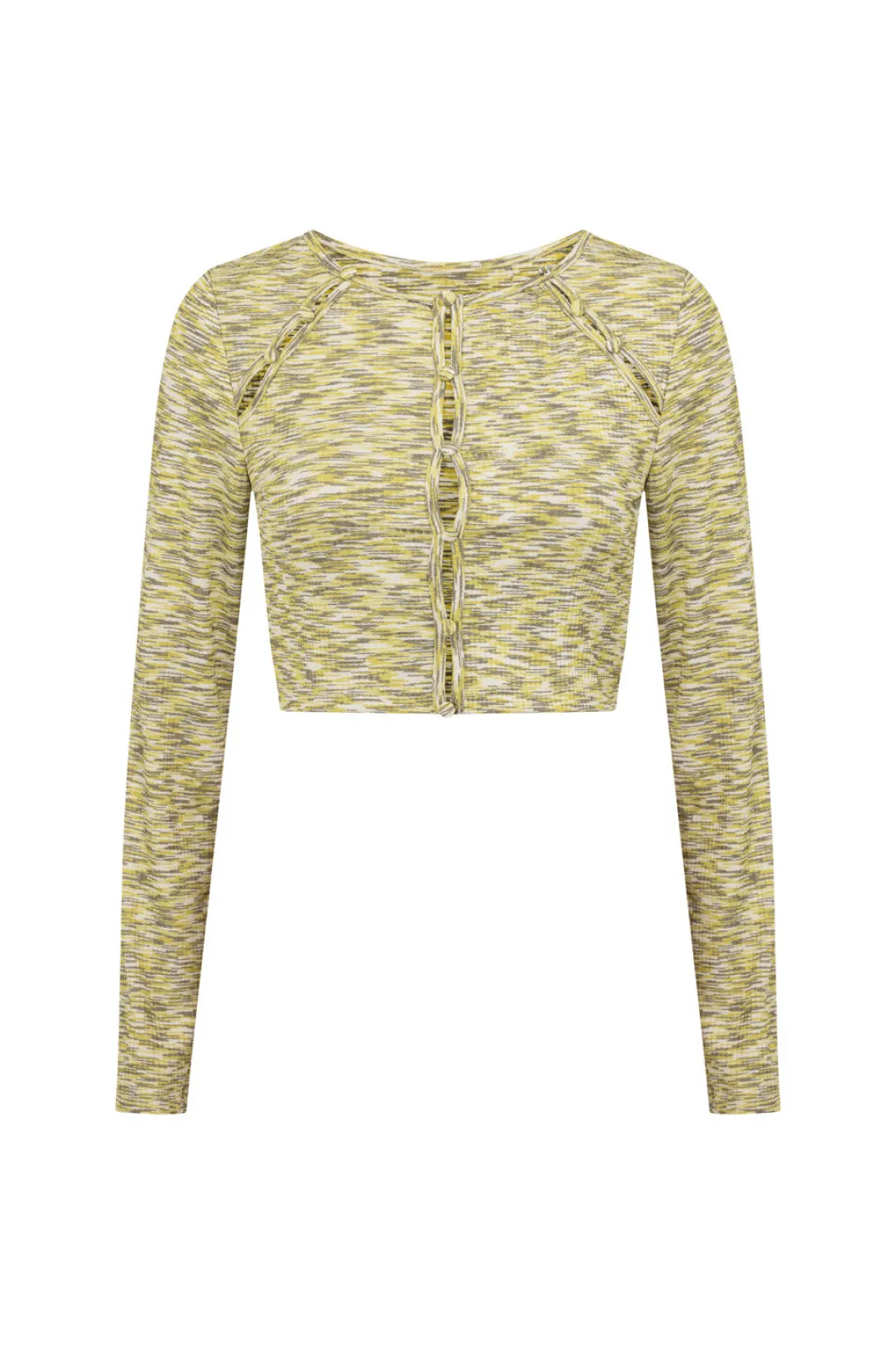 Wear It As A Set Or Pair It Back With Jeans! The Martinique Top Is Made From A Lightweight Ribbed Fabric In A Green And White Marl. It Is A Cropped Style Featuring Full Length Sleeves And Buttons Down Centre Front. Get The Set And Pair With The Martinique Midi Skirt! Designed Exclusively By Sabo.