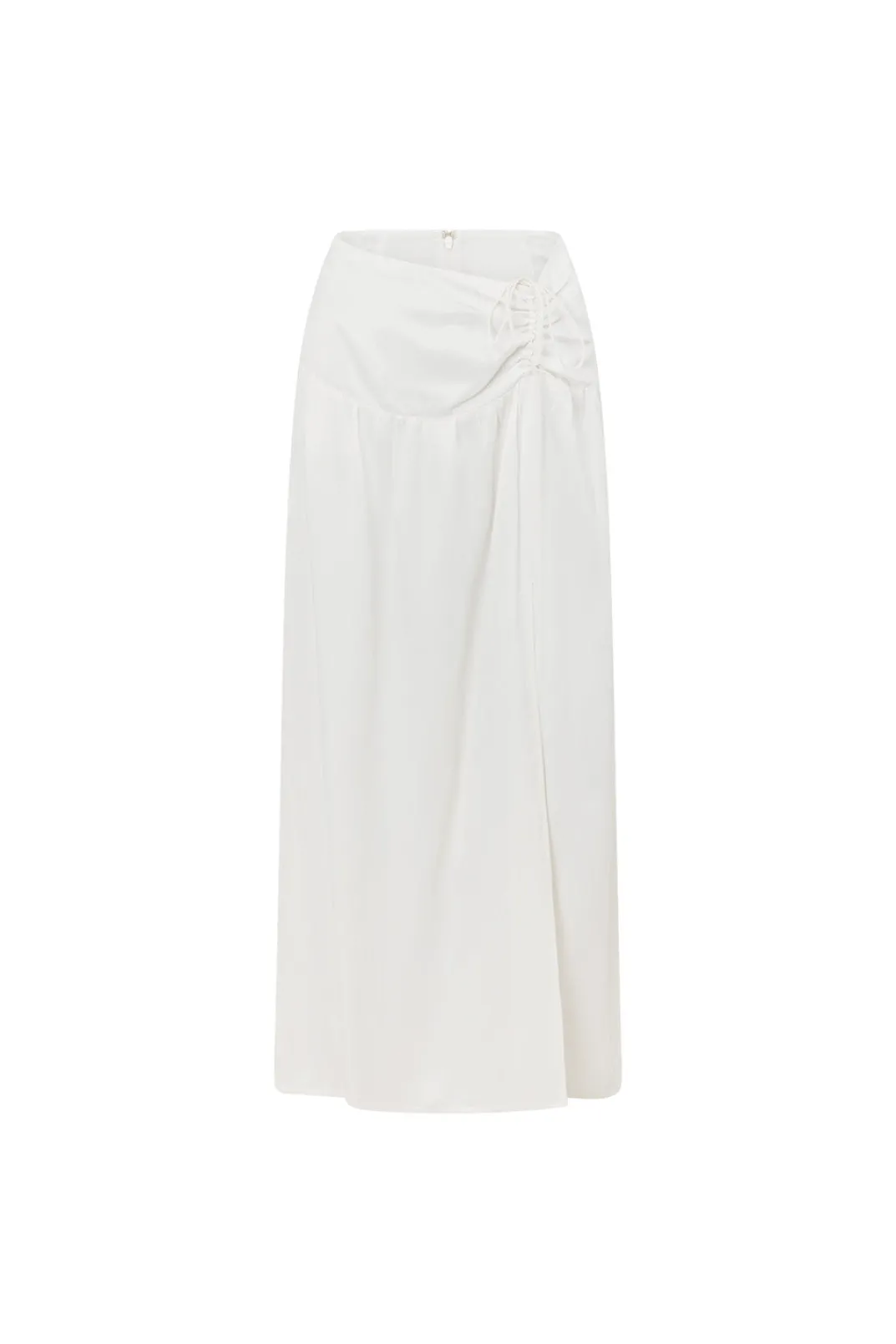 The Dreamymiranda Skirt Is Made From A Silky White Fabric And Features A Wide Waist Panel With Draw Detail At Side And A…