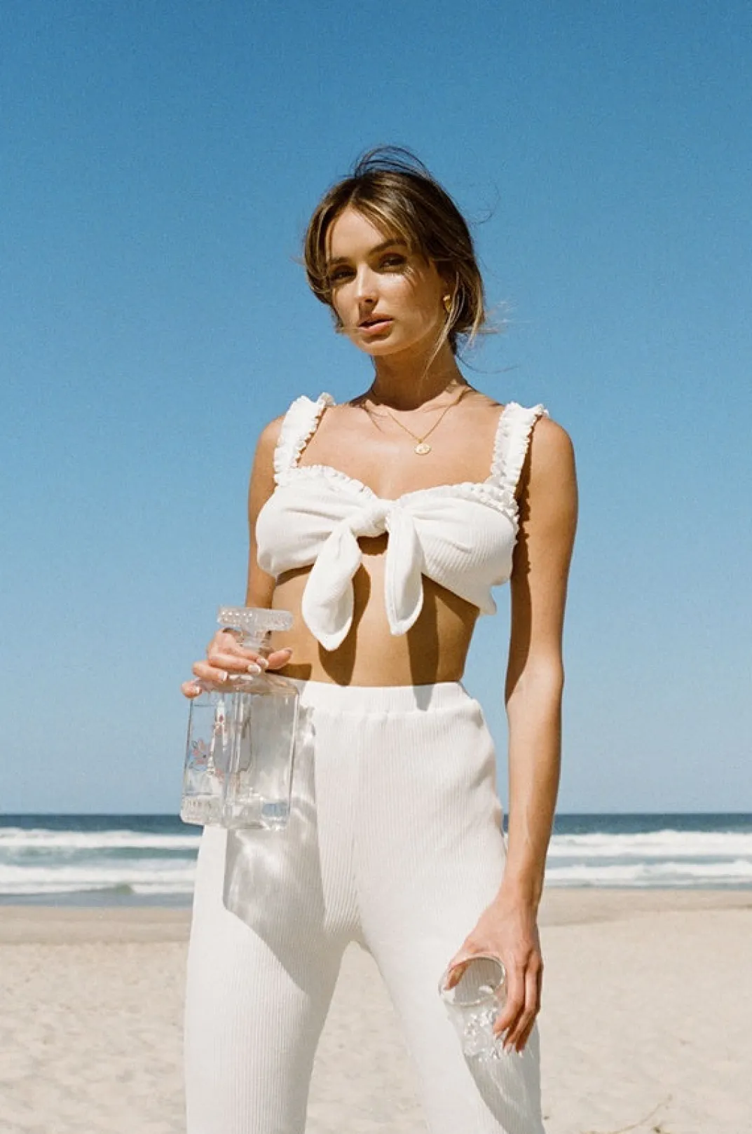 *This Is A Final Sale Item* Inspired By Spanish Summer Nights, The Morena Top Is Made From A Natural Cotton Blend Ribbed Fabric In An Off White Hue. It Is A Cropped Style Featuring A Tie At Centre Bust And Ruffle Detailing On Straps And Across Neckline. Pair With The Morena Pants, 18K Femme Necklace And Round Bamboo Bag! Exclusively Designed By Sabo.