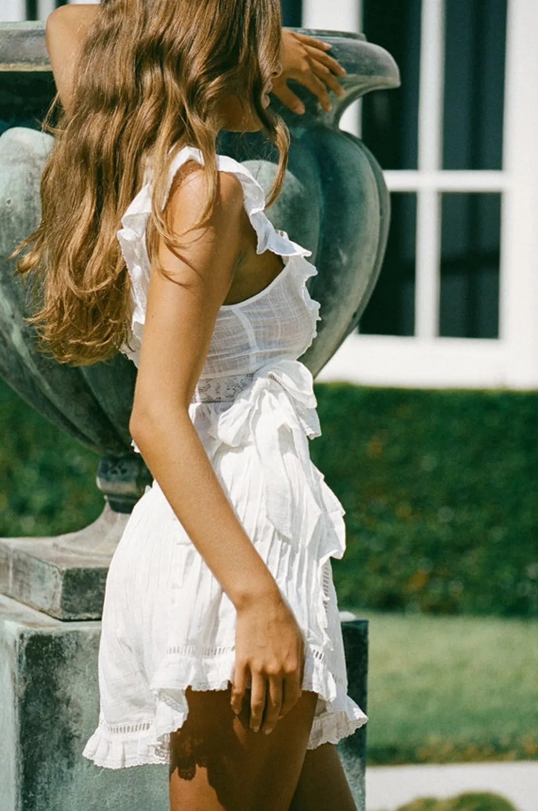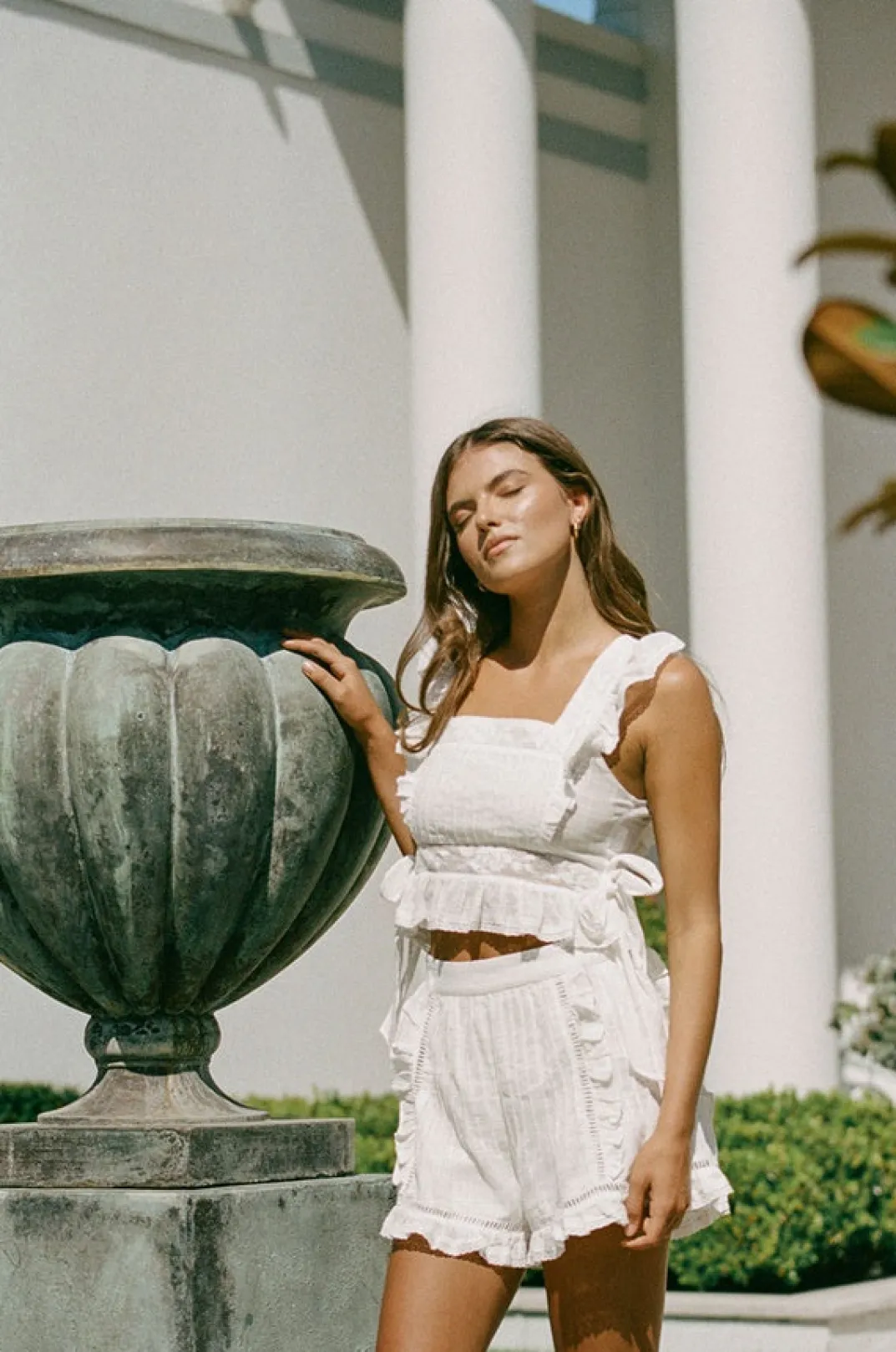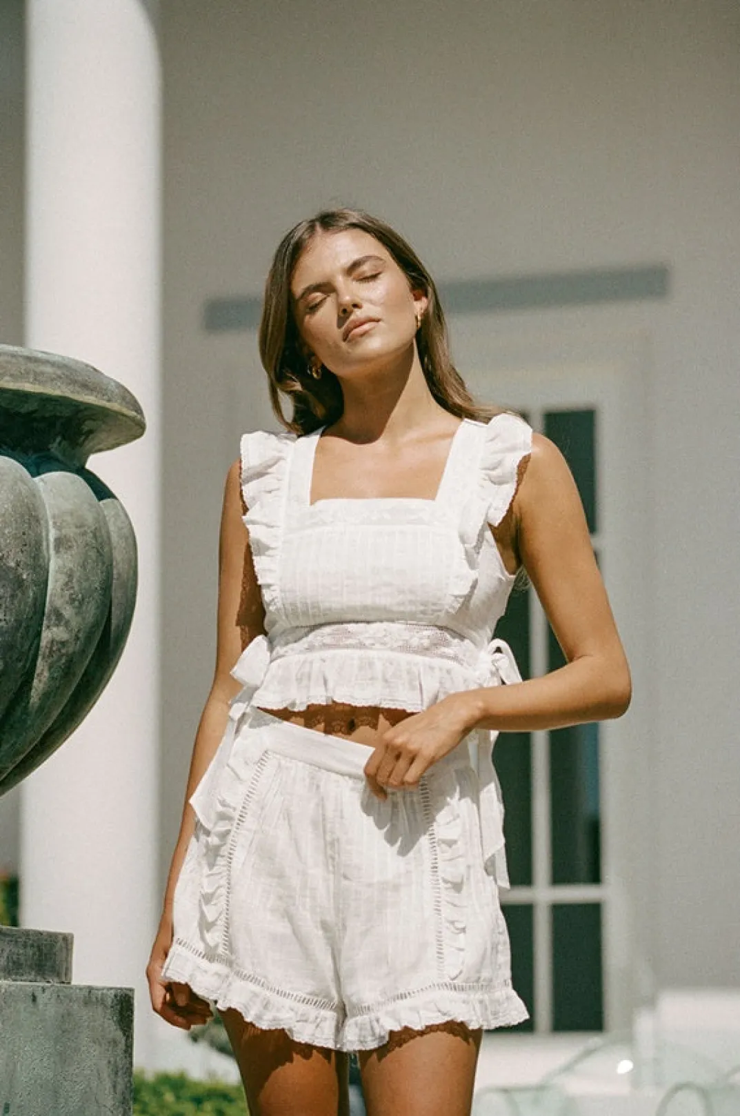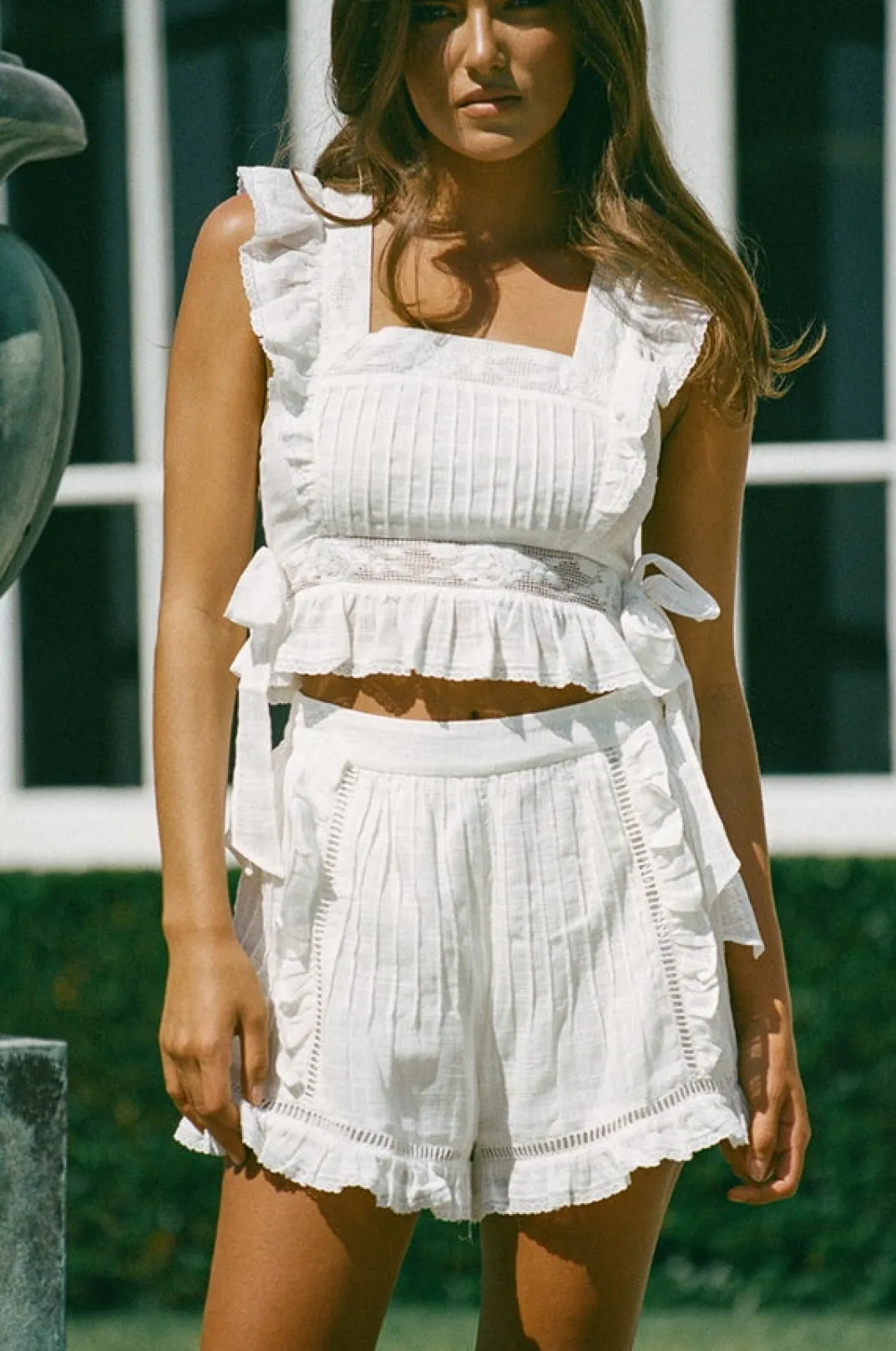 *This Is A Final Sale Item* A Staff Hq Favourite! The Nieve Shorts Are Made From A High Quality Natural Cotton Cheesecloth Fabric In An Off White Hue. They Are A High Waisted Style Featuring Pintucks, High-Low Hems And Lace, Ladder And Frill Detailing Throughout. Complete The Look With The Nieve Top! Designed Exclusively By Sabo.