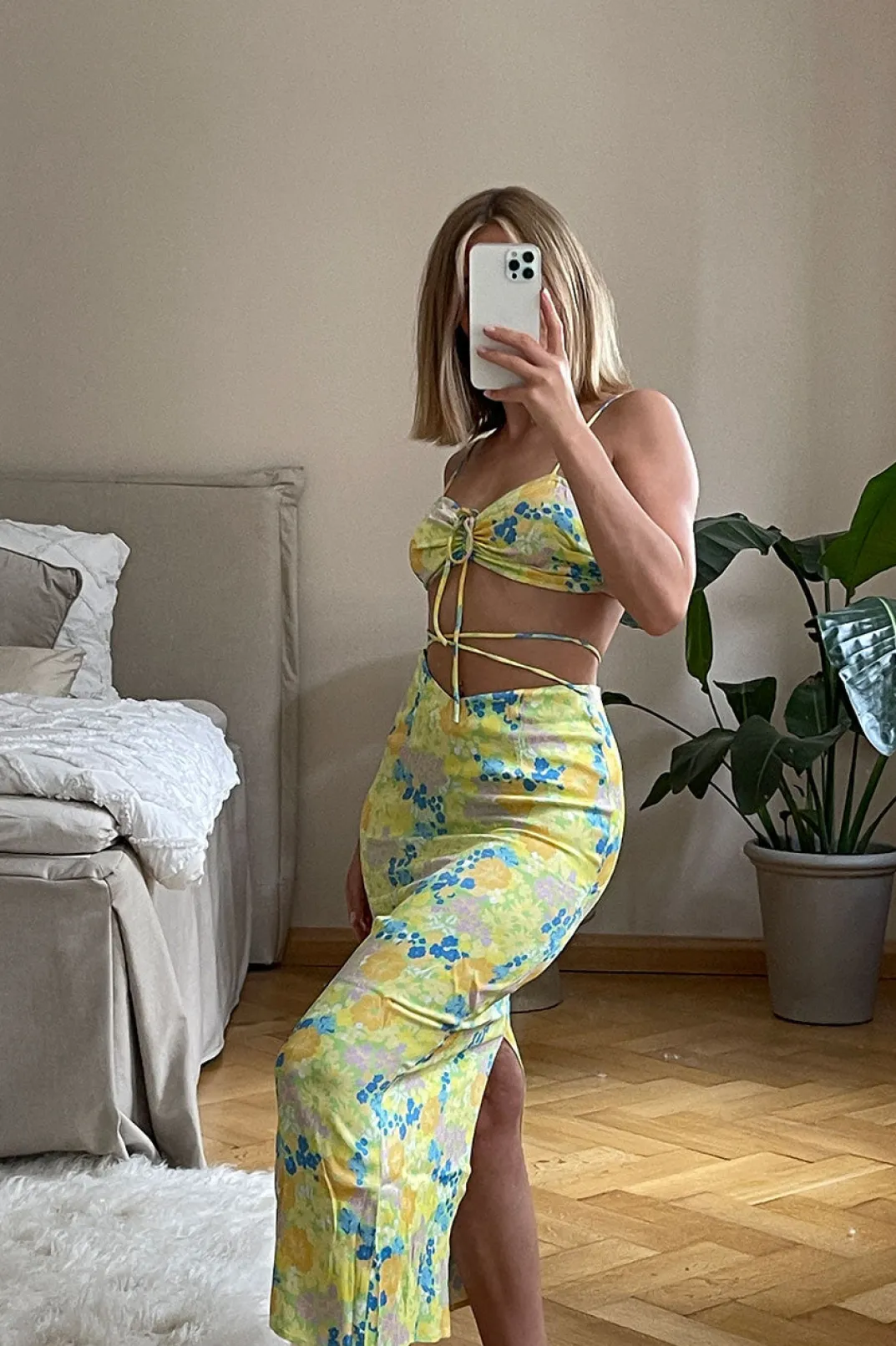 *This Is A Final Sale Item And Cannot Be Returned. See Our Returns Policy Here One Of Our Sabo X Phiaka Collection Favourites! The Noelia Midi Skirt Is Made From A Luscious Satin Back Twill Fabric With Our Exclusive Florescence Print. It Is A High Waisted Midi Style Featuring A V Waist, Strappy Waist Tie Details And A Centre Back Split. Get The Set With The Noelia Draw Top! Designed Exclusively By Sabo.
