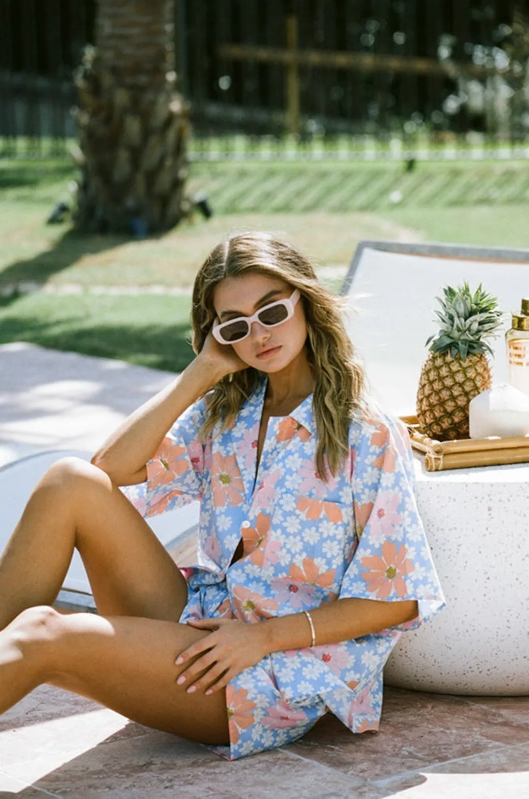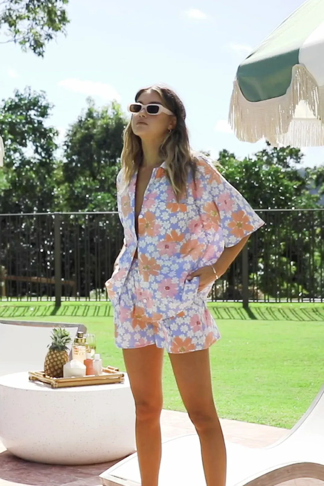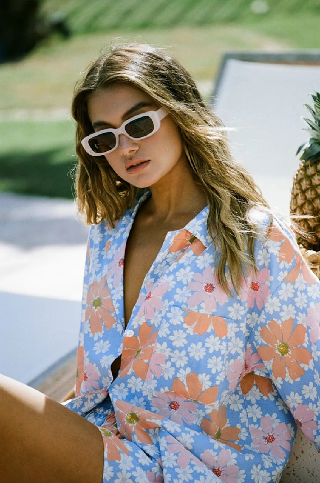 Get Vacation Vibes Whenever You Put On This Outfit! The Oli Top Is Made From A Structured Linen Cotton Blend Fabric With Our Exclusive Sky Floral Print. It Is A Relaxed Style Featuring 1/2 Length Sleeves, Single Breast Pocket, Buttons Down Centre Front And A Low Lapel Collar. Get The Look With The Oli Shorts And White Sandals! Designed Exclusively By Sabo.