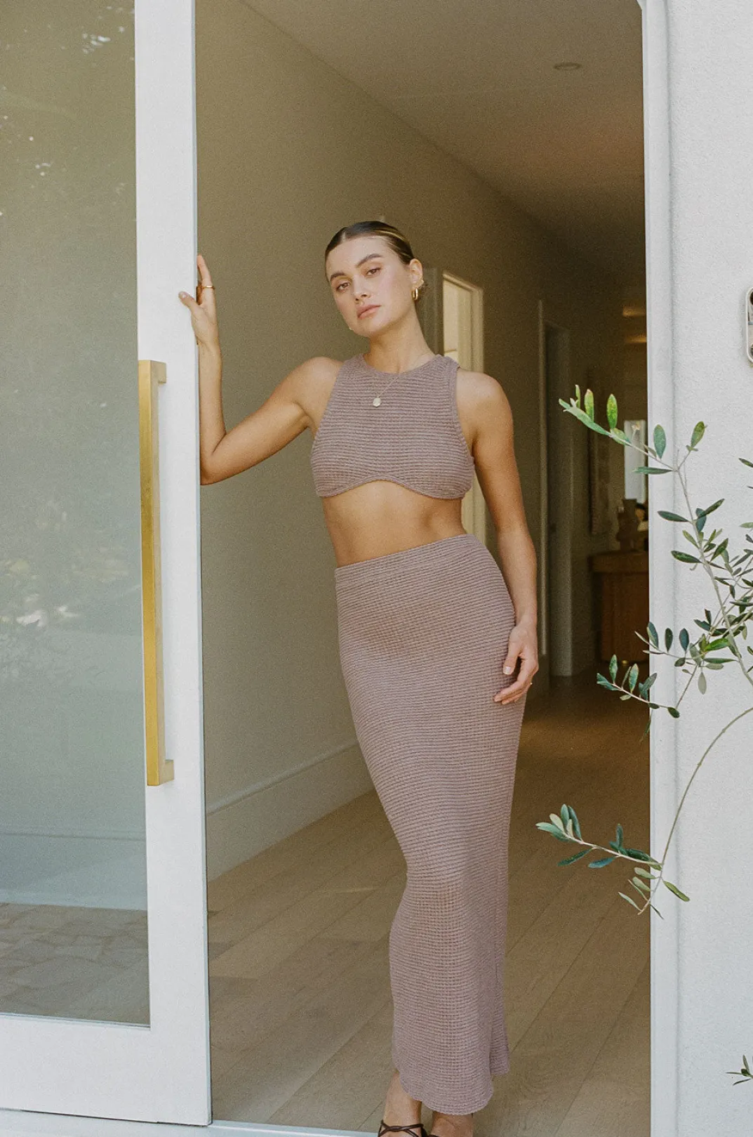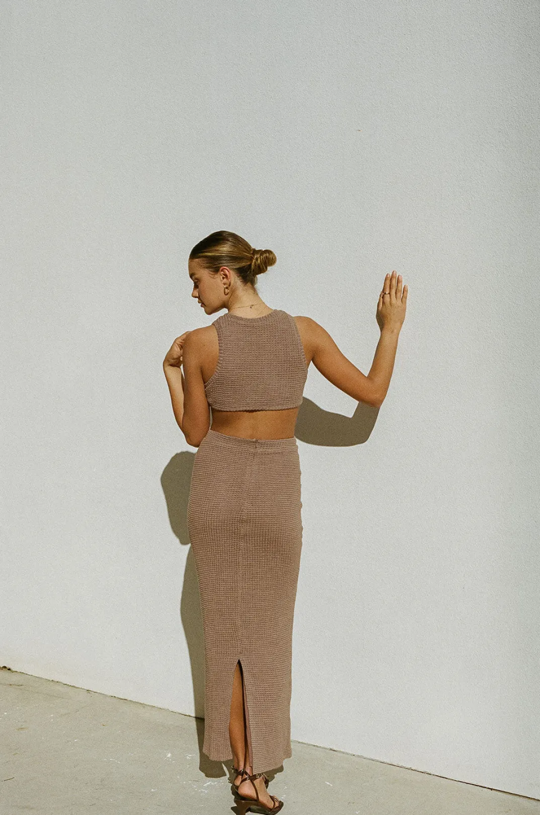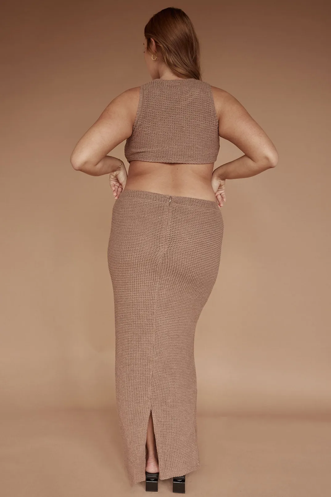 Designed To Contour, The Ollie Top Is Made From A Textured Fabric In A Brown Hue. It Is A Cropped Style Featuring A High Rounded Neckline, Ribbed Trims And Slight Curved Hem. Get The Look With The Ollie Skirt Or Style It With Jeans! Designed Exclusively By Sabo.