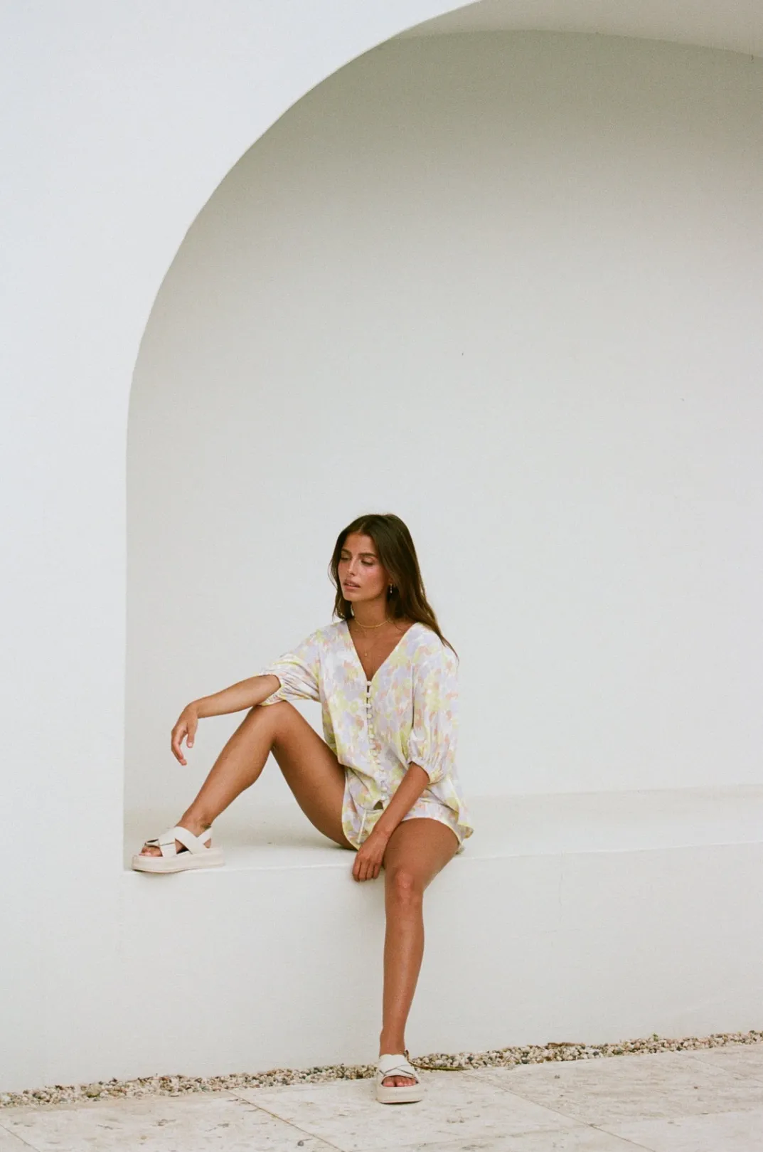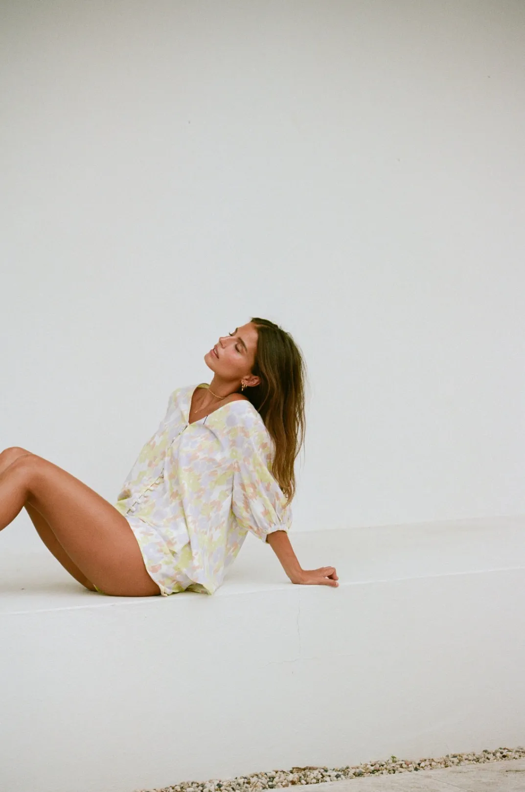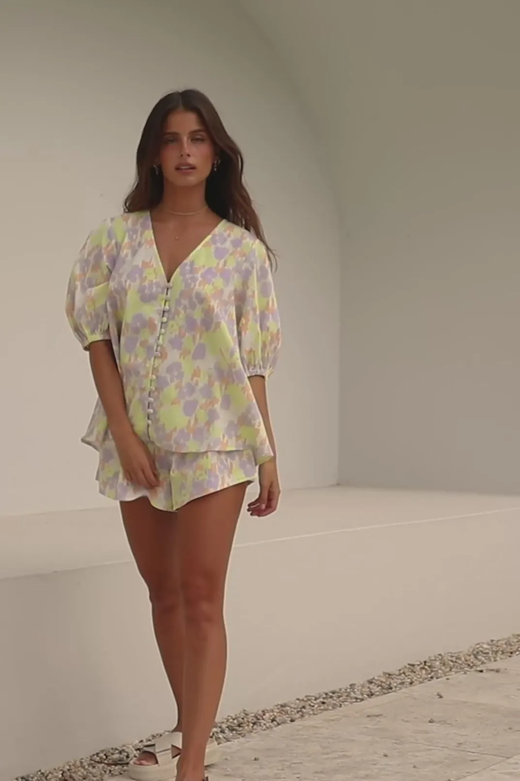 A Super Easy-To-Wear Vacation Must-Have! The Parklyn Puff Top Is Made From A High Quality Natural Cotton Slub Fabric With Our New Exclusive Smudge Ditzy Lime Print. It Is A Relaxed Style Featuring 1/2 Length Puff Sleeves And Covered Buttons At Centre Front. Get The Look With Theparklyn Shorts And Transparent Espadrilles! Designed Exclusively By Sabo.