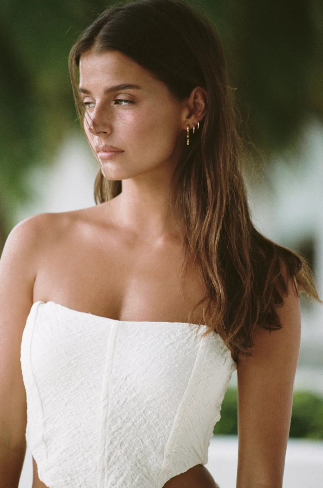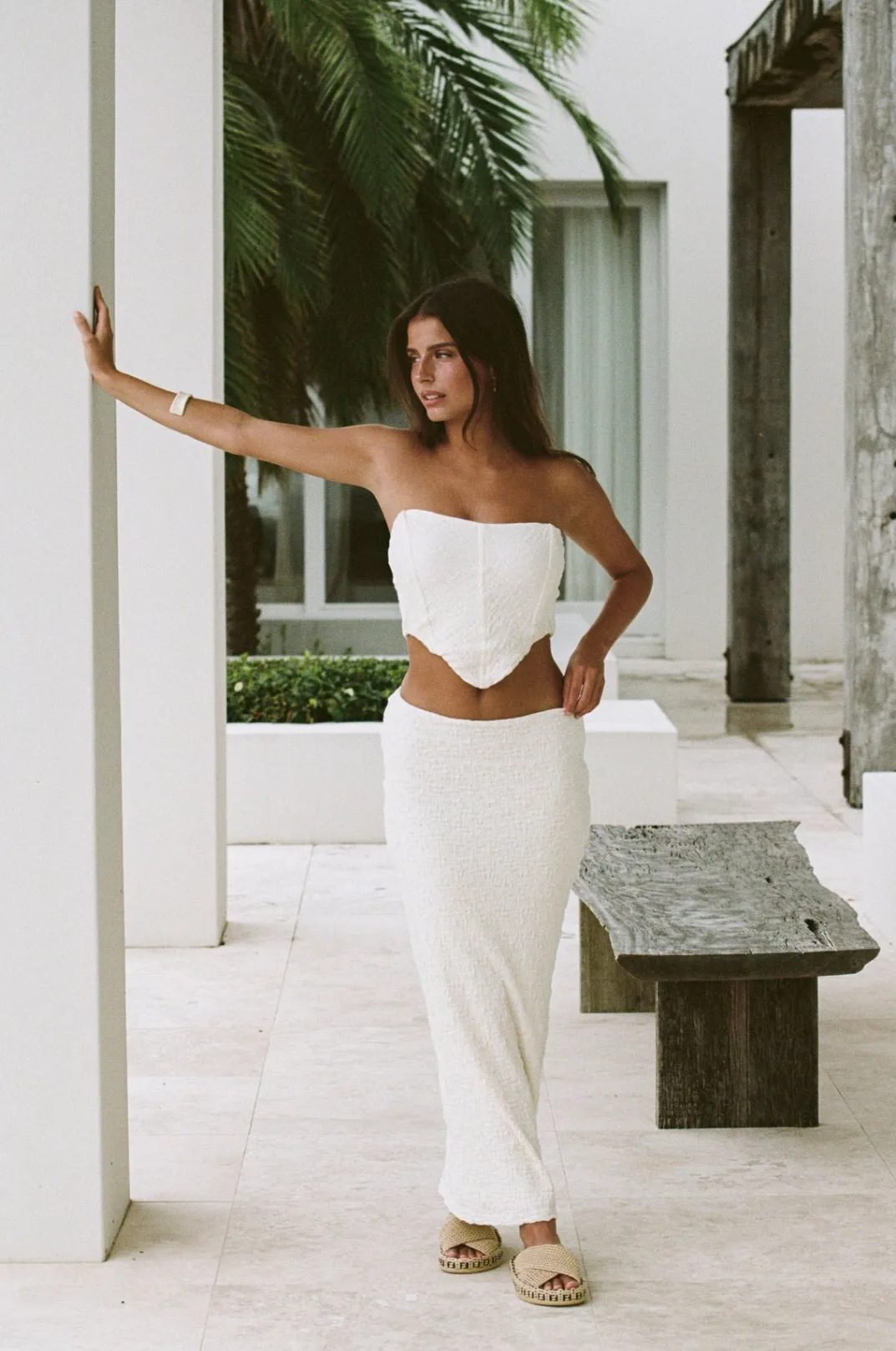 Wear It As A Set Or Pair It Back With Jeans! Theradhi Top Is Made From A Stretchy Crinkle Fabric In A Cream Hue. It Is A Strapless Style Featuring A Straight Neckline, Boning For Added Structural Support And A Curved Hem. Get The Set With Theradhi Midi Skirt Or Keep It Casual And Pair With Jeans! Designed Exclusively By Sabo.