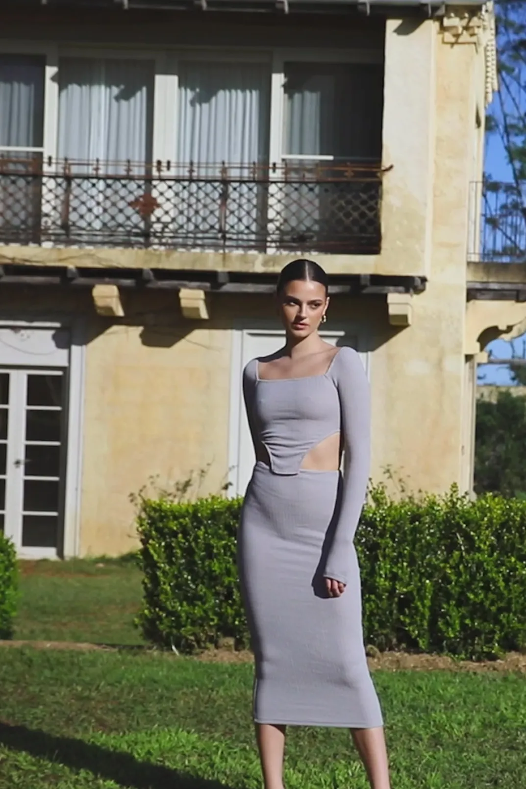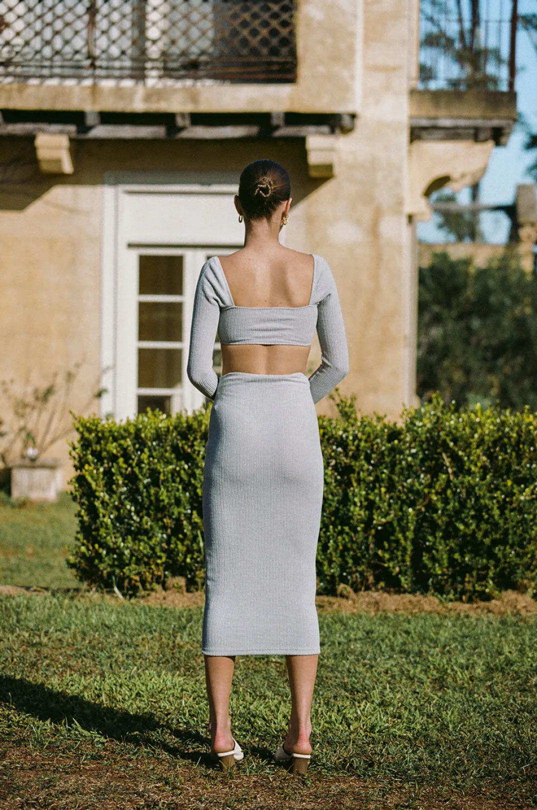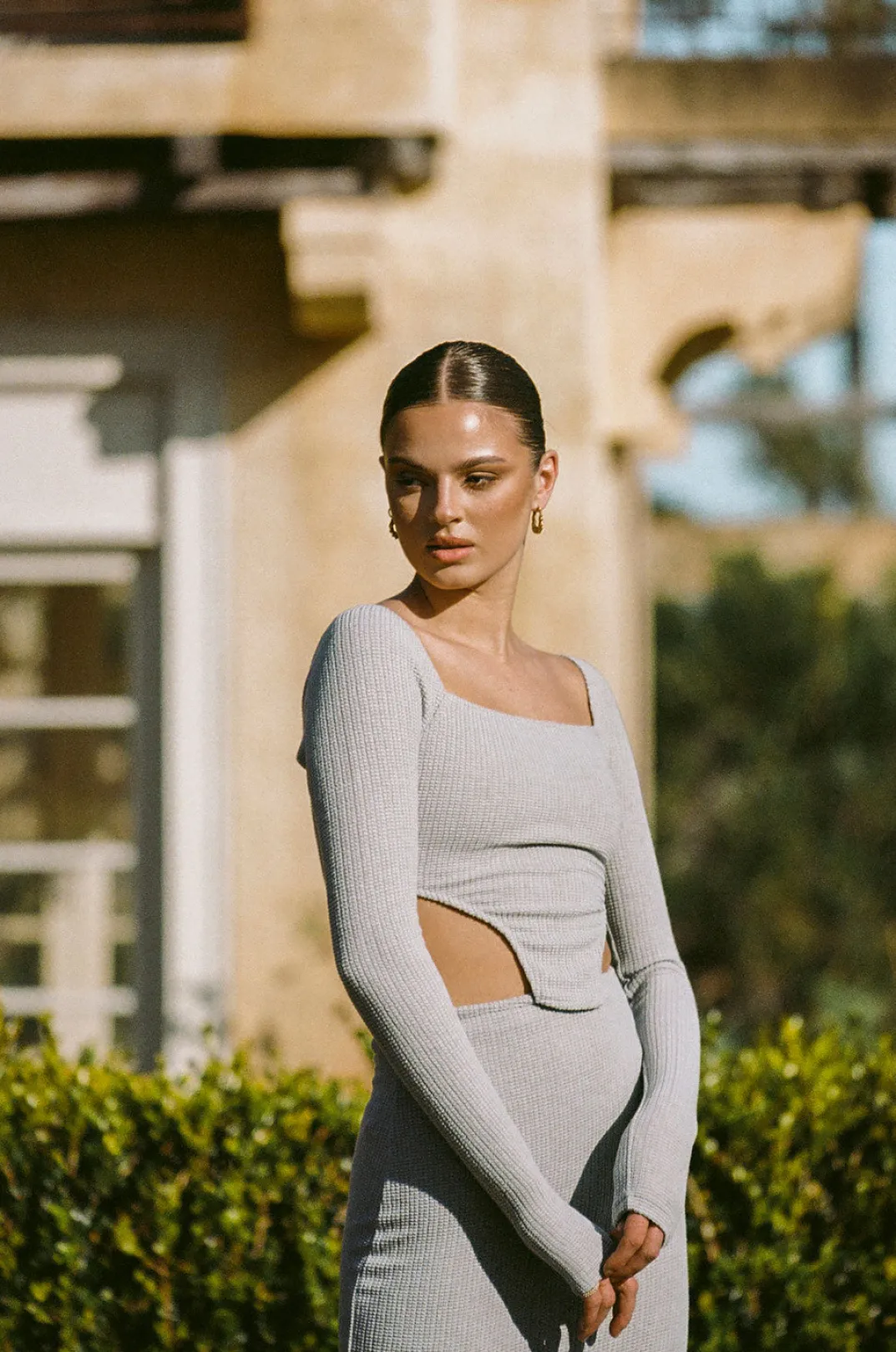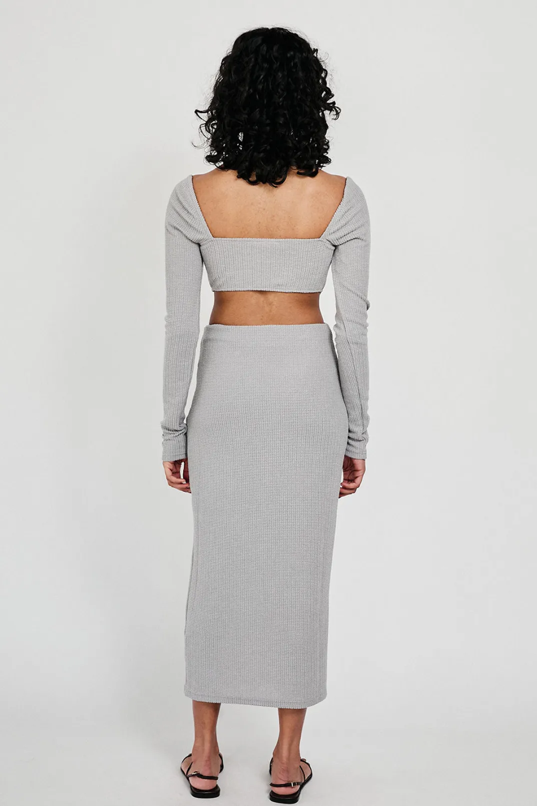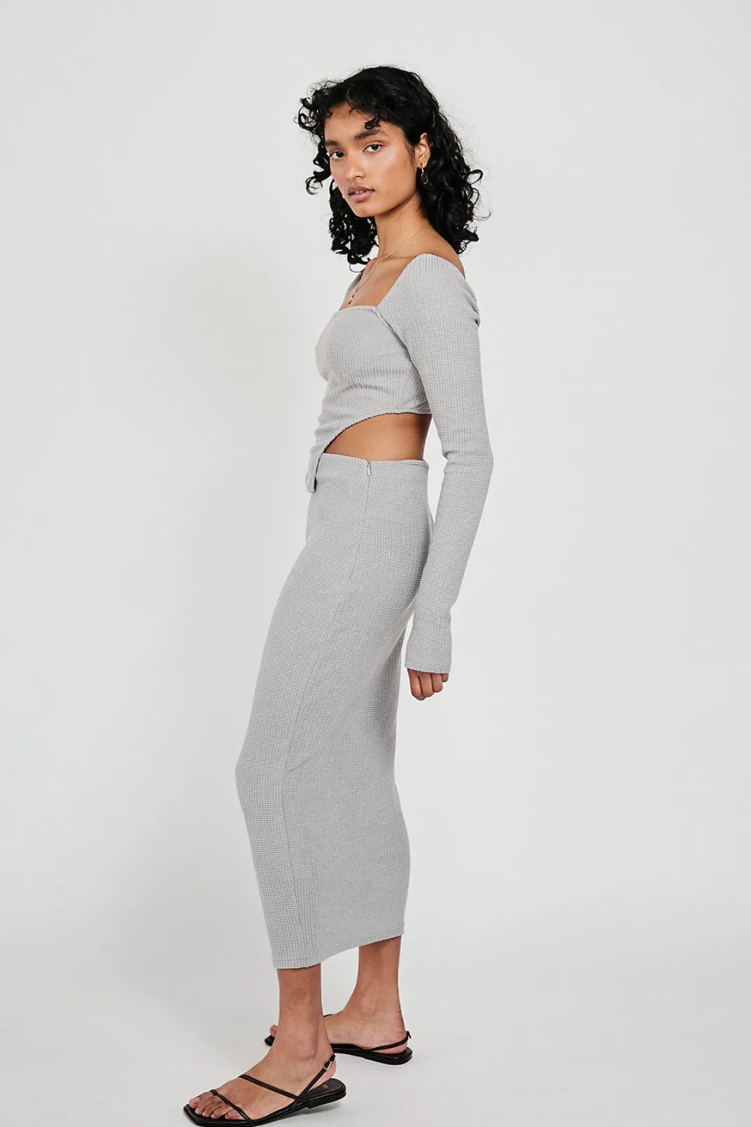 *This Is A Final Sale Item* A Stylish Set For The Cooler Weather! The Rakell Top Is Made From A Textured Fabric In A Slate Hue. It Is A Fitted Style Featuring A Square Neckline, Full Length Sleeves And An Edgy Curved Hem. Complete The Look With The Rakell Midi Skirt Or Pair It With Jeans! Designed Exclusively By Sabo.