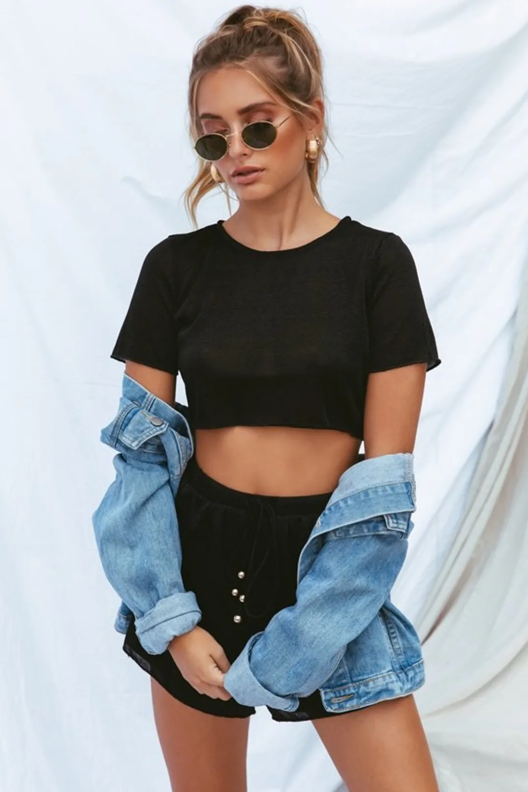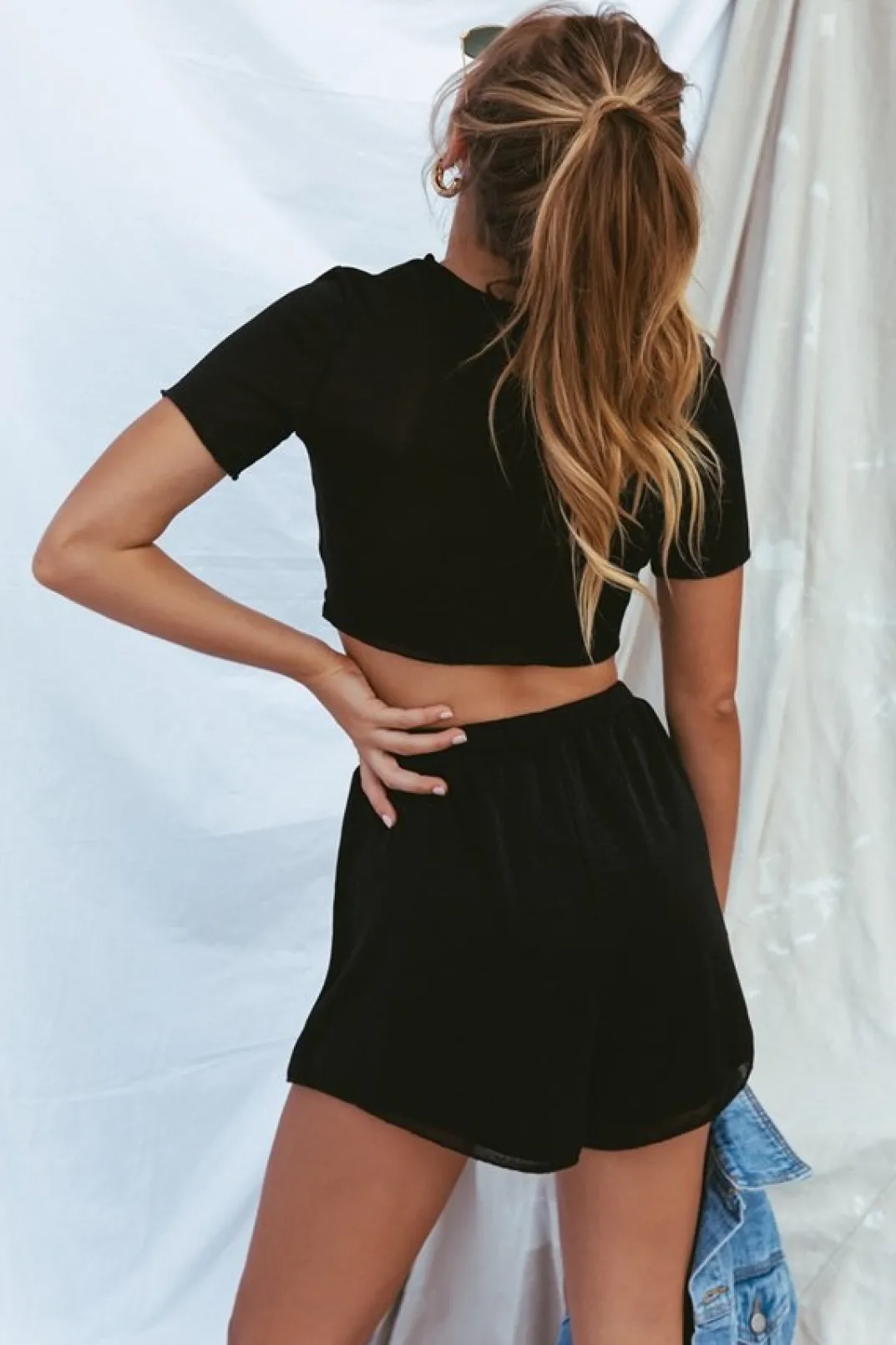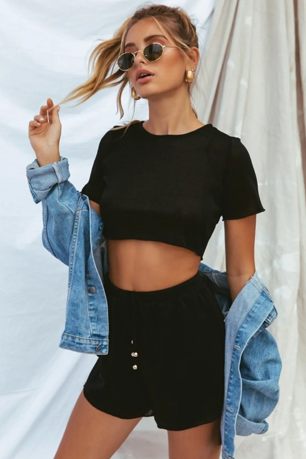 **This Is A Final Sale Item**A Basic Top In A Sassy Fabric! The Riva Top Is Made From A Lightweight Black Fabric With A Metallic Speck Throughout. It Is A Cropped Style And Features Short Sleeves And A Rounded Neckline. Pair With The Riva Shorts And Twin Satchel Bag! By Sabo Skirt.