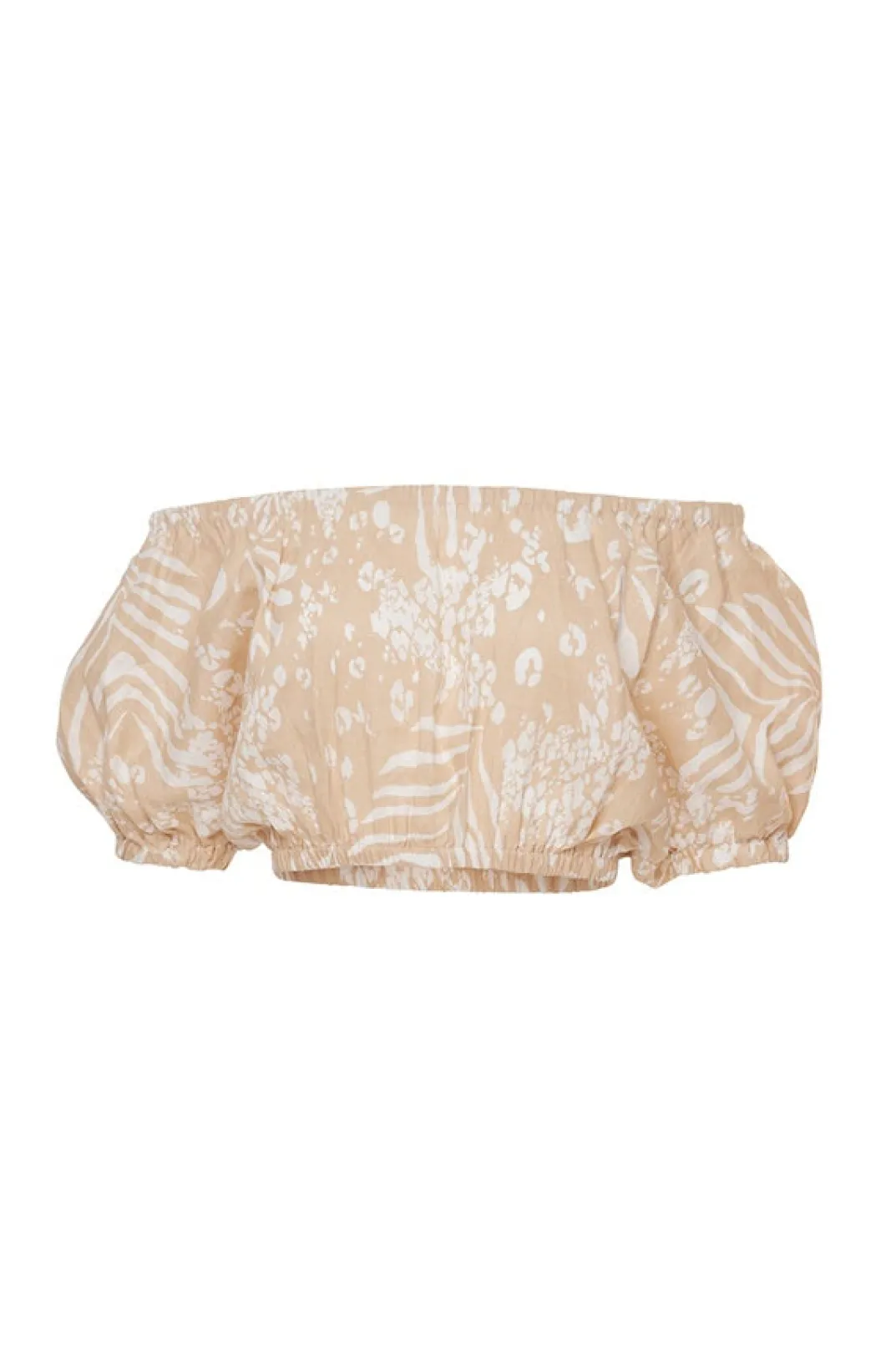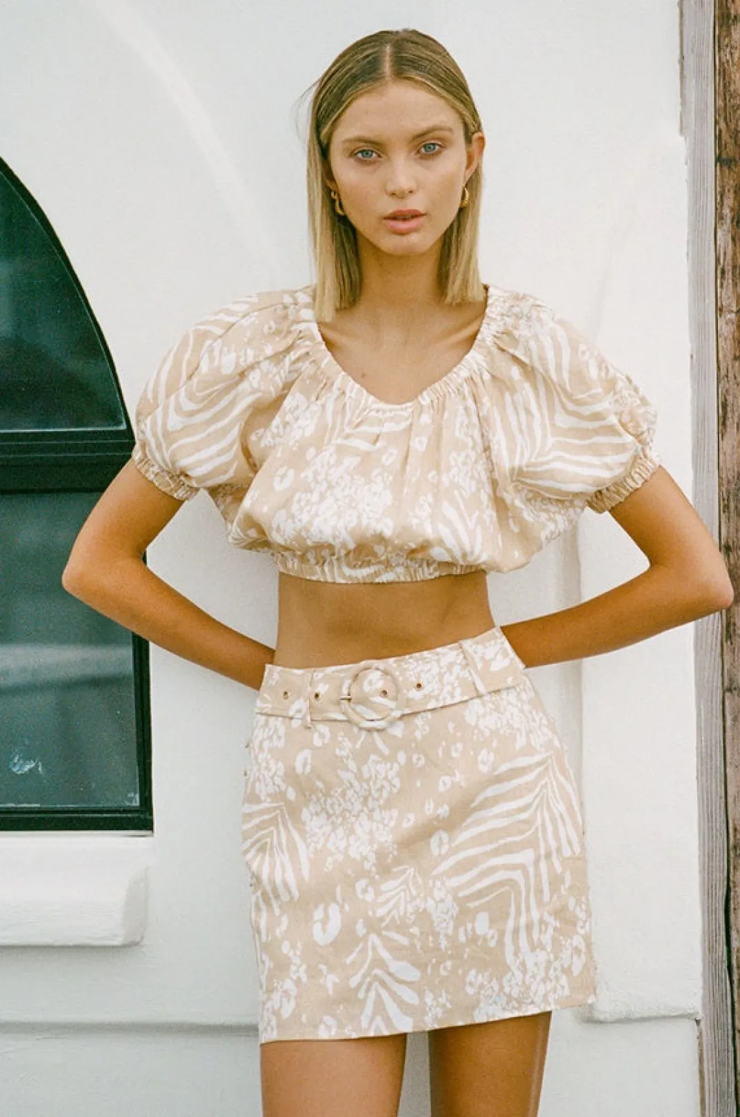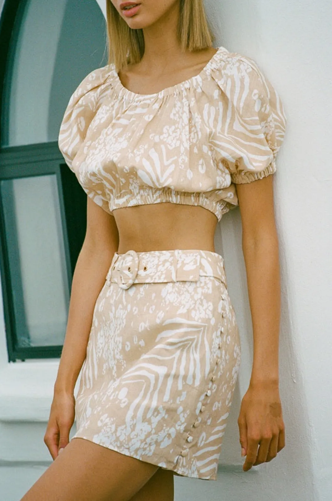 *This Is A Final Sale Item* Inspired By Moonlit Vacation Nights With Friends, The Sakura Linen Top Is Made From A High Quality Natural Linen Fabric With Our Exclusive Animal Print. It Is A Cropped Style Featuring Elastic Detailing At Neckline, Waist And Cuffs Of Sleeves And Relaxed Flouncy Fit. Get The Look With The Sakura Linen Skirt! Designed Exclusively By Sabo.