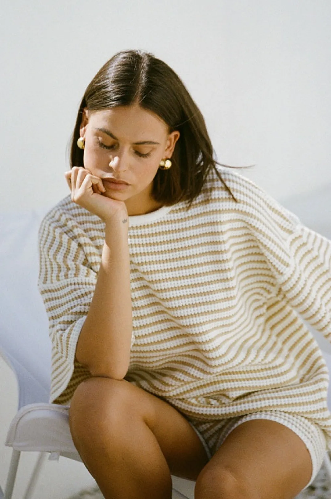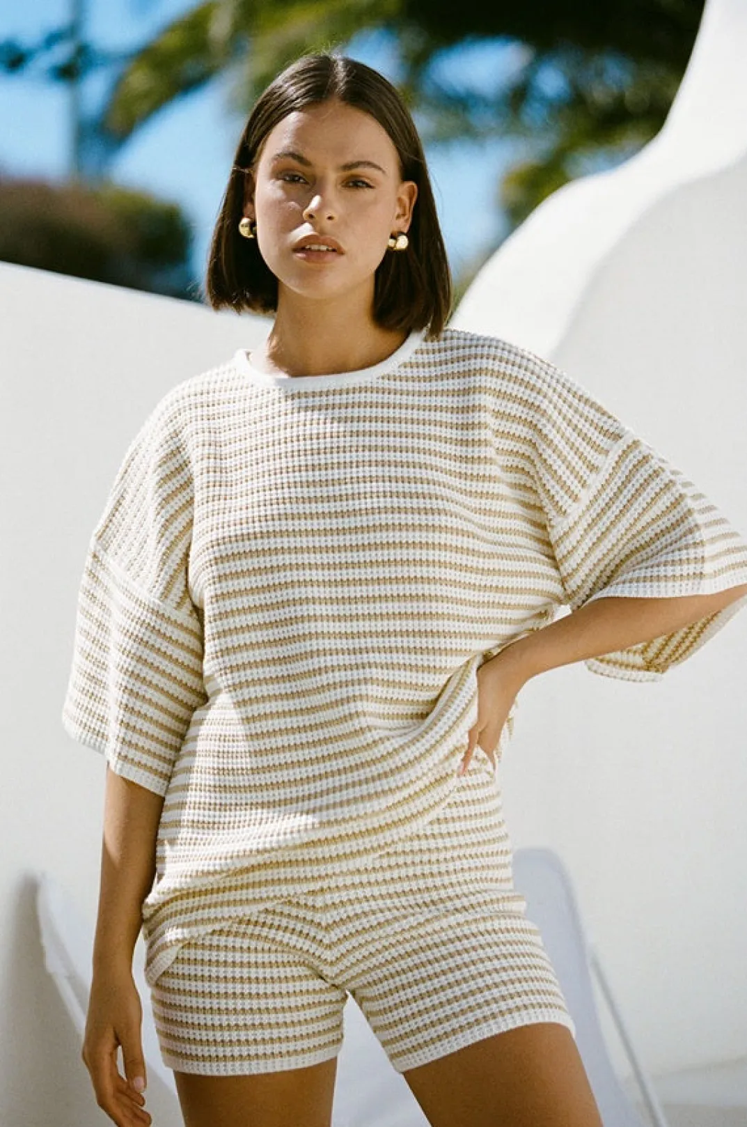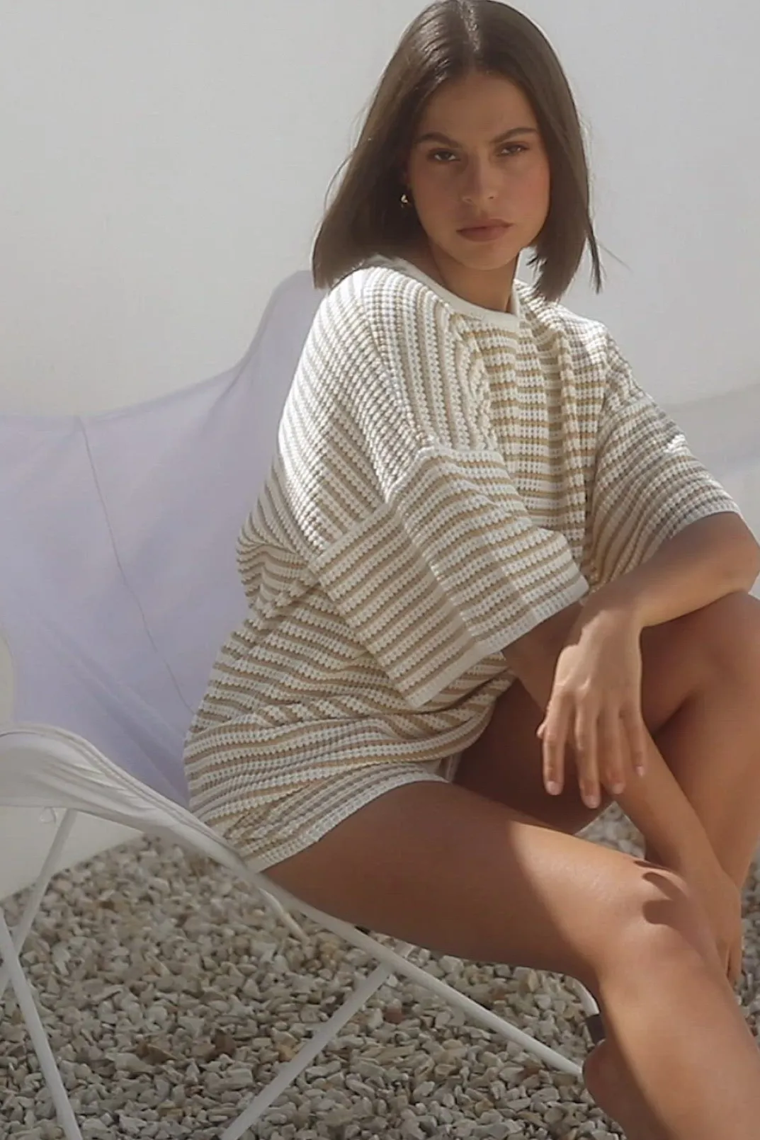 *This Is A Final Sale Item* A Basic Relaxed Shape In A Cosy Fabric! The Samia Top Is Made From A Soft Knit With Cream And Tan Stripes And Features A Roundned Neckline With Contrast Cream Bind, 1/2 Length Sleeves And A Relaxed Fit. Get The Look With The Samia Shorts And Net Bucket Bag! Exclusively Designed By Sabo.