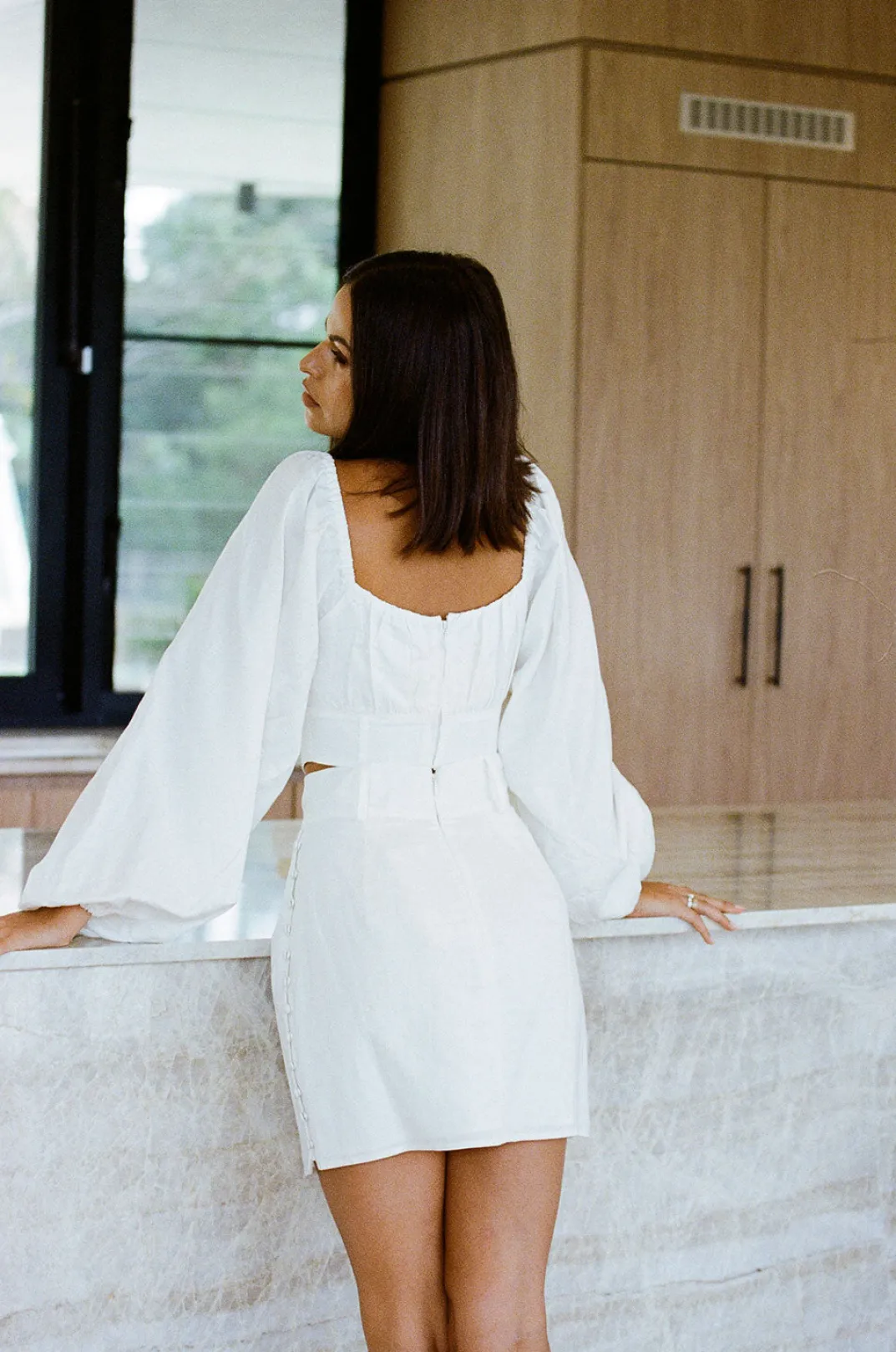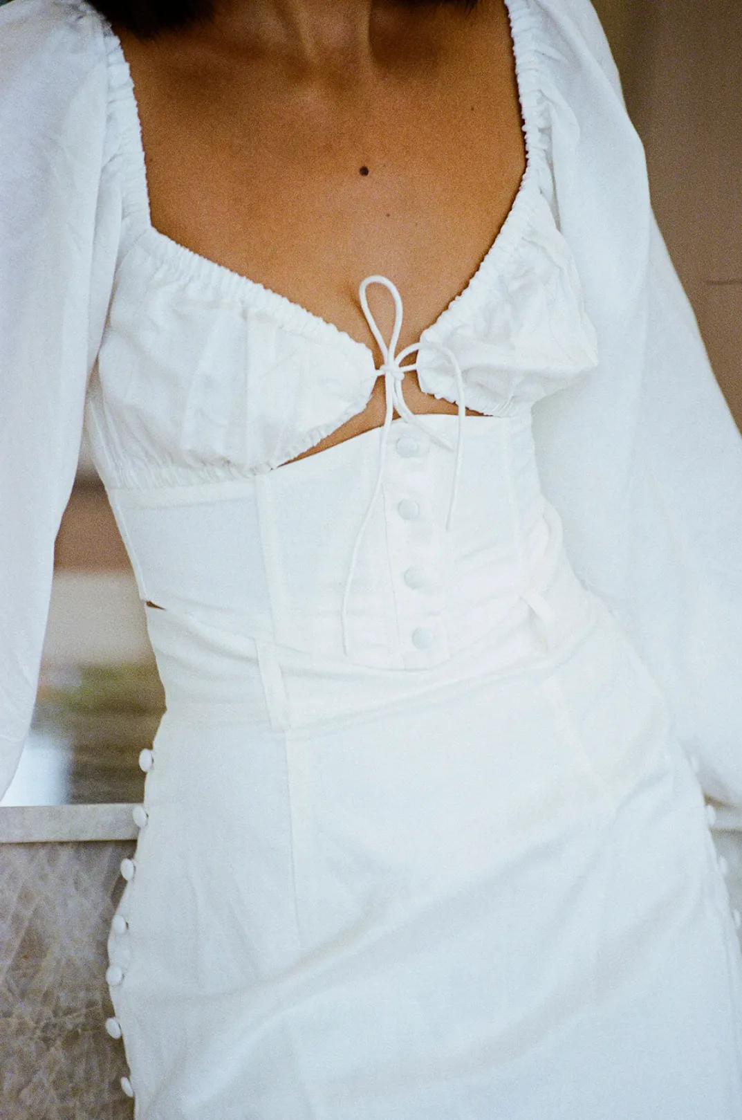 *This Is A Final Sale Item* Dress It Up And Wear It As A Set Or Pair It Back With Jeans! The Santana Top Is Made From A Structured Linen Cotton Blend Fabric In An Off White. It Features Long Puff Sleeves, Elasticated Bust With Tie Closure, Cutout At Waist And Corset Waist With Covered Buttons Down Centre Front. Get The Look With The Santana Skirt! Designed Exclusively By Sabo.