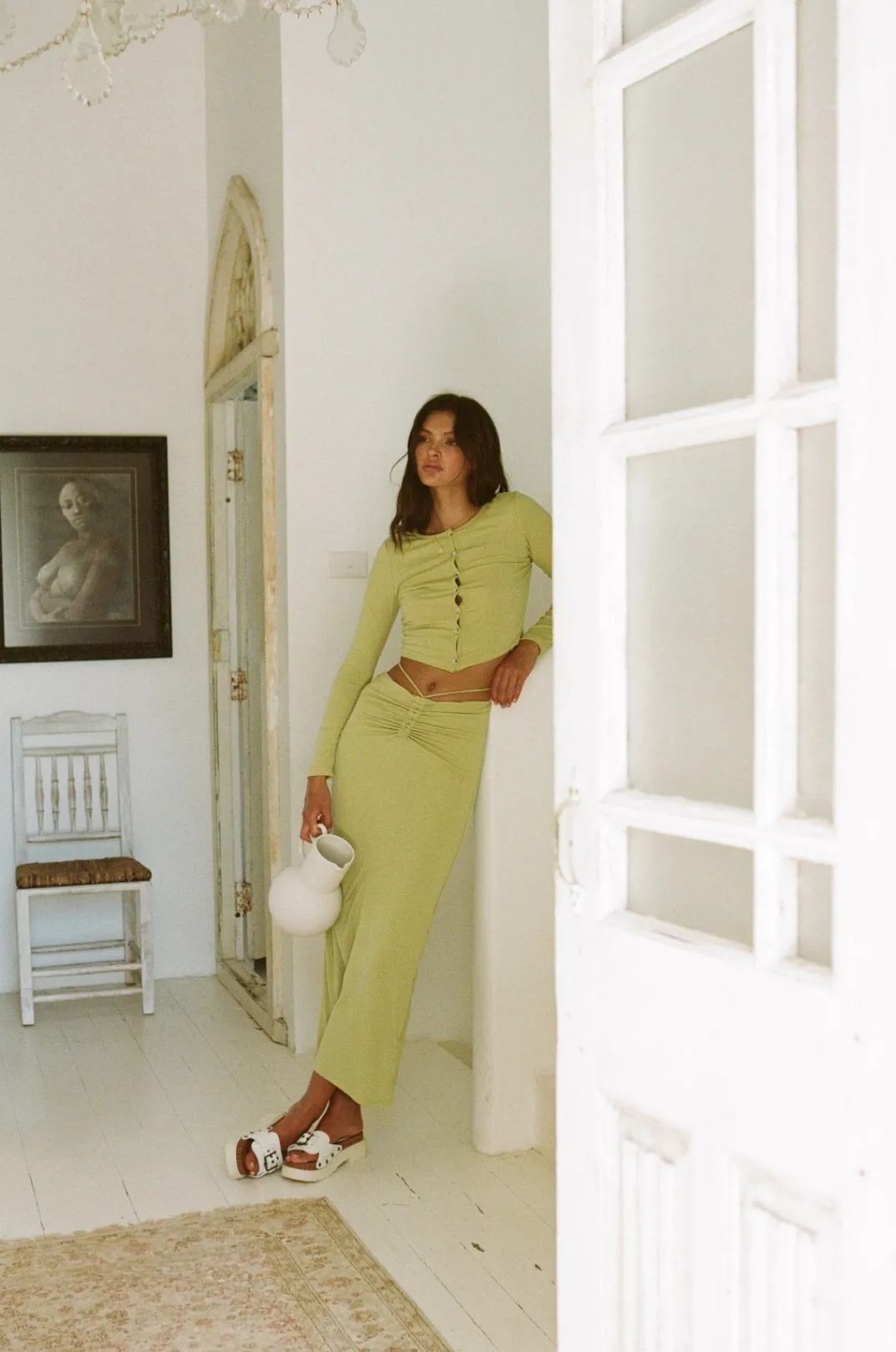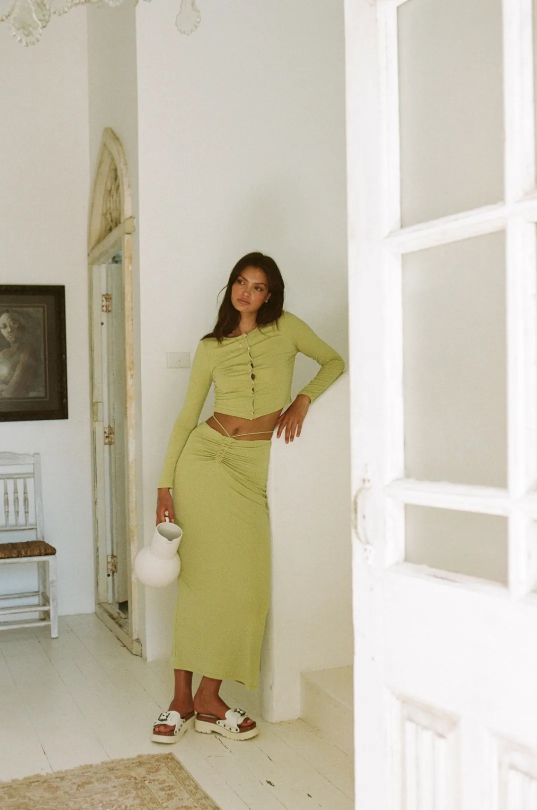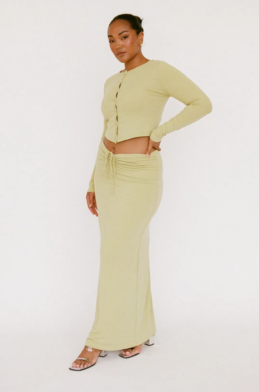 *This Is A Final Sale Item And Cannot Be Returned. See Our Returns Policy Here Designed To Flatter! The Sheniah Skirt Is Made From A Soft Jersey Fabric In A Creamy Green Hue. It Is A High Waisted Style Featuring A Draw Detail And Tie At Waist. Get The Set With The Sheniah Top! Designed Exclusively By Sabo.